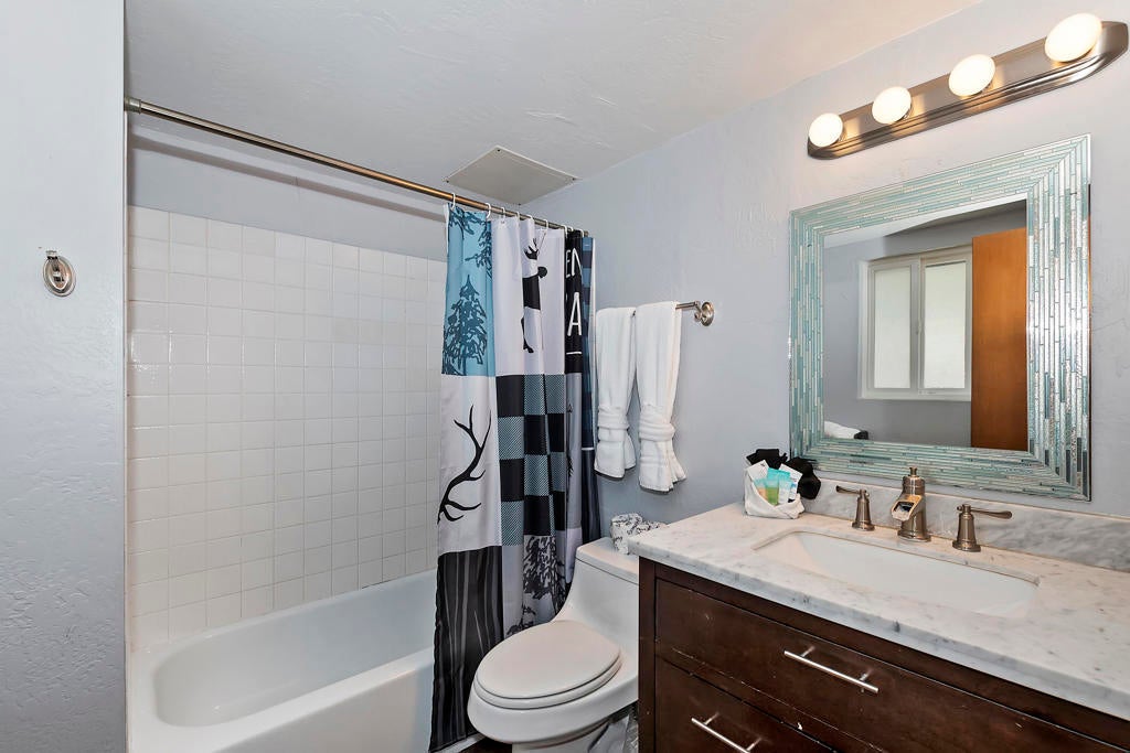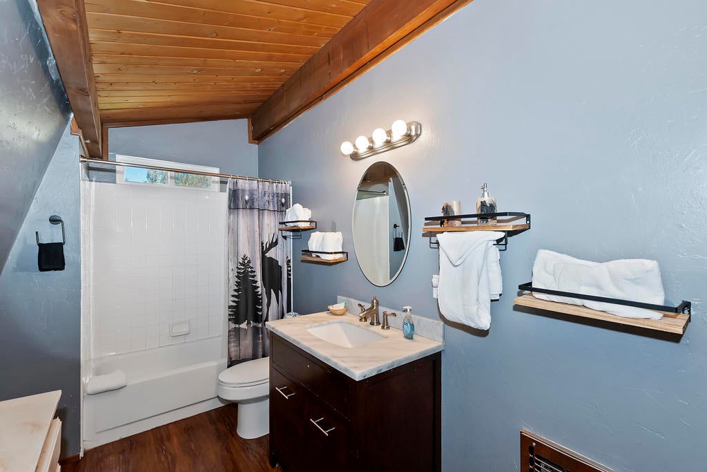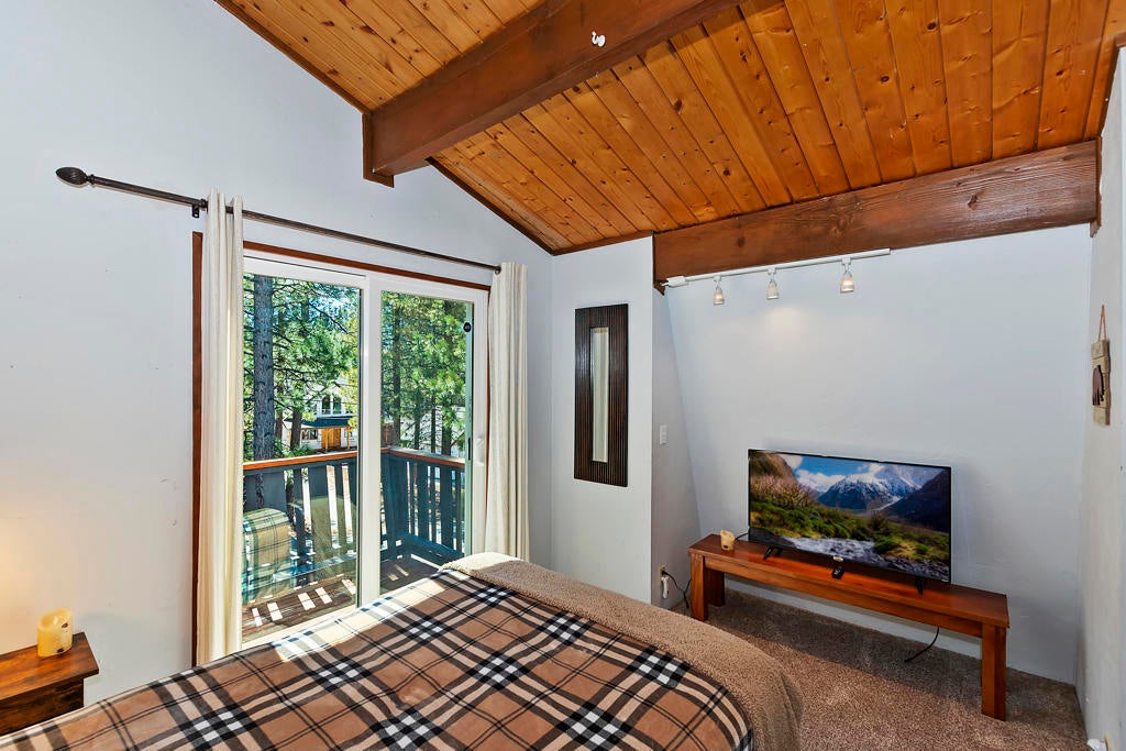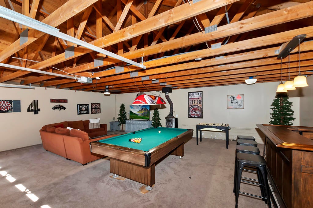 Escape to the pines! This 3-bedroom, 2-bath mountain retreat perfectly balances rustic character with modern updates. Located just a stone's throw from The Village, Big Bear Lake, and National Forest trailheads, the location is unbeatable for year-round adventure. The interior features an open-concept living space anchored by a classic stone fireplace and an updated kitchen with sleek countertops and bar seating. The real showstopper is the expansive, fenced backyard--a quite oasis featuring a multi-level deck, string lighting, a fire pit, and a horseshoe pit. The converted garage serves as a massive game room with a bar, pool table, and foosball, offering the ultimate entertainment space. Complete with a three-car driveway (RV/Boat parking included!) and a charming front porch swing, this cabin isthe quintessential Big Bear getaway.