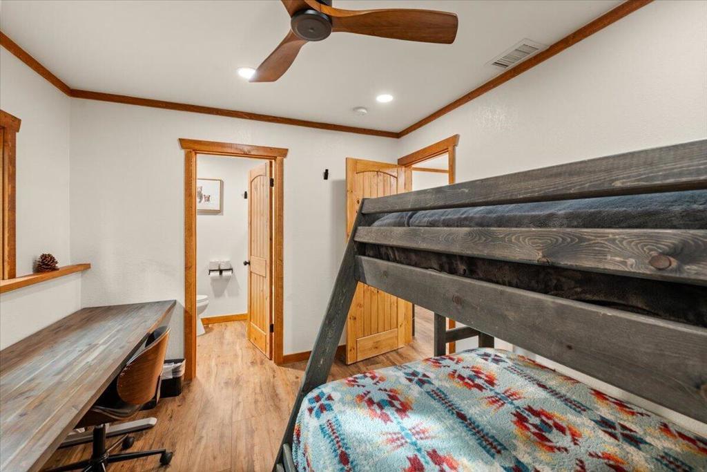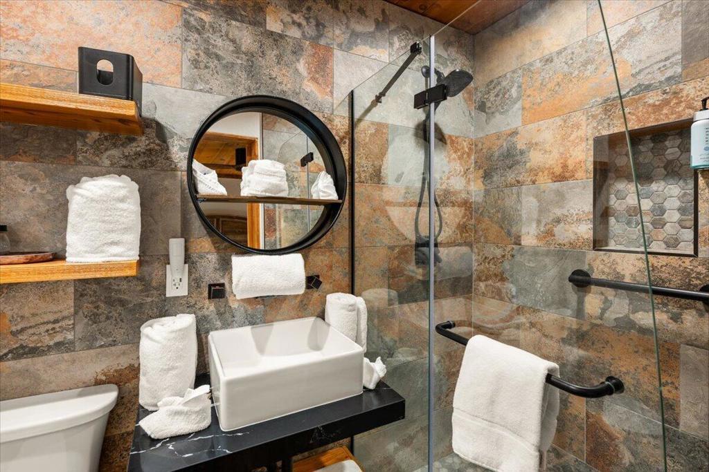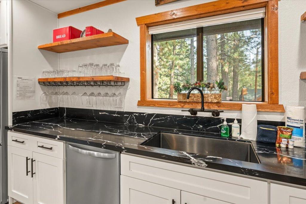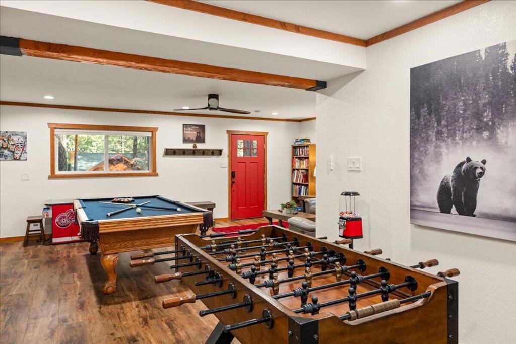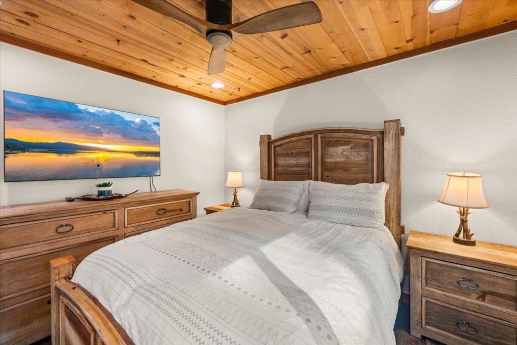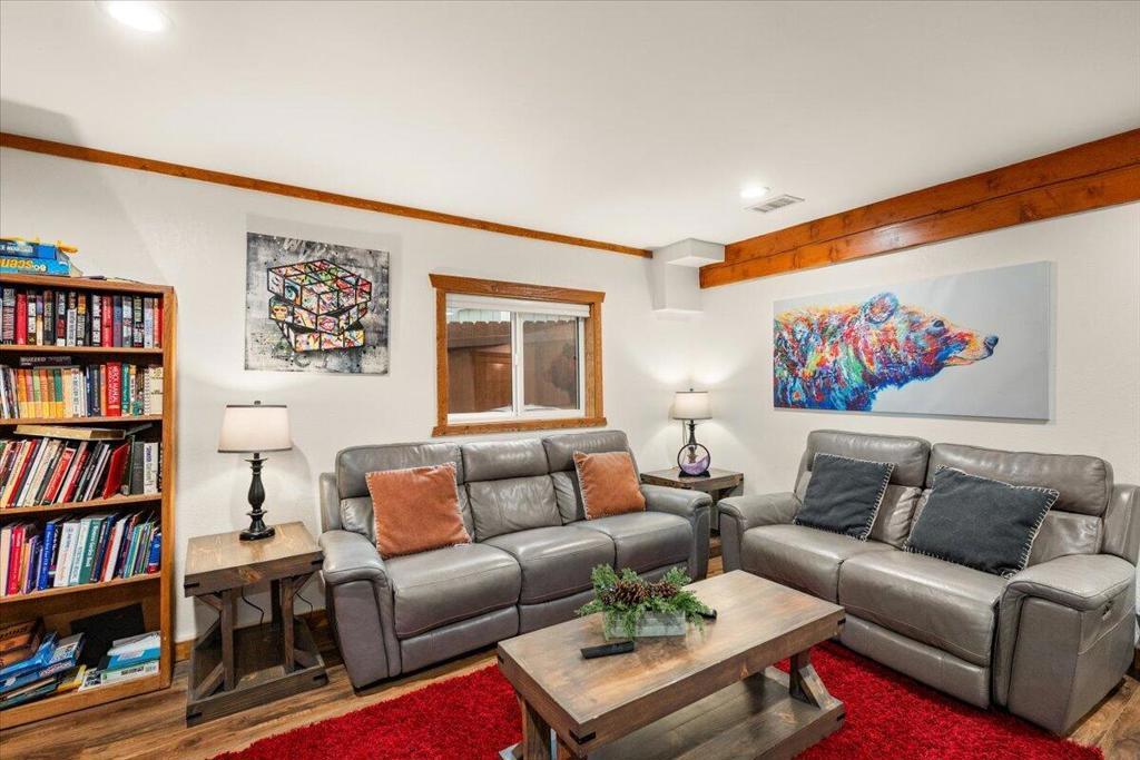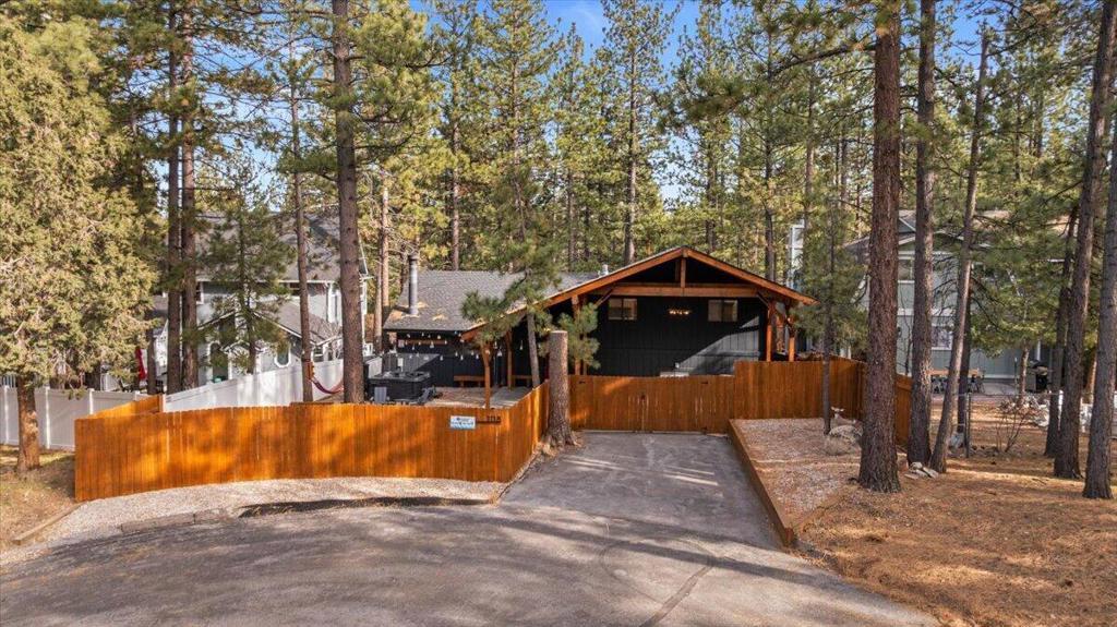 Welcome to Elmwood Place, a beautifully updated mountain retreat on Big Bear's desirable east side. Remodeled in 2023, this turnkey home blends modern upgrades with classic mountain charm. The renovation includes a brand-new kitchen and all 3.5 bathrooms, offering style, comfort, and peace of mind. Situated on a spacious, fully fenced, tree-lined lot in a quiet neighborhood, the property is ideal as a full-time residence, second home, or income-producing short-term rental. Enjoy being just minutes from ski resorts, the marina, and the Village's dining, shopping, and entertainment. The main living level showcases warm pine-beamed ceilings, charming mountain accents, and abundant natural light. The inviting living room centers around a cozy wood-burning fireplace and opens to a comfortable gathering space for relaxing or entertaining. The newly remodeled kitchen features modern finishes, updated appliances, generous cabinetry, and ample counter space, flowing seamlessly into the dining area designed for hosting family and friends. Sliding doors lead to a sundeck with outdoor seating and BBQ--for enjoying Big Bear's fresh mountain air. Upstairs are four comfortable bedrooms and two beautifully updated bathrooms, thoughtfully designed for privacy and functionality. The lower level adds valuable bonus space with a separate lounge and game room, for entertaining. A dedicated laundry room with washer and dryer and a newly remodeled half bath provide added convenience. With its 2023 renovation, modern upgrades, flexible floor plan, and prime location, Elmwood Place offers a rare opportunity to own a truly move-in-ready Big Bear mountainhome.