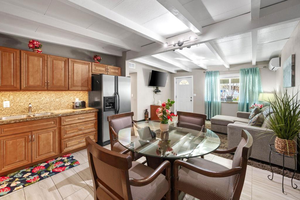 Beautifully remodeled and highly versatile desert property offering a total of 4 bedrooms and 2 full bathrooms, including a 3-bedroom main residence plus a private attached casita/studio. This is not your typical single-family home -- it is a rare opportunity that combines comfortable living with built-in income potential.The flexible layout creates multiple possibilities. The attached casita is ideal as a private guest suite, in-law quarters, extended family living space, or an income-producing rental. Owners can live in the main residence while renting the casita, live in the casita and rent the main home, or maximize the property as a full investment property.The home was remodeled a few years ago and features tile flooring throughout. Custom wood cabinetry and granite countertops are featured in the main house kitchen, the bathrooms, and the casita, creating a cohesive and upgraded look throughout the living spaces.The property is being offered fully furnished and is already equipped and arranged for short-term rental use, creating a true turn-key opportunity for buyers seeking immediate income potential.Recent exterior upgrades further enhance the property, including newly completed fencing surrounding the property, updated stonework, creating a clean and updated outdoor setting ready for relaxing or entertaining.Ideally located just minutes from everyday conveniences, the home is a short drive from major shopping centers including Costco, Walmart, Sam's Club, grocery stores, restaurants, and numerous retail and dining options, offering both comfort and convenience for residents and guests alike.Additional highlights include NO HOA and low property taxes -- a rare combination that adds long-term value and makes the property especially attractive for both homeowners and investors.This unique desert property offers flexibility, privacy, convenience, and income potential all in one.