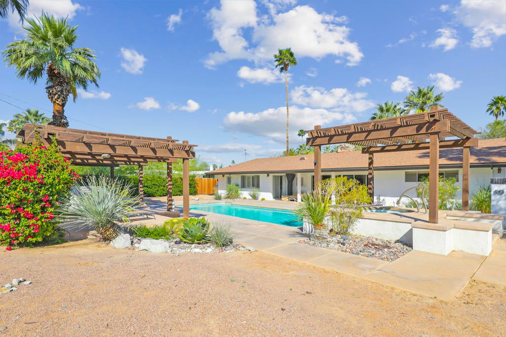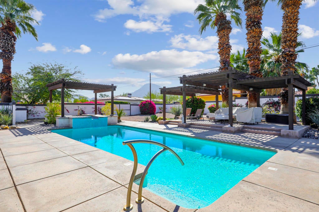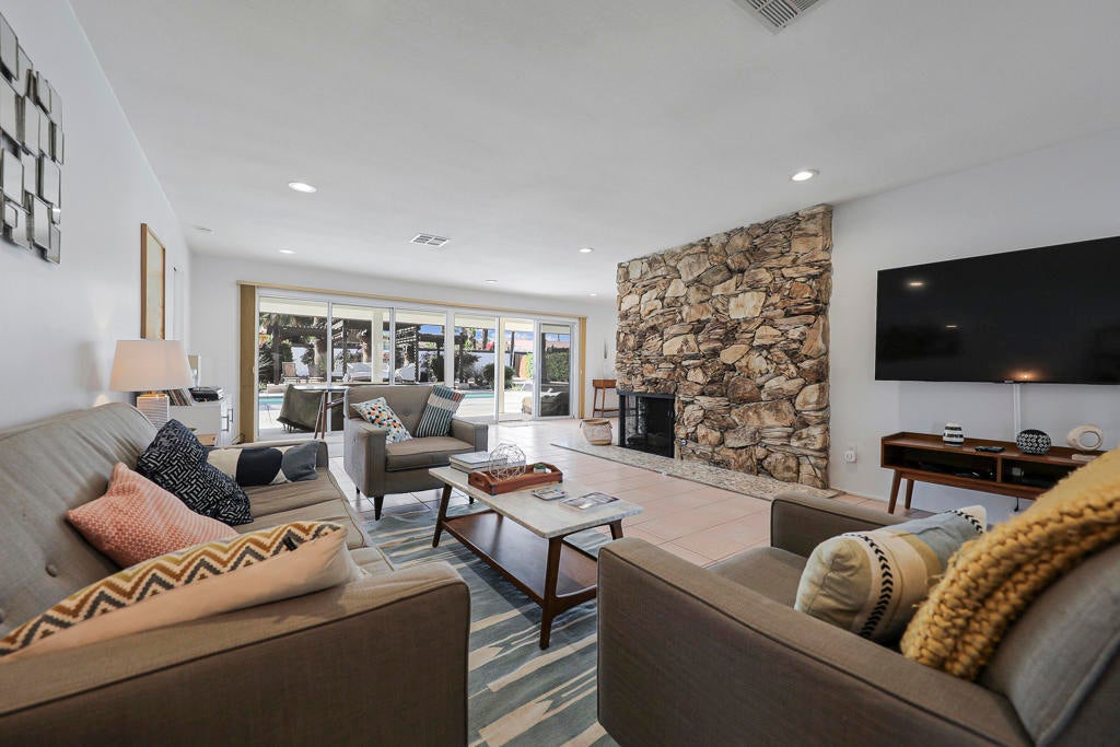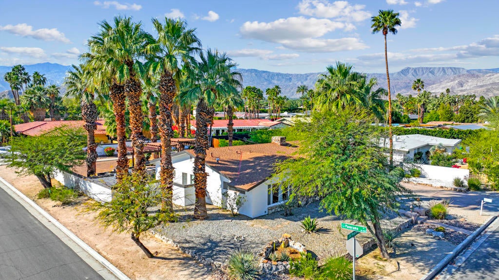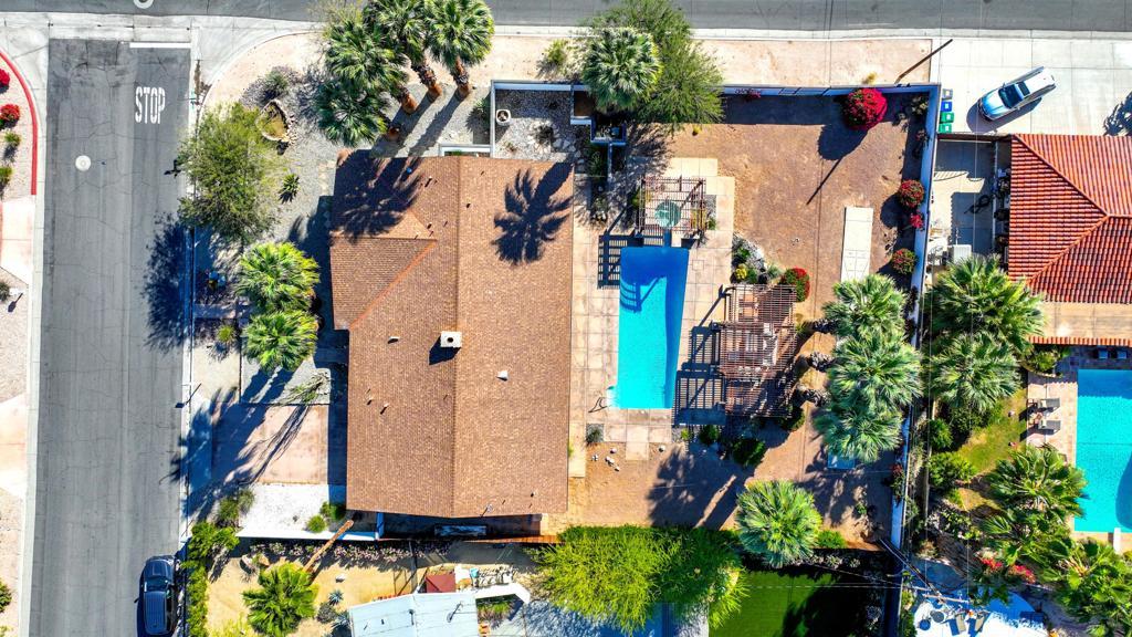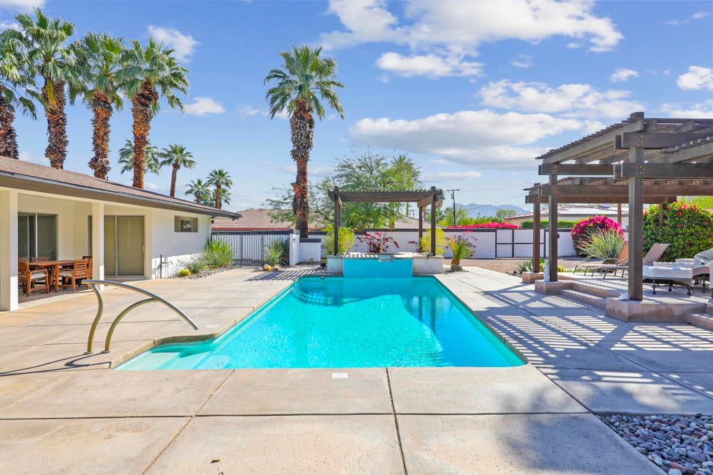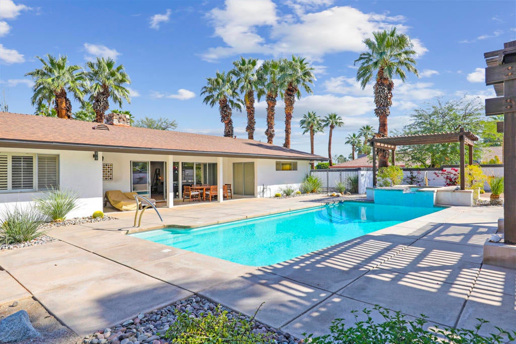 This one checks ALL the boxes!!! Prime location in sought-after prestigious neighborhood of SOUTH PALM DESERT! This spacious Mid-Century Modern 3-bedroom 3-bathroom ( all with walk in closets) is on a large 14520 square foot (1/3 acre).lot. Beautifully maintained by the discerning homeowner, retaining the originality of yesteryear, the 2,156 square-foot home is conveniently located near El Paseo with its fine-dining options and shopping, It boasts spectacular views from the large patio-shaded backyard outdoor living area, with backyard access from the dual master bedrooms. Not to be missed is the picturesque full-size slider window in the living room, with unobstructed Southerly views and the renovated 1960's pool and waterfall spa. There is a side gate for RV parking or a potential ADU for someone looking to build on for guests aging parents, or rental income. All three bedrooms have ensuite bathrooms and expansive walk-in closets. The stacked rock fireplace and sunken tubs is a time capsule for architects like Burns, Meiselman and Wexler in the 1960.s. The back yard and pool area is exactly what the desert lifestyle is all about!!! NO HOA , easy to show!!