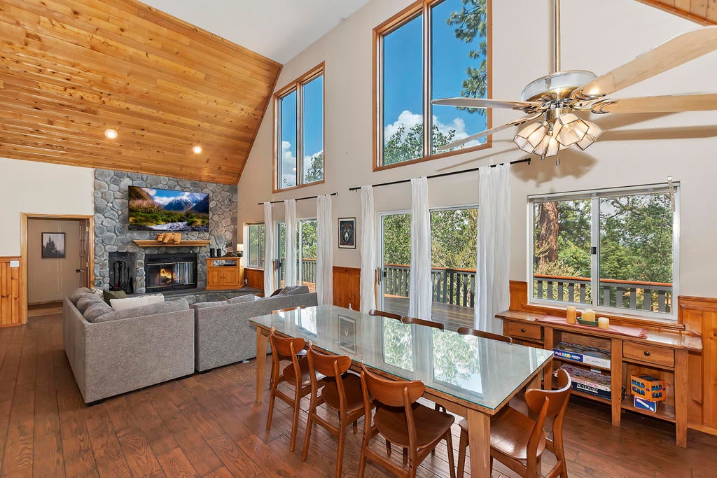 What A View! The Wall Of Windows To Back Deck With Views Of The Valley And National Forest Is What Big Bear Is All About. This Moonridge Beauty Is Boasting A Spacious Great Room With Vaulted Ceilings And Wood Burning Fireplace With Impressive River Rock Surround Where Everyone Can Be Together. Kitchen Has A Generous Amount Of Storage And Counter Space. The Large Back Deck Has A Hot Tub And The Nice Sized Backyard Has Plenty Of Room And A Horseshoe Pit. Upstairs Has A Loft Area For A Morning Cuppa With The View Out Of The 2-Story Windows. Downstairs Has 2 Bedrooms And A Full Bath And Upstairs Has 2 More Bedrooms With Another Full Bath. Direct Access Garage With Level Driveway On The Sunny Side Of The Street Makes For Easier Snow Melt. The Bonus Room Over The Garage Is An Incredible Space With Many Opportunities. Hiking Trails Right Down The Street, About 2 Miles To Bear Mountain Ski Resort, Golf Course, Alpine Zoo. About 3 Miles To The Shore Of Big Bear Lake. Has Been A Vacation Rental, Income Possibilities!