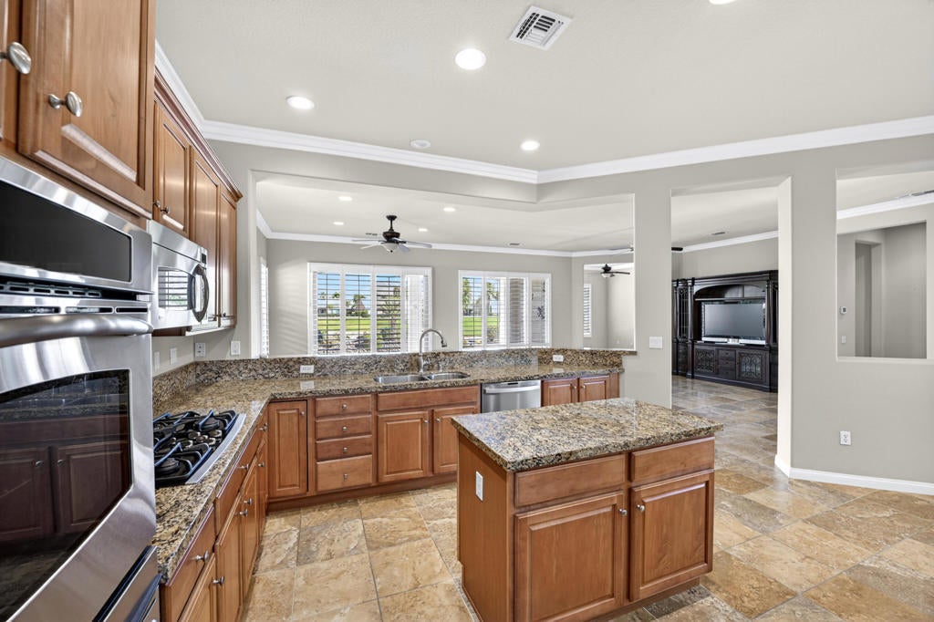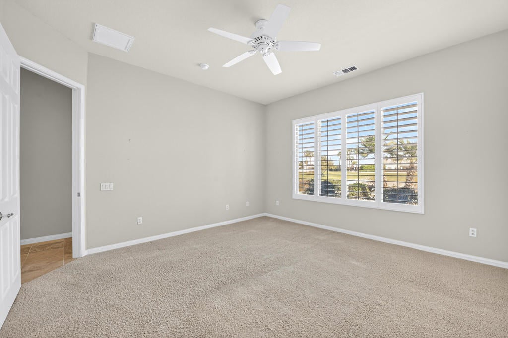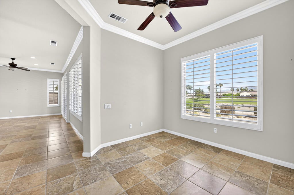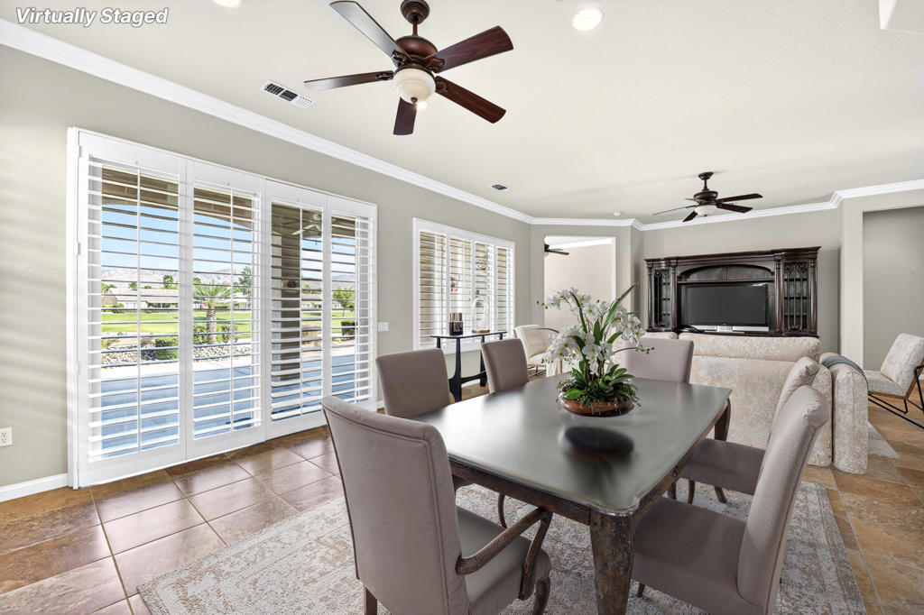 Welcome to this beautifully positioned Madera floor plan in the highly sought-after 55+ community of Sun City Shadow Hills. Perfectly situated on the 3rd tee with desirable northern exposure, this 2 bedroom plus den, 2 bathroom home captures serene golf course views, tranquil water features, and breathtaking mountain backdrops--offering the ultimate desert lifestyle. Spanning 1,854 square feet, this thoughtfully designed residence sits on a 6,969 square foot lot and features an open-concept layout that seamlessly blends comfort and functionality. The expansive great room is filled with natural light and flows effortlessly into the kitchen and dining areas, enhanced by elegant crown molding that adds a refined architectural touch--creating an ideal space for both everyday living and entertaining. The kitchen is well-appointed with granite slab countertops, rich cabinetry, stainless steel appliances, and a center island, providing both style and practicality. The primary suite offers a peaceful retreat with ample space, while the ensuite bath features dual vanities, a soaking tub, and a separate shower. Step outside to your extended covered patio, where you can relax or entertain while taking in the lush fairway, sparkling lake, and picturesque mountain views. The low-maintenance desert landscaping enhances the home's curb appeal while allowing you to fully enjoy the outdoor setting. Additional highlights include a spacious 2-car garage with built-in storage, plantation shutters, and pride of ownership throughout. Built in 2007, this home offers a seamless blend of quality, comfort, and location. Enjoy resort-style living in Sun City Shadow Hills with access to championship golf, clubhouses, pools, fitness centers, tennis, pickleball, and a vibrant social lifestyle--all just minutes from shopping, dining, and entertainment. Experience the best of desert living in this exceptional golf course home.