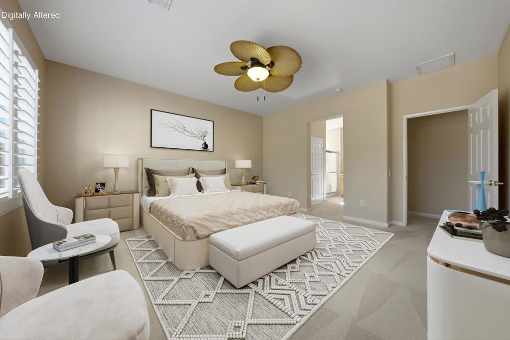 Sun City Palm Desert - St. Maarten. Located in the peaceful northern section of Sun City, a short distance to the Lakeview Recreation Center, this popular greatroom floorplan offers 2 bedrooms, 2 bathrooms, and a den. The spacious north-facing rear yard features a covered extended patio with an alumawood cover, lush landscaping including citrus, and peekaboo mountain views--perfect for relaxing or entertaining. Inside, plantation shutters are found throughout, adding both style and functionality. The spacious greatroom has a slider to the rear patio. A den sits just off the greatroom, ideal for a home office or hobby space. The kitchen features maple cabinetry, slab granite countertops and and island with a breakfast bar. The primary suite includes a media nook, a large walk-in closet, and an ensuite bath with dual sinks and a glass-enclosed stall shower. The guest bedroom also offers a walk-in closet, while the guest bath includes a shower/tub. Laundry is conveniently located inside the home. The 2 car garage provides room for ample storage.