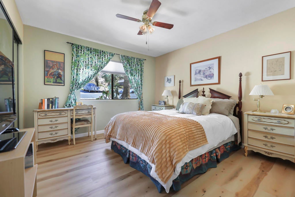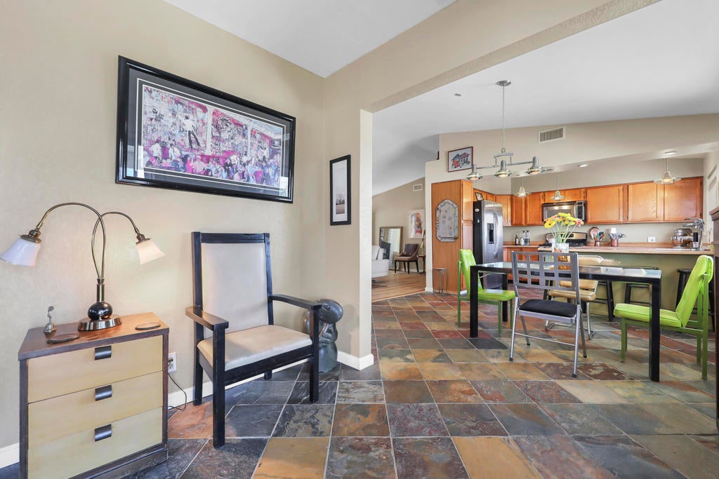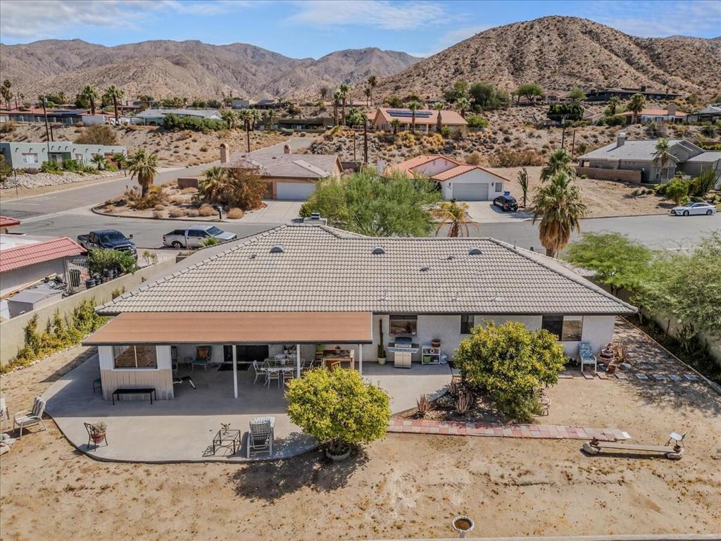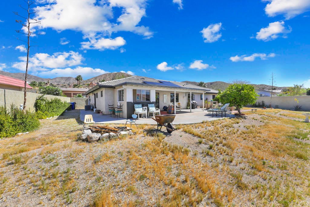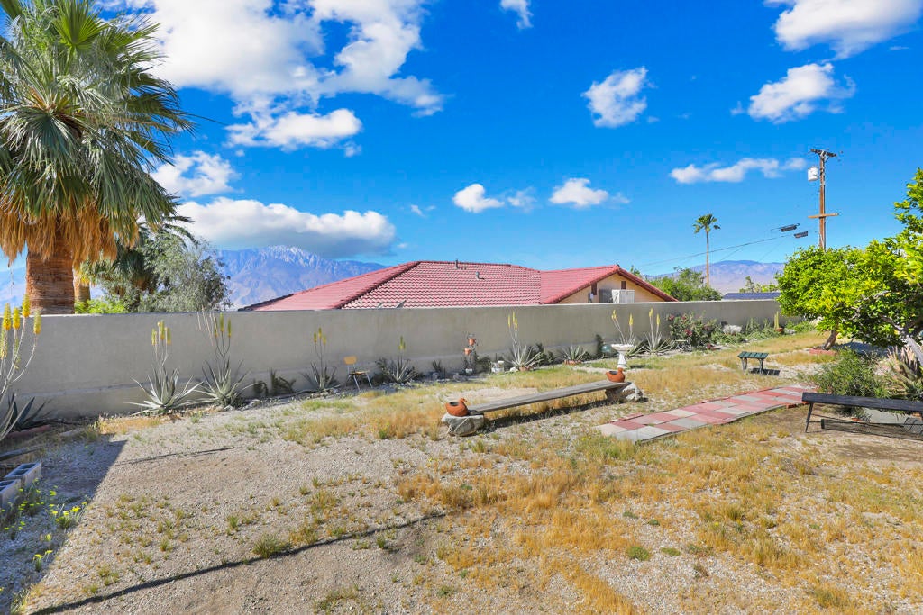 Perched above the city, this private desert retreat offers an elevated blend of serenity, style, and effortless living, framed by sweeping mountain views. Designed for both relaxation and versatility, the expansive, fully enclosed backyard presents a rare opportunity to create a custom resort setting with room for a pool and spa. With NO HOA and exceptional short-term rental or investment potential, the property is ideally positioned just minutes from Palm Springs and Joshua Tree National Park. A generous covered patio extends the living experience outdoors--perfect for entertaining or enjoying tranquil desert evenings. Inside, a thoughtfully designed layout features three bedrooms plus a den, offering flexibility for guests, work, or leisure. Slate and laminate flooring provide a cohesive, low-maintenance aesthetic throughout. The living room is anchored by a striking stacked stone fireplace, creating a warm and inviting focal point. The kitchen offers abundant cabinetry and opens to picturesque backyard and mountain vistas. The primary suite serves as a peaceful retreat and walk-in closet, while two additional bedrooms ensure comfort and privacy for guests. Bonus - owned solar. Call today to schedule your appointment to view this home.