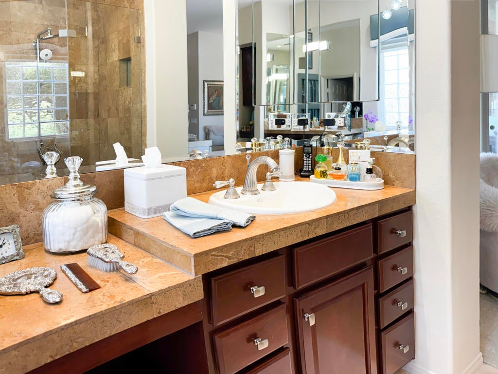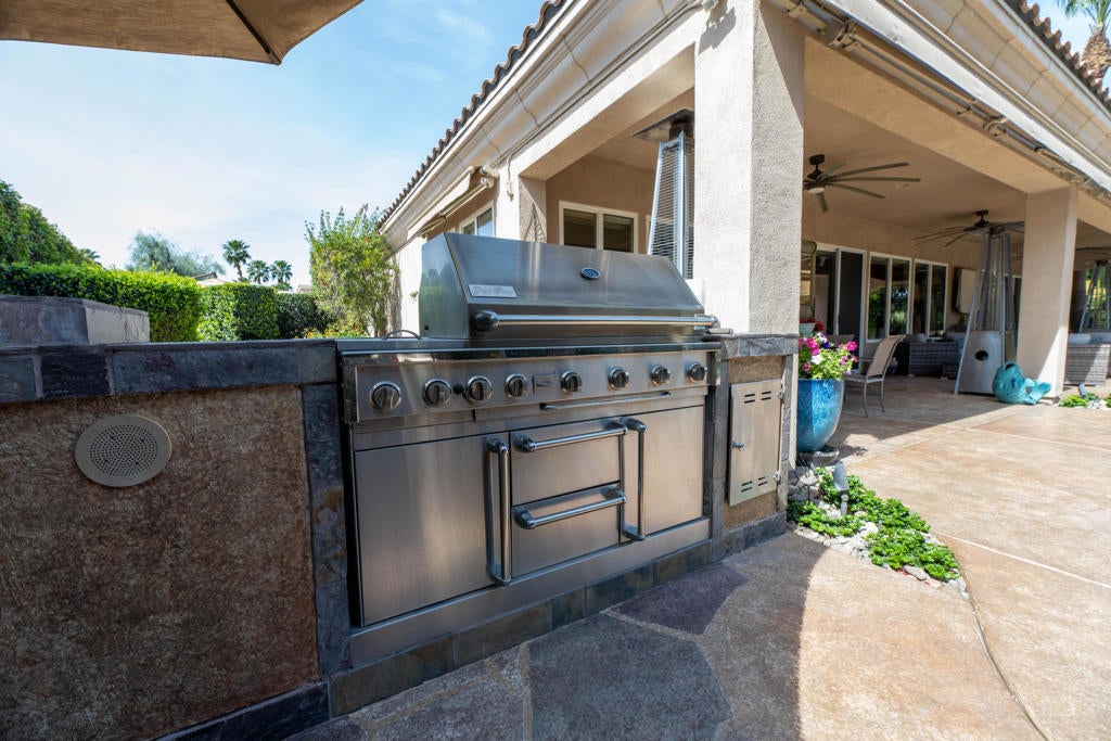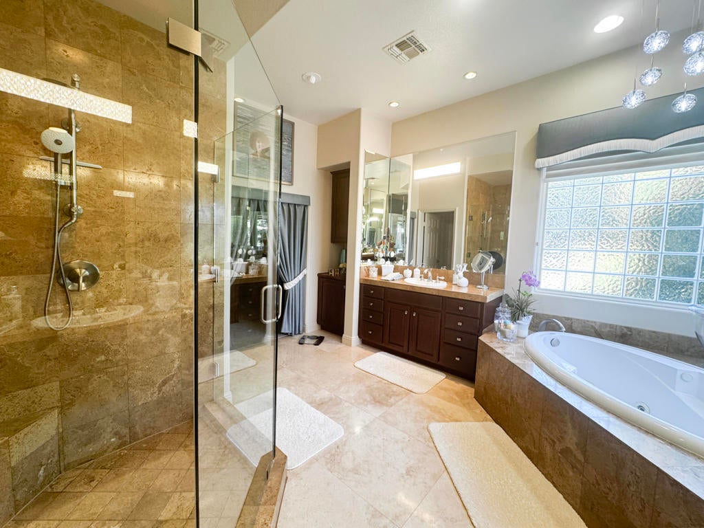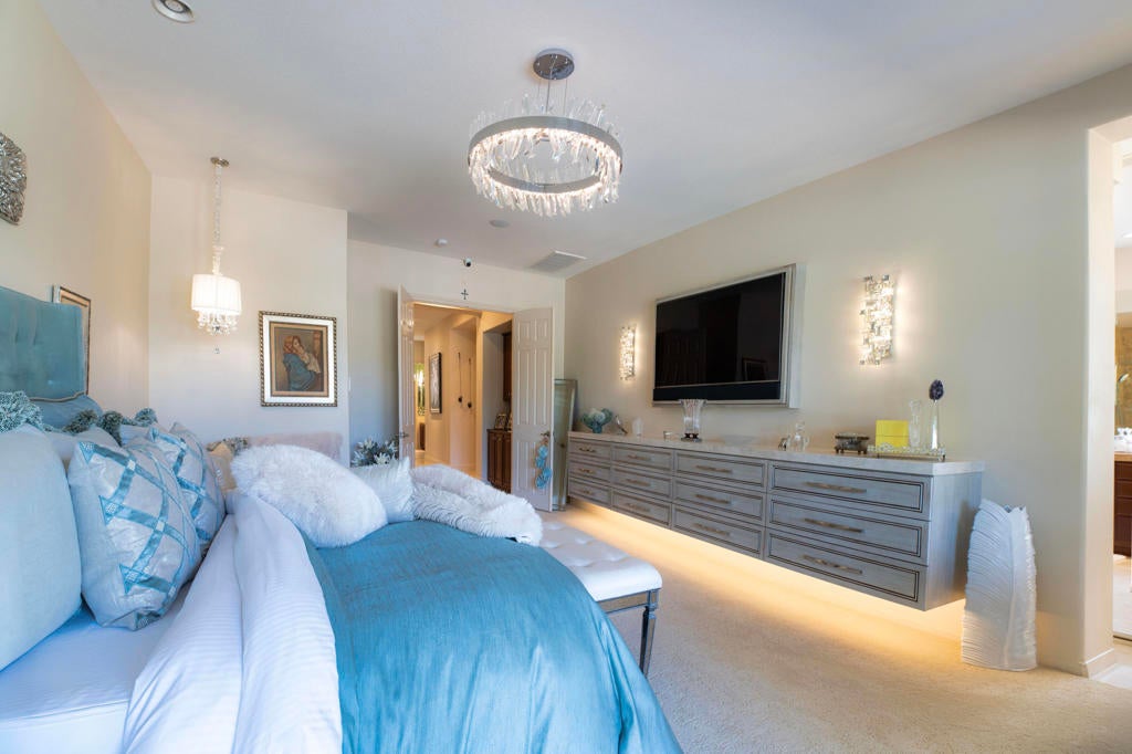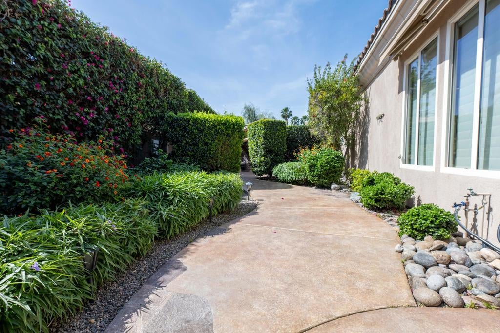 Spectacular Estate on a RARE oversized .61-acre lot lushly landscaped and manicured in gated Desert River Estates. Pristine inside and out. Approx. 4152 custom sq. ft. of beautifully designed living space and exceptional indoor-outdoor entertaining. 4 Br. w/casita + office or could become a potential 5th bedroom, 5 baths. This highly customized home welcomes you with a grand open floor plan, soaring ceilings, custom lighting throughout, grand chandeliers and expansive floor-to-ceiling windows and glass framing views of the backyard oasis while filling the home with natural light. Designed for entertaining on any scale, the home features a spacious great room with a dramatic built-in entertainment center and full bar, along with a formal living room and elegant dining room--creating multiple spaces for gathering and hosting. The gourmet kitchen is the heart of the home, complete with stainless steel appliances, granite slab counters, a generous breakfast bar, and a walk-in pantry, all seamlessly connected to the main living areas. The luxurious primary suite offers a private retreat with built in floating dresser, dramatic chandelier, an oversized jacuzzi tub, walk-in shower, dual vanities, and an expansive walk-in closet. One guest room opens to the courtyard for casita providing ideal accommodations for visitors or multigenerational living. Step outside to experience true resort-style desert living. The lushly landscaped backyard oasis sits on an impressive .61-acre lot and is designed for unforgettable gatherings. Enjoy a saltwater PebbleTec pool with tanning shelf, spa, built-in BBQ island w/pizza oven and an expansive 60-foot covered patio perfect for dining, lounging, and entertaining with expansive awnings and umbrellas to set the stage like a resort. The oversized grounds offer incredible flexibility, including a huge side yard with potential to add pickle ball, tennis, or additional outdoor recreation spaces--a rare opportunity in a gated desert community. Additional highlights include rich custom cabinetry, 24-inch travertine flooring, custom paint, designer window treatments, outdoor shower, a custom art filled fireplace, expanded floor plan with outdoor bath and storage room, auto water and gas shut off, plus a spacious three-car garage. A truly exceptional estate combining luxury, space, and the ultimate desert indoor-outdoor lifestyle with pride of ownership inside and out! You need to see this!