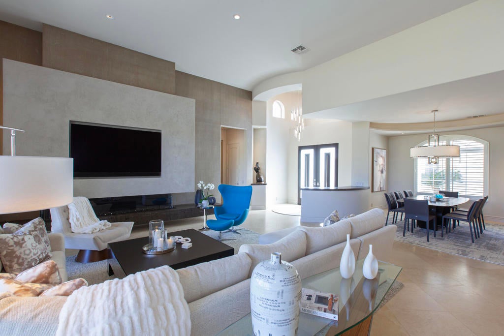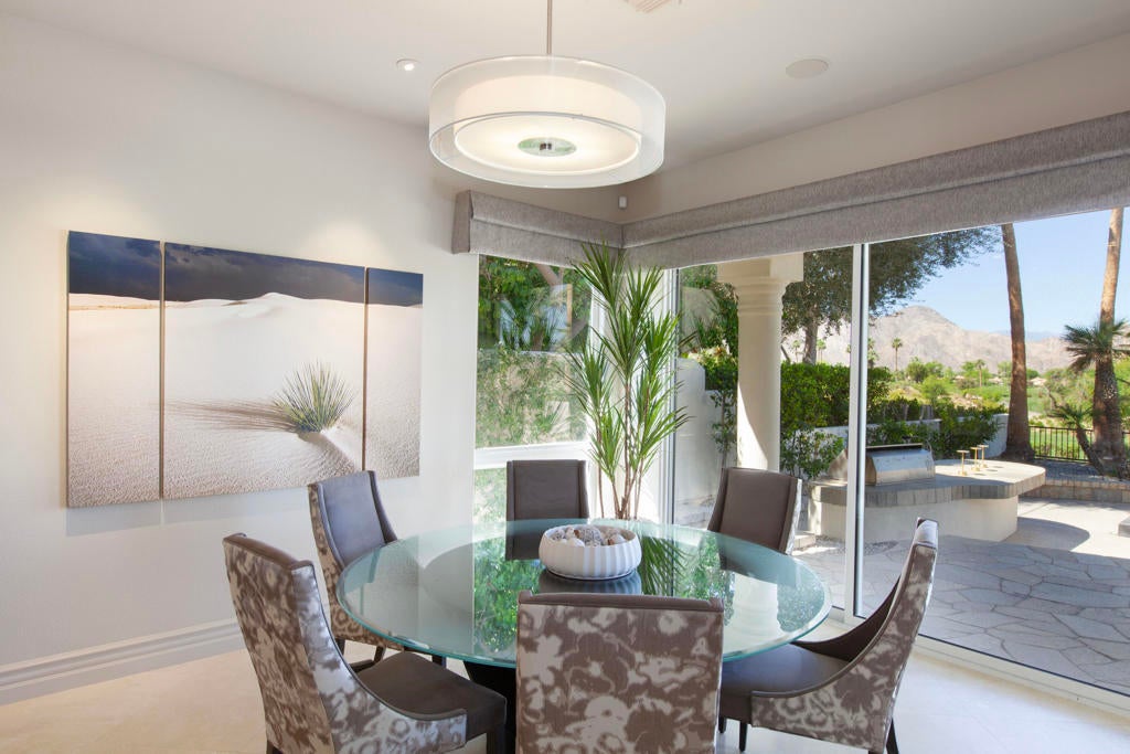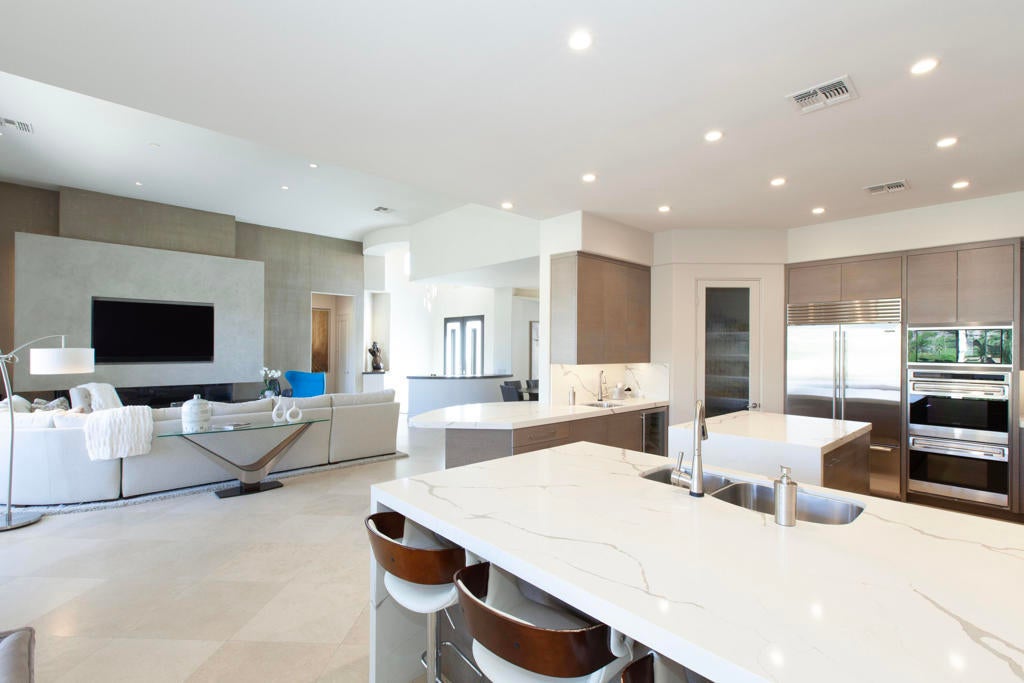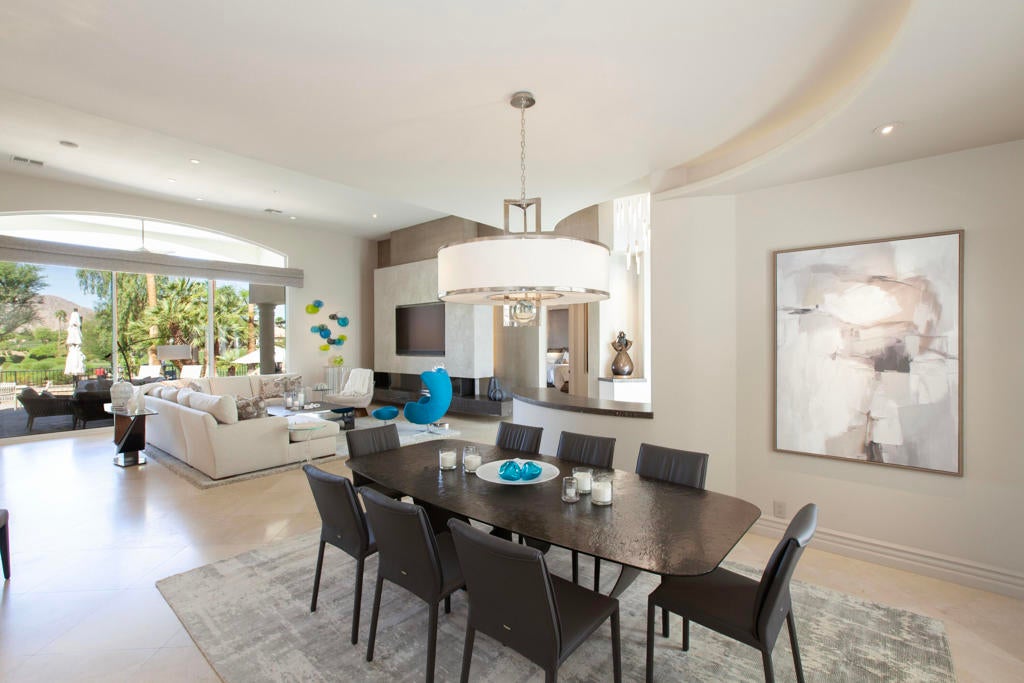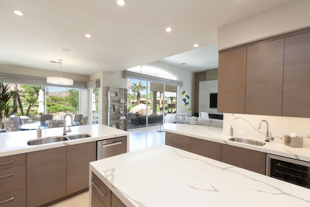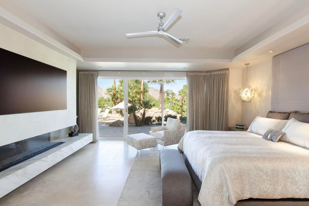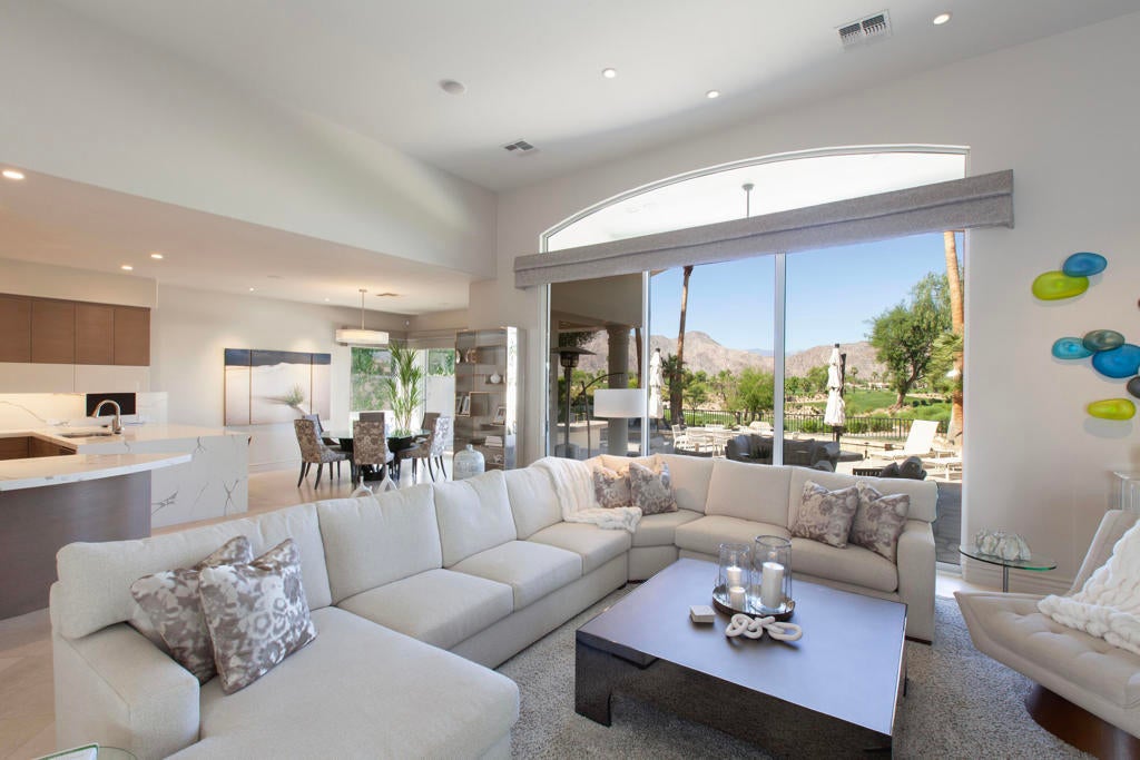 Set within the prestigious gates of Rancho La Quinta Country Club, this one-of-a-kind reimagined Montana I residence evokes the elevated design and refined aesthetic of a custom home, offering a rare blend of architectural sophistication, modern luxury, and breathtaking natural beauty. Positioned on an expansive 15,246 sq. ft. cul-de-sac lot, the home is elevated to capture sweeping views of the Santa Rosa Mountains, rugged foothills, and multiple fairways--creating a dramatic and ever-changing desert backdrop. A striking arrival begins with contemporary dual wood and frosted glass entry doors, opening to a custom half-moon marble-topped foyer accented by an art niche, designer lighting, custom paint, and curated wall coverings. Inside, the home has been completely redesigned to deliver a modern, gallery-like living experience. Expansive great room living is anchored by a cantilevered floating 8-foot fireplace beneath a sleek suspended TV wall, all set atop 24'' x 24'' travertine stone flooring that flows seamlessly throughout. The reimagined floor plan includes a reshaped dining area and a sophisticated open-concept layout ideal for both intimate living and grand entertaining. The designer kitchen is a true showpiece, featuring quartz countertops, a large center island, and premium stainless appliances including a Sub-Zero refrigerator, Wolf microwave and double ovens, Bosch dishwasher, and wine refrigeration.The primary suite is a luxurious retreat, thoughtfully redesigned with a floating 5-foot fireplace and modern TV wall, while the spa-inspired bath offers a step-in, step-out shower, soaking tub, and French doors opening directly to the resort-style backyard. One guest bedroom has been transformed into a contemporary office, while two guest casitas provide exceptional privacy and flexibility for visitors. Outdoor living reaches new heights with a spectacular resort pool environment featuring a large swimmer's pool, separate party pool, dual waterfalls, spa, and an elevated viewing deck--all designed to maximize the stunning panoramic setting. A spacious BBQ island anchors the entertainer's patio, while the fenced backyard adds both definition and functionality. Additional enhancements include custom window coverings with electronically controlled shades, newly painted exterior, and professionally redesigned landscaping. Three-car garage features air conditioning, epoxy flooring and built-in storage. See Improvements List. Turnkey Furnished