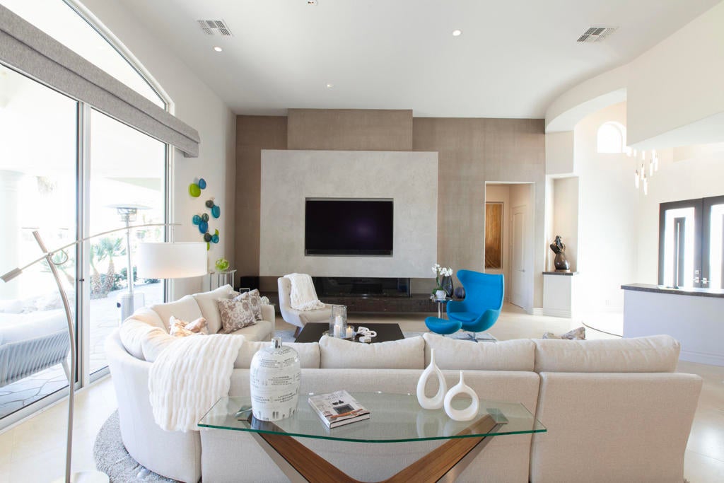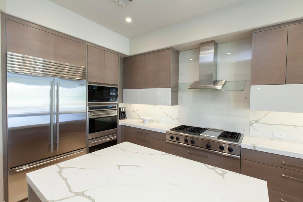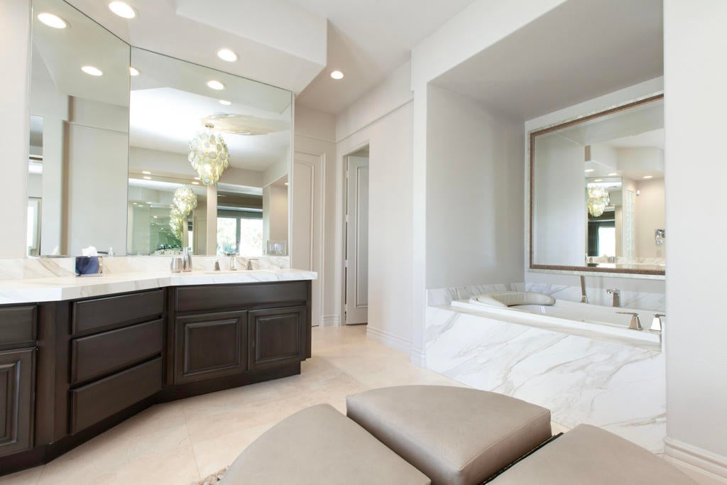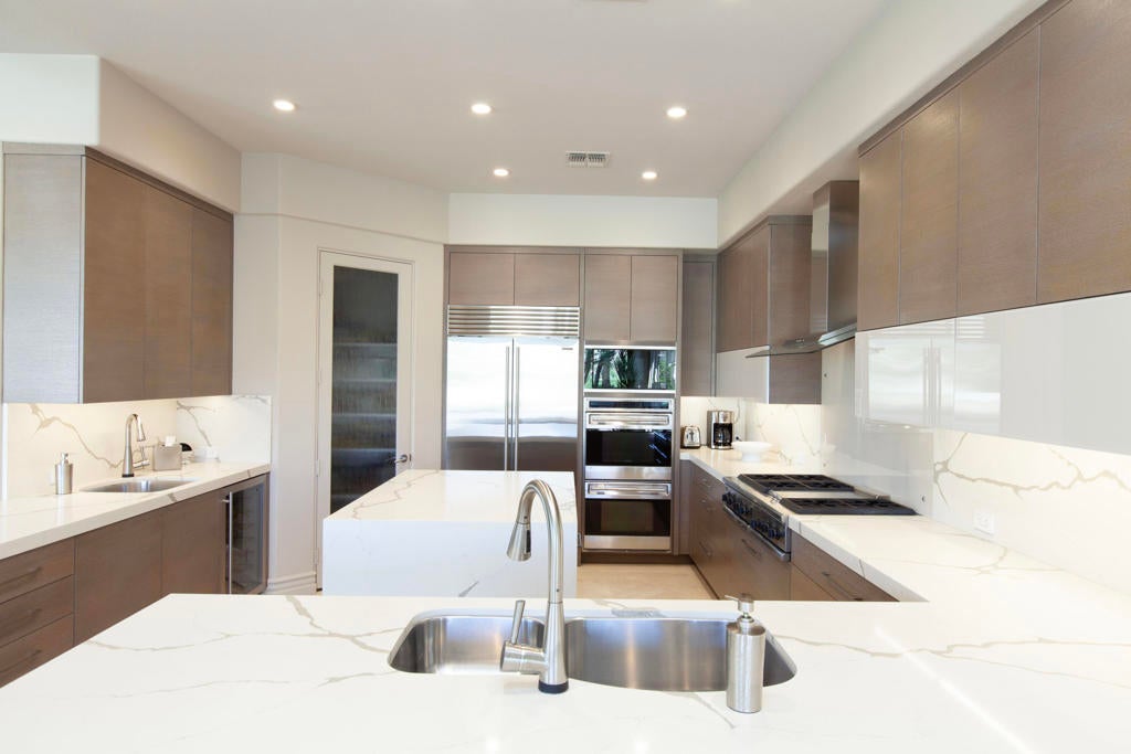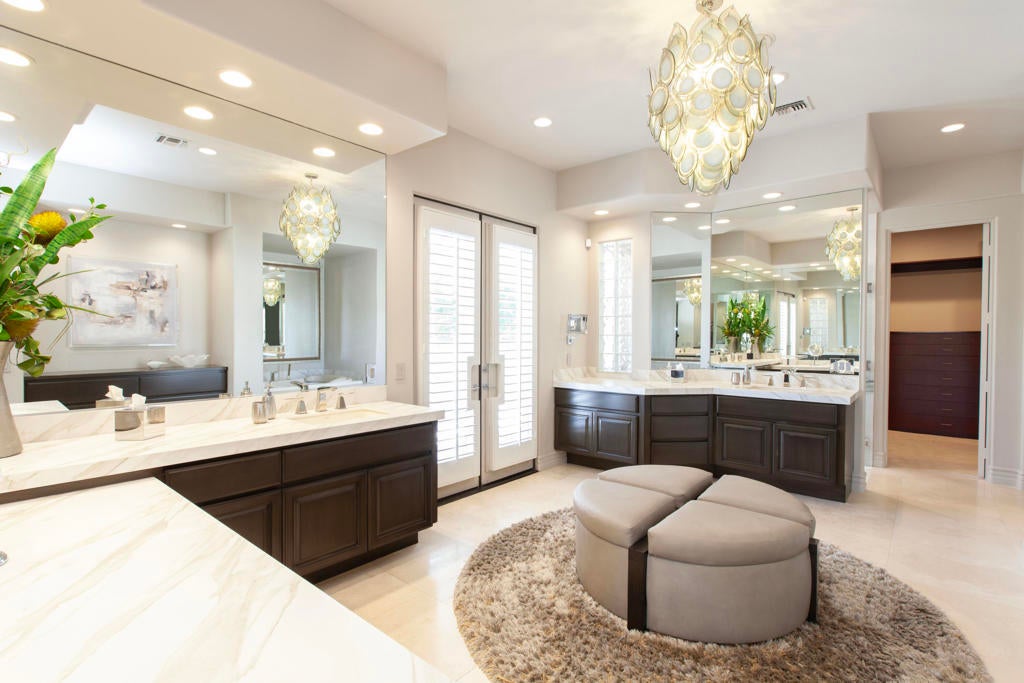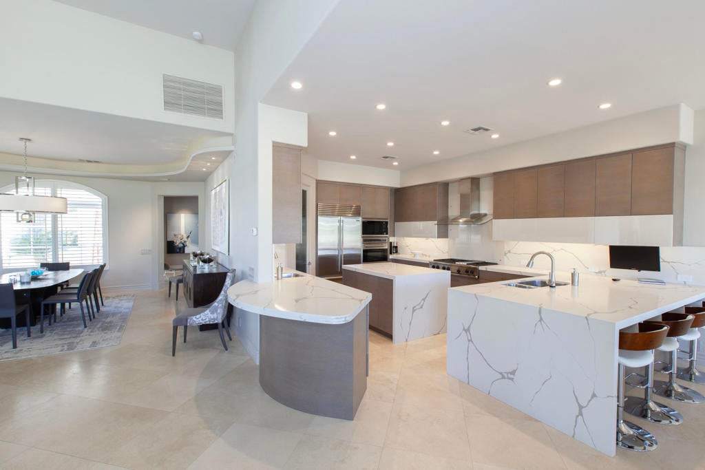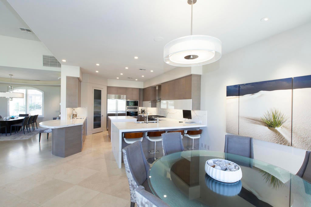 Set within the prestigious gates of Rancho La Quinta Country Club, this one-of-a-kind reimagined Montana I residence evokes the elevated design and refined aesthetic of a custom home, offering a rare blend of architectural sophistication, modern luxury, and breathtaking natural beauty. Positioned on an expansive 15,246 sq. ft. cul-de-sac lot, the home is elevated to capture sweeping views of the Santa Rosa Mountains, rugged foothills, and multiple fairways--creating a dramatic and ever-changing desert backdrop. A striking arrival begins with contemporary dual wood and frosted glass entry doors, opening to a custom half-moon marble-topped foyer accented by an art niche, designer lighting, custom paint, and curated wall coverings. Inside, the home has been completely redesigned to deliver a modern, gallery-like living experience. Expansive great room living is anchored by a cantilevered floating 8-foot fireplace beneath a sleek suspended TV wall, all set atop 24'' x 24'' travertine stone flooring that flows seamlessly throughout. The reimagined floor plan includes a reshaped dining area and a sophisticated open-concept layout ideal for both intimate living and grand entertaining. The designer kitchen is a true showpiece, featuring quartz countertops, a large center island, and premium stainless appliances including a Sub-Zero refrigerator, Wolf microwave and double ovens, Bosch dishwasher, and wine refrigeration.The primary suite is a luxurious retreat, thoughtfully redesigned with a floating 5-foot fireplace and modern TV wall, while the spa-inspired bath offers a step-in, step-out shower, soaking tub, and French doors opening directly to the resort-style backyard. One guest bedroom has been transformed into a contemporary office, while two guest casitas provide exceptional privacy and flexibility for visitors. Outdoor living reaches new heights with a spectacular resort pool environment featuring a large swimmer's pool, separate party pool, dual waterfalls, spa, and an elevated viewing deck--all designed to maximize the stunning panoramic setting. A spacious BBQ island anchors the entertainer's patio, while the fenced backyard adds both definition and functionality. Additional enhancements include custom window coverings with electronically controlled shades, newly painted exterior, and professionally redesigned landscaping. Three-car garage features air conditioning, epoxy flooring and built-in storage. See Improvements List. Turnkey Furnished