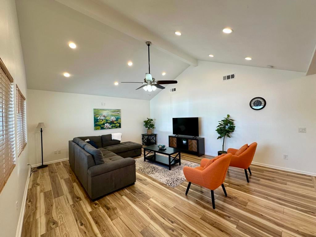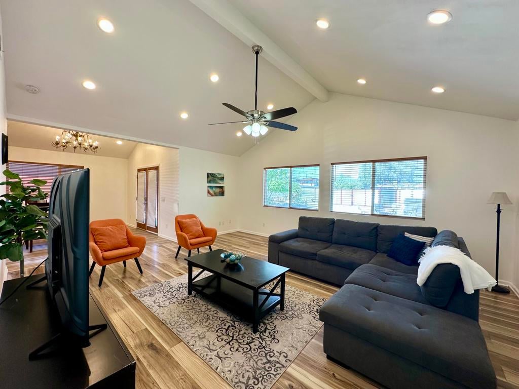 Welcome to this beautifully updated 3-bedroom, 3-bathroom home located in the scenic Joshua Tree. The home boasts a modern kitchen equipped with stainless steel appliances and a custom backsplash that adds a touch of elegance.The laminated wood flooring throughout the house gives the house a warm, inviting feel. Each room is equipped with ceiling fans, central heating, and air conditioning to ensure your comfort year-round. The property also features a dedicated laundry room complete with a washer and dryer. Just outside, you'll have access to a large, enclosed yard, perfect for outdoor activities.The covered patio is an ideal spot for relaxation or entertaining guests. For your convenience, the property includes a gated driveway.Centrally located, minutes from Yucca Valley shopping centers and dining.This home perfectly combines style, comfort, and functionality to offer a truly remarkable living experience.
