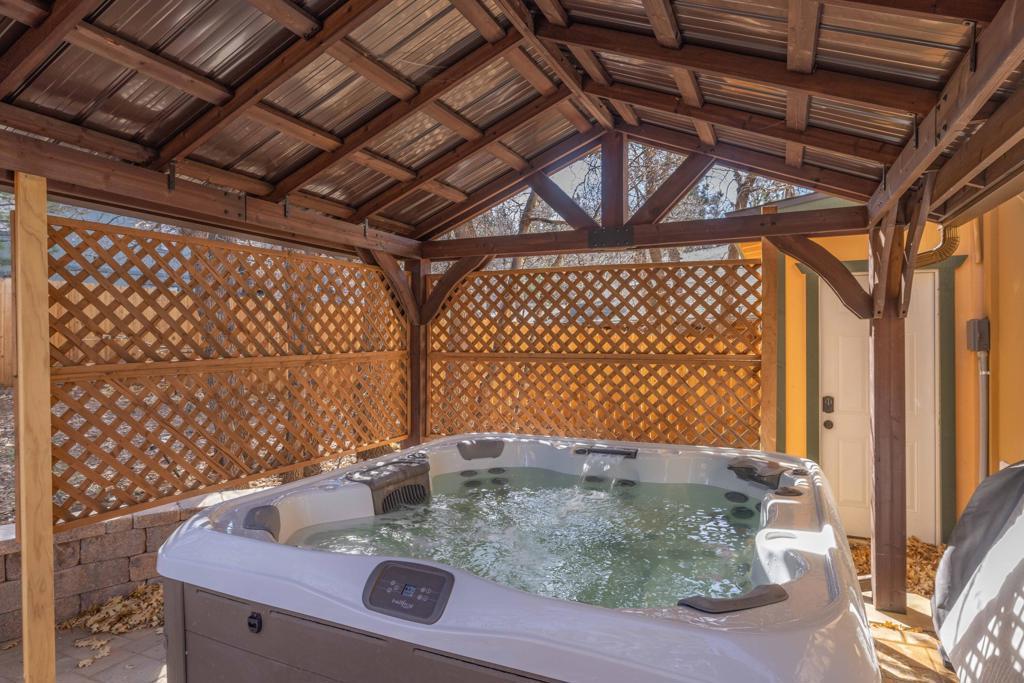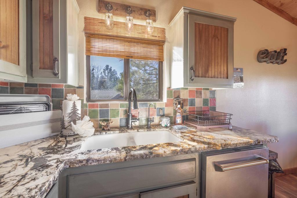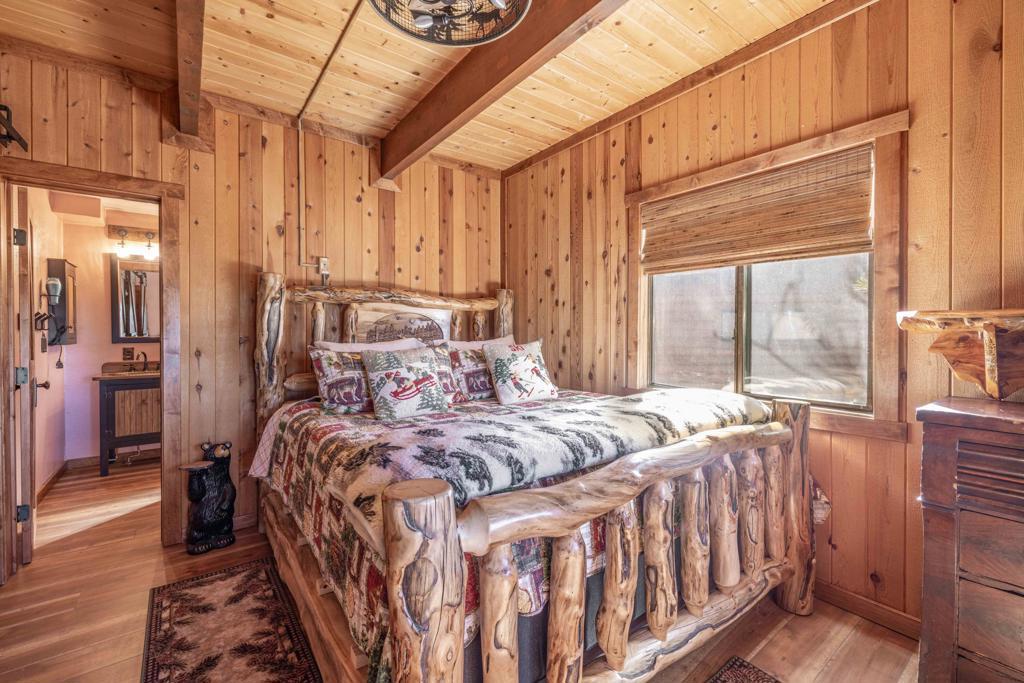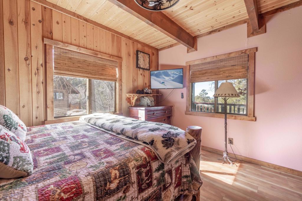 Remarkable in Moonridge: This magnificent mountain cabin has all the alpine ambiance you've been looking for, and more... Updated throughout with a meticulous attention to detail, you'll love the expansive views, the warm woodsy interior and all the modern amenities. Both bedrooms have updated bathrooms attached. Two fireplaces, a wet bar in the den, vaulted wood ceilings upstairs, beautiful marble countertops, private backyard with new spa tub and a spacious elevated deck to relax and admire mother nature, are just a few of the things that make this one a winner.