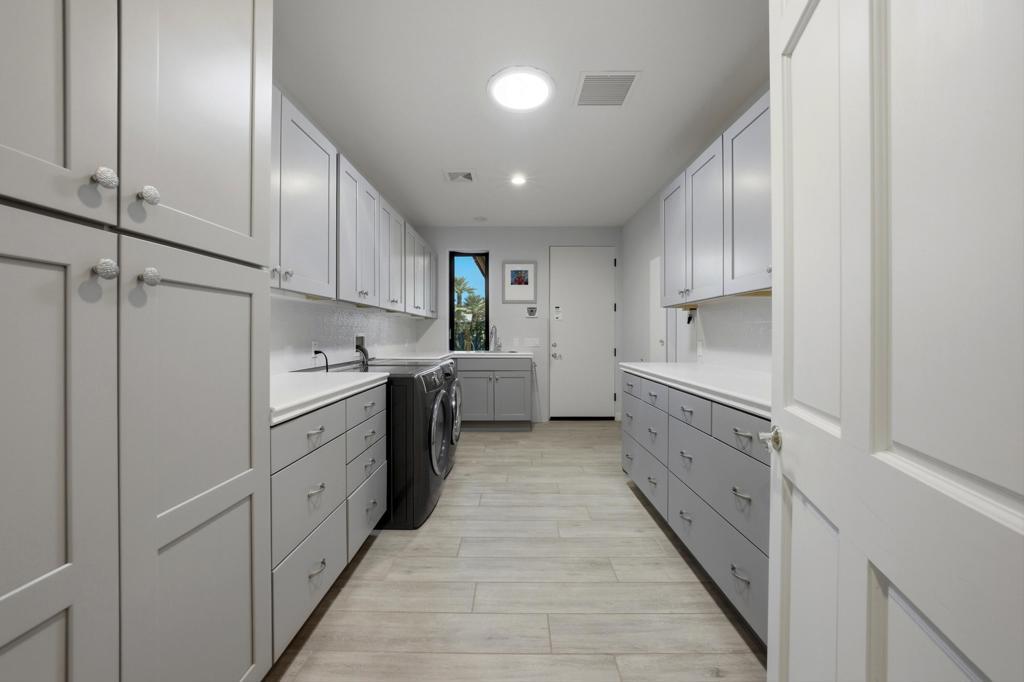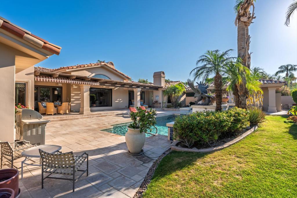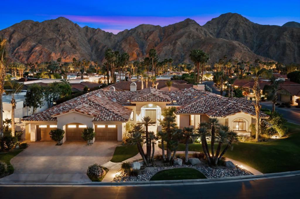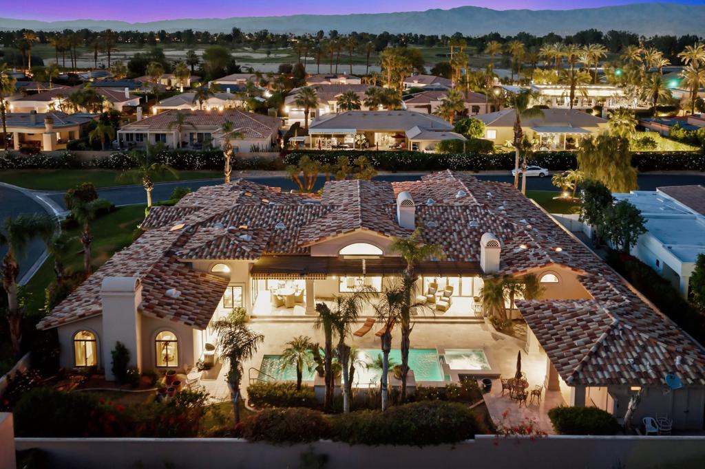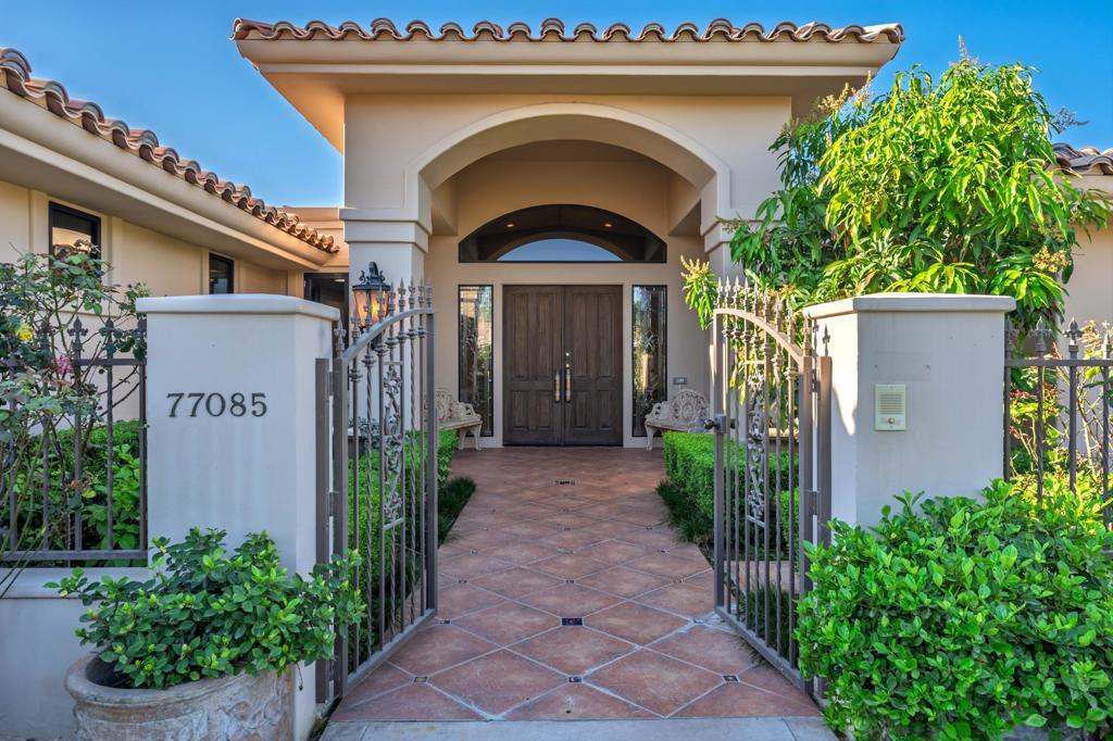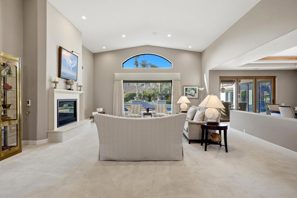 Located behind the gates of Indian Wells Country Club, this beautifully positioned residence captures the essence of desert living, with sweeping Santa Rosa Mountain views and a seamless indoor-outdoor experience. With 5 ensuite bedrooms, 6 1/2 baths, 4 fireplaces and on 1/2 Acre this is perfect if you are looking for a newer home since a much of the home was rebuilt in 2017. A grand entry with crystal chandelier opens to a wall of glass framing the pool, waterfall, and mountains, creating a natural connection between interior and exterior spaces.High volume ceilings and abundant natural light define the interiors, while thoughtfully designed walls, arches, and display niches throughout provide an exceptional backdrop for art. The formal living room with its large window expanses and fireplace offer a striking yet inviting setting, while the formal dining room with soffit lighting and fold away Nano doors s ideal for entertaining.The gourmet kitchen is appointed with Wolf appliances, 2 dishwashers, 2 refrigs, central island w/sink, warming drawer,walk-in pantry, built-in desk, soft close cabinets & a comfortable eating area-designed for both everyday living and gathering. It opens to a massive family room with fireplace & wet bar, creating a relaxed, functional space for casual moments.Most areas along the south side of the home open with Nano folding doors to the outdoor living area beyond, enhancing the indoor-outdoor connection & capturing the surrounding mountain views.The spacious primary suite is privately positioned in its own wing, featuring a sitting area, fireplace, & two large walk-in closets a dressing area, freestanding tub & large shower & more. Three guest bedrooms are located on the opposite side of the home, providing separation and privacy. The 5th bedroom is a detached Casita with kitchenette, offering comfortable accommodations for guests.Outdoor living is elevated with a saltwater pool and spa with pebble finish, a cascading waterfall feature, & expansive stone-tiled patios--all set against a stunning mountain backdrop.Features include 5 skylights, 5 solar tubes, newer flooring, newer windows throughout, surround sound speakers, whole-house water filtration system, tankless on-demand hot water, 6AC, roof tile replaced in 2017. The air-conditioned garage is ideal for a car collector, complete with work area, office, and bath. Cul-de-sac with only 2 homes. A rare offering combining scale, privacy, character, & refined des