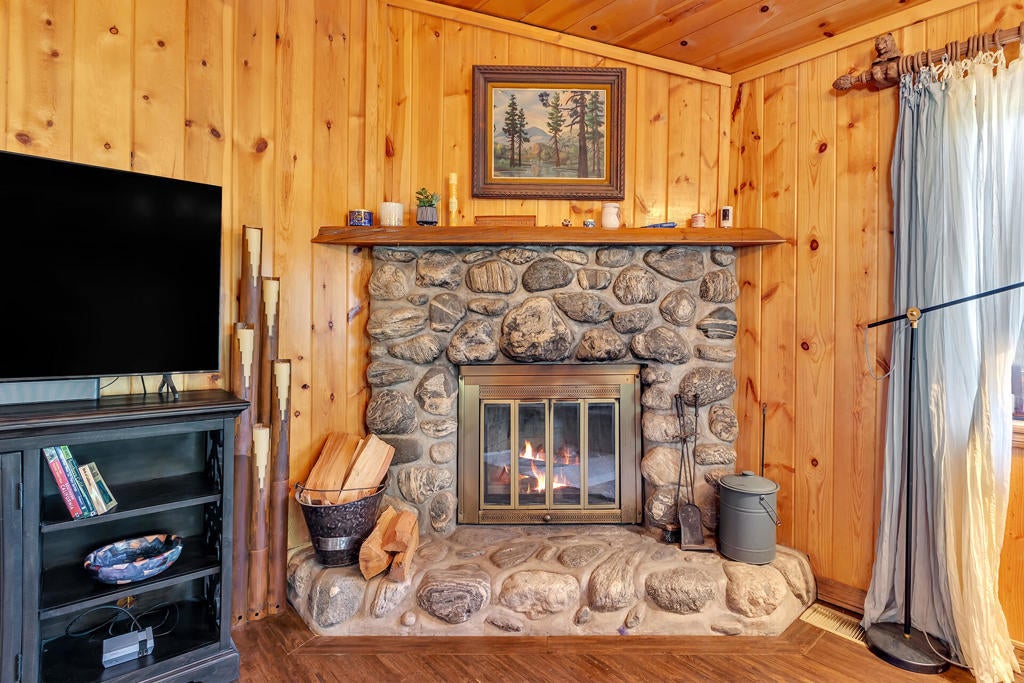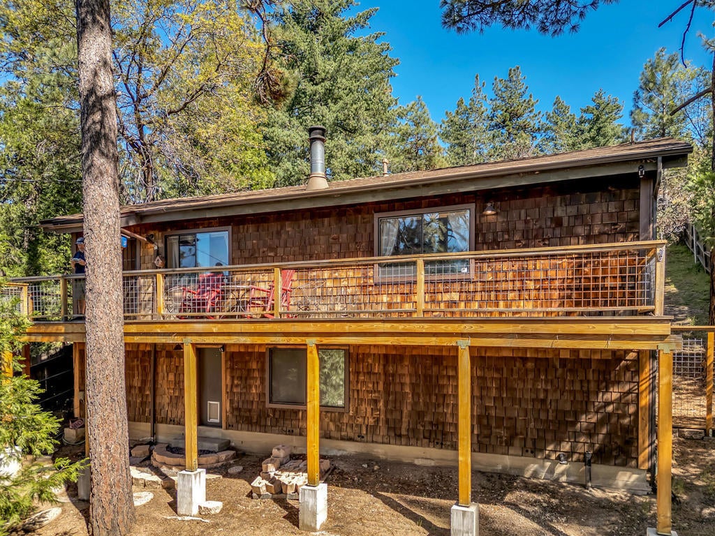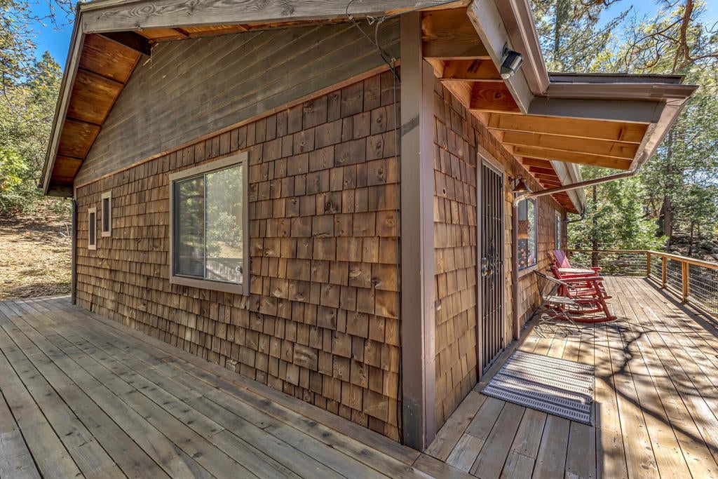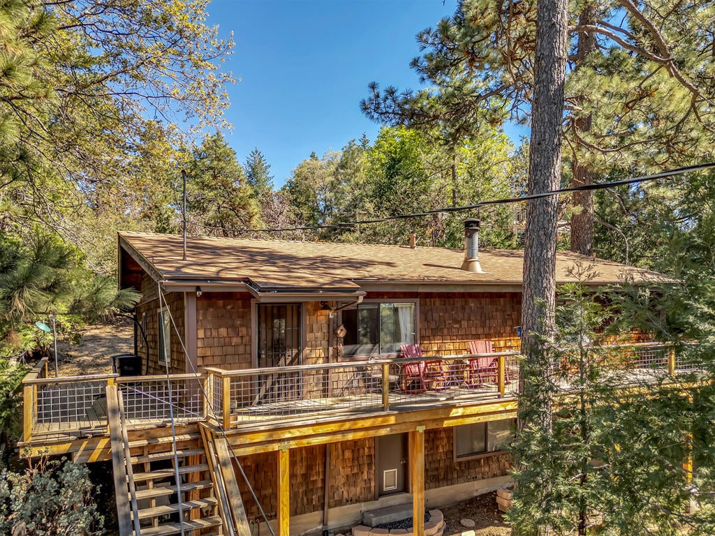 Welcome to this turnkey two bedroom/two bath home in Idyllwild. Located on .27 acres, this 1,118 square foot home features the perfect mix of rustic and modern living, with vaulted ceilings throughout, cozy river rock fireplace, upgraded kitchen, separate dining area, two full bathrooms, and two spacious bedrooms (primary bedroom includes an en suite bathroom), as well as central heat and AC and plenty of closest storage. The very large newer front deck, which is set back from the street for additional privacy, offers beautifully forested views facing west toward the sunset, and the expansive fully fenced backyard features separate decking as well as plenty of space for private entertaining. The property has room for three cars to park in the driveway, with a new retaining wall and new concrete entry stairs. The home interior includes lots of storage, as well as a separate closeted washer and dryer area, in addition to a very generous under house storage/work area. Whether you are looking for a full time or part time home, this property has it all...views, comfort, ready access, and almost entirely furnished. Located less than a mile from downtown Idyllwild, this property is the perfect place to enjoy mountain living at its finest. Just bring your toothbrush!