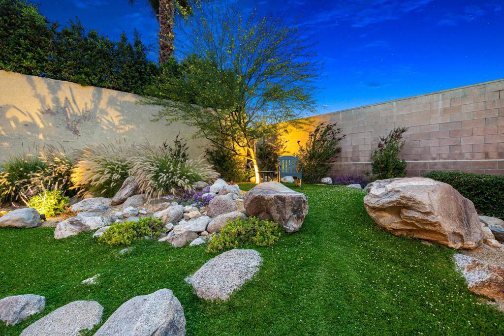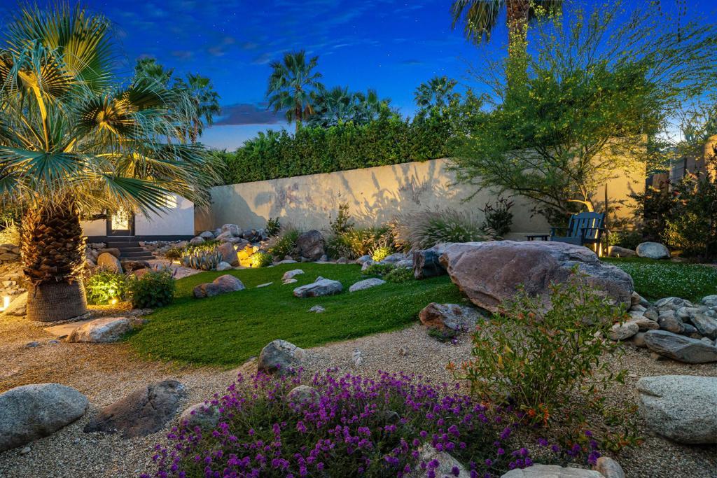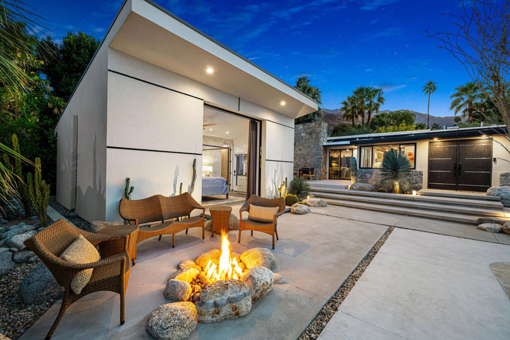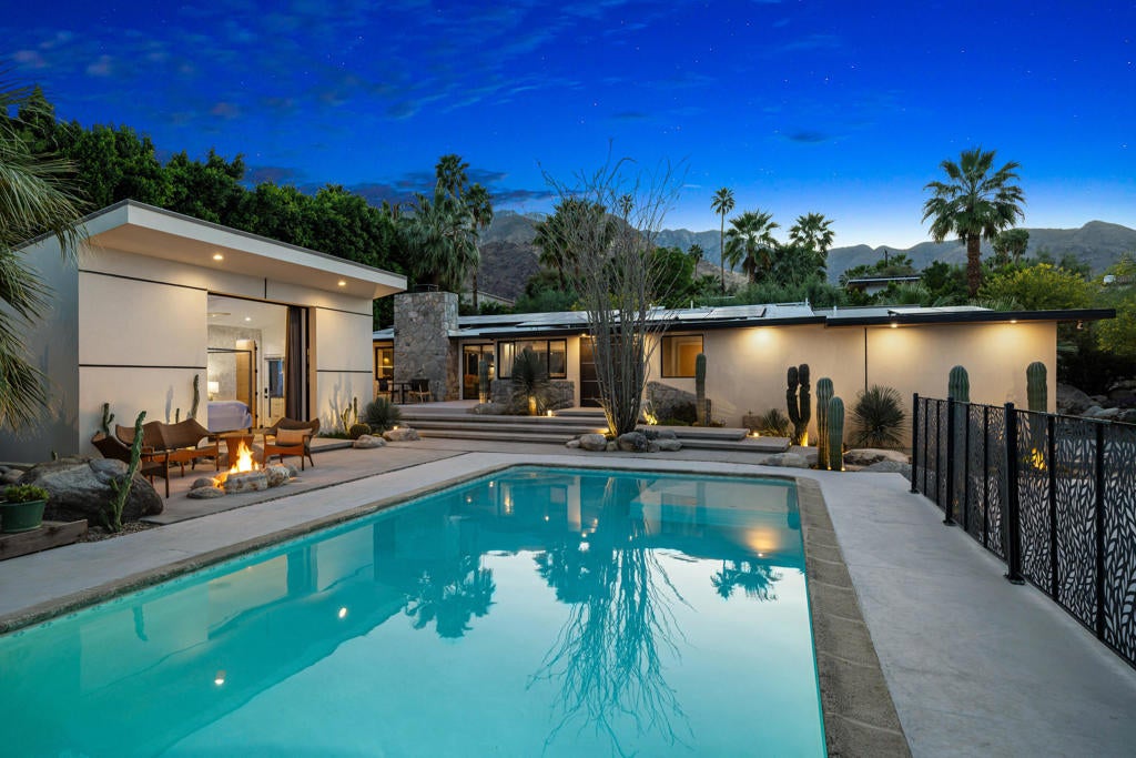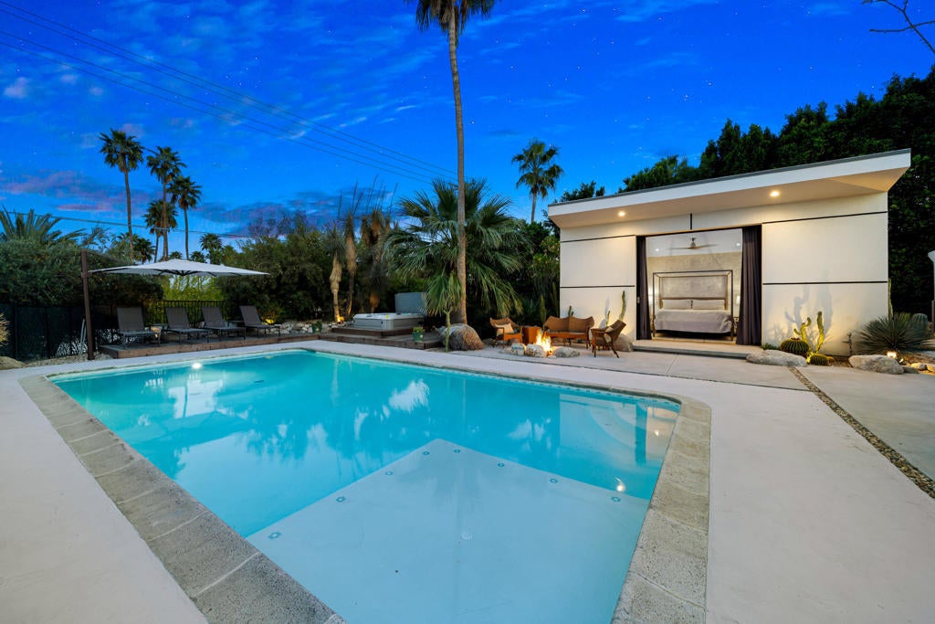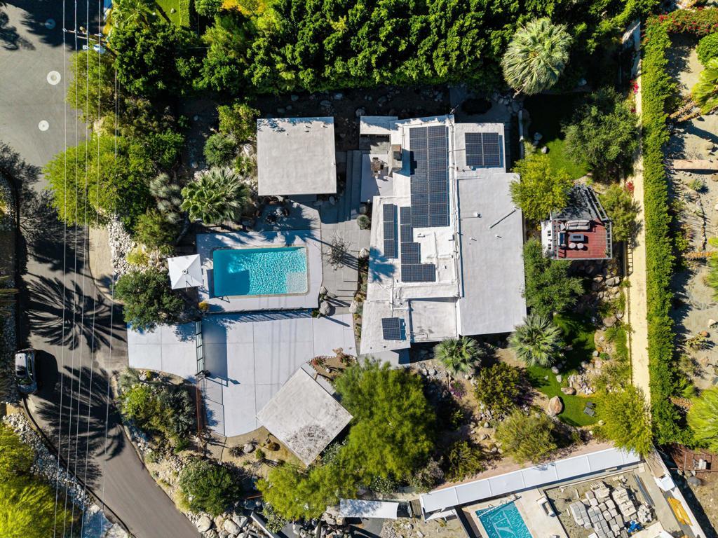Reimagined architectural residence in the coveted Little Tuscany neighborhood of Palm Springs, offering over 3,200 sq ft of refined desert living on nearly a half-acre. Thoughtfully redesigned to balance modern aesthetics with comfort and functionality, the property presents a rare combination of privacy, scale, and flexibility.A detached guest house with soaring ceilings, Fleetwood pocket doors, custom closets, and a private bath creates an ideal retreat for guests or extended stays. The main residence unfolds into an open-concept living space anchored by a fully updated kitchen with high-end appliances and a generous center island, seamlessly connecting to the dining and living areas with a gas fireplace and built-in wine bar. Polished concrete floors throughout enhance the home's clean architectural lines and desert-modern appeal.All bedrooms offer en-suite baths and custom closets, while the primary suite serves as a private retreat with a spa-inspired bath featuring a soaking tub, dual vanities, and elevated finishes.A separate structure on the west side of the property offers versatility as a home office, gym, or studio, complemented by a rooftop deck designed for stargazing and panoramic mountain views.Outdoor living is central to the experience, with an elevated pool and tanning shelf, updated decking, firepit, hot tub, and outdoor kitchen with BBQ. The grounds have been extensively redesigned by Desert Landscape Design with over $250,000 invested, creating a cohesive and elevated desert landscape.Significant system upgrades include replaced copper plumbing, re-foamed roof, reactivated solar system, newer pool equipment, EV charging station, new windows, motorized window treatments, updated lighting, and more. Previously owned by composer Ernst Krenek, adding a layer of cultural and architectural significance.