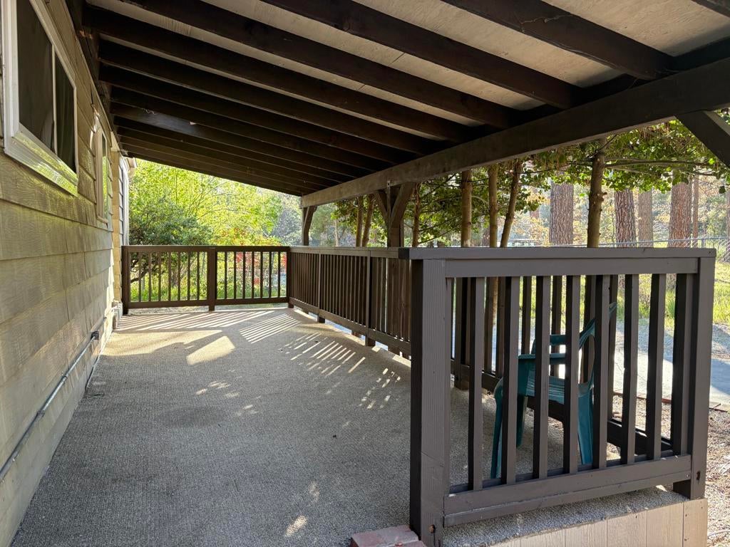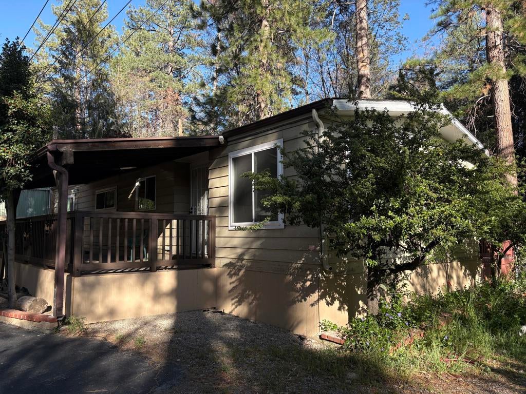 Welcome to one of the largest and most private mobile homes in Idyllwild Trailer Park, a 55+ senior-only mobile park located in downtown Idyllwild. This approximately 1,200 sq. foot light and airy home, located at the end of the road in the park, offers lots of space, peace, and quiet for full-time or part-time living. The home features two large bedrooms with ample closet space, two bathrooms (one full, one 3/4), a separate office space, a large living room, large kitchen, dining area, and separate laundry room, as well as outdoor decking. The home has new flooring, new indoor paint, dual pane windows, and the primary bathroom has been remodeled. Off of your parking area you enter through a spacious covered patio into the open concept living, dining, and kitchen areas that include lots of cabinets and a built-in hutch, as well as a slider to the back side deck. Off the hallway you have access to the laundry area with further access to the separate bonus room/office that opens onto the second deck in the in backyard. Continuing down the hall, on your left you have the guest bedroom, which is across the hall from the 3/4 bathroom. At the end of the hall is the oversized primary suite that includes a large closet and an en suite remodeled full bathroom. Upgrades include new exterior and closet doors, dual pane windows, primary bathroom vanity and tile, redone footings and skirting, as well as a newer refrigerator. All appliances are included. The space includes fruit trees planted to the right of the home. Space rent at is $817 per month, which includes water and snow plowing fees.