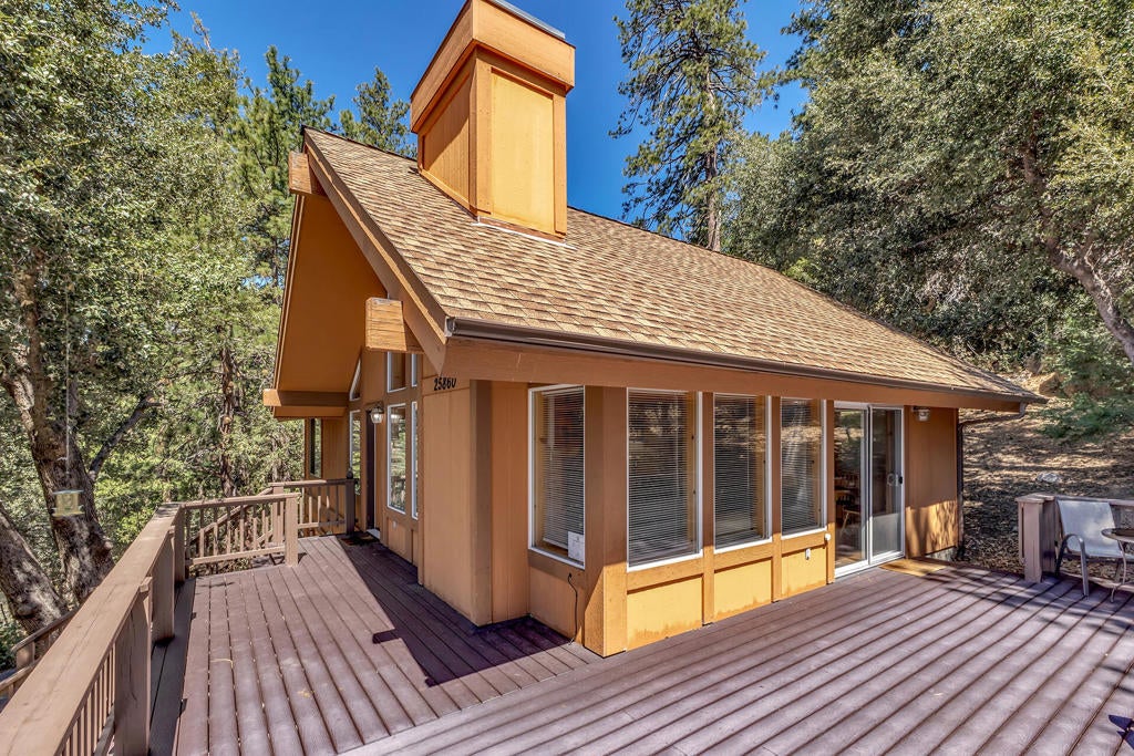 Don't miss your opportunity to make this your Idyllwild get-away or full-time residence! This lovely, low maintenance, move-in-ready home on .19 acres in popular Fern Valley features a very large, light and airy open living room with huge wood-framed picture windows, propane rock fireplace, and vaulted ceilings, as well as a bonus open loft area. The open kitchen offers a breakfast bar with ample seating and plenty of storage and cabinets, and there is a separate dining area off the living room. The two spacious bedrooms provide plenty of closet space and the primary bedroom features an en suite .75 bath. There is also a .75 guest bathroom, separate laundry area, additional closet storage, and dual pane windows throughout. Surrounding the home, the property features a very large composite wrap-around deck with plenty of room for gatherings large and small, and the home is nestled between live oaks, beautiful granite boulders, and lofty pines for the perfect balance of sunlight and privacy. Additionally, this beautiful property includes a one-car extended garage with a work bench and cabinets. Sunset View curves into Shady View, which is a cul-de-sac, allowing for additional peace and quiet. Best of all, this amazing property comes fully furnished. All you need to pack is your toothbrush and you're ready for mountain living at its finest. The property, which is located .9 miles from downtown Idyllwild, is readily accessible to numerous restaurants, shops, and hiking trails. Don't miss out on this MUST SEE property.