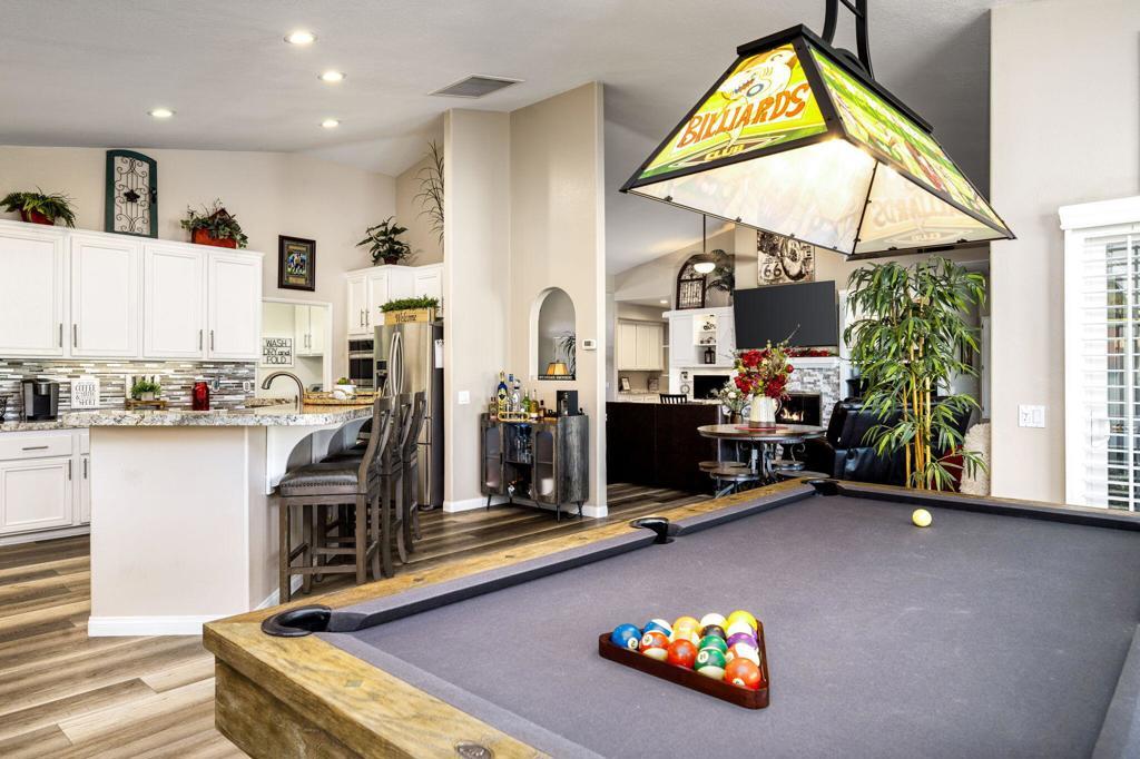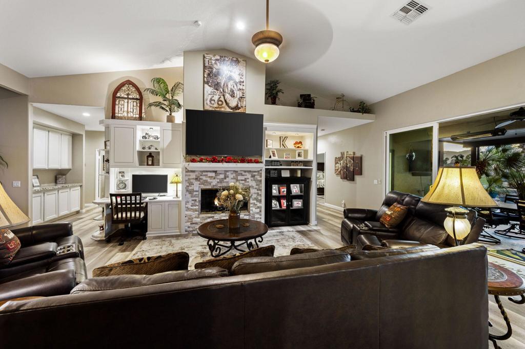 If you're searching for 'The Best of Indian Springs,' you've just found it! Designed for exceptional indoor-outdoor living and effortless entertaining, this stunning residence offers 2,719 square feet, 4 bedrooms, 3 bathrooms, and a spacious 3-car garage--highlighted by one of the largest and most impressive resort-style backyards in the community.From the moment you enter, you're welcomed by beautiful luxury vinyl flooring and an expansive great room that seamlessly blends comfort and style. Oversized, upgraded double sliding glass doors open wide to a truly spectacular covered patio--creating the perfect flow between indoor and outdoor living.The open-concept kitchen is built to impress, featuring a large center island, slab granite countertops, stainless steel appliances, and an oversized walk-in pantry. It connects effortlessly to the dining area, complete with a versatile dining/pool table--ideal for entertaining guests or enjoying memorable gatherings.Step outside and experience what truly sets this home apart. The backyard is a private resort--offering more functional living space outdoors than inside. Enjoy a custom PebbleTec pool with beach entry, play ledge, swim-up stools, cascading waterfall, and an elevated spa with its own observation deck--perfect for relaxing evenings under the desert sky.Multiple outdoor living areas invite you to unwind, including an oversized fire feature lounge, tranquil water features, and a fully equipped covered patio with built-in BBQ, dining area, infrared heaters, and a large-screen TV--creating the ultimate year-round entertainment space.The primary suite is a private retreat, generously sized with serene views of the pool and outdoor living areas. The spa-inspired bathroom and expansive custom walk-in closet complete a space designed for comfort and luxury. Three additional bedrooms are thoughtfully positioned at the front of the home, offering privacy and flexibility for family and guests.This is a rare opportunity to own one of Indian Springs' most exceptional homes--meticulously upgraded, beautifully maintained, and designed to elevate everyday living.Come experience it in person--this one truly stands apart.