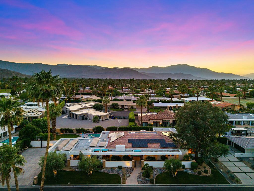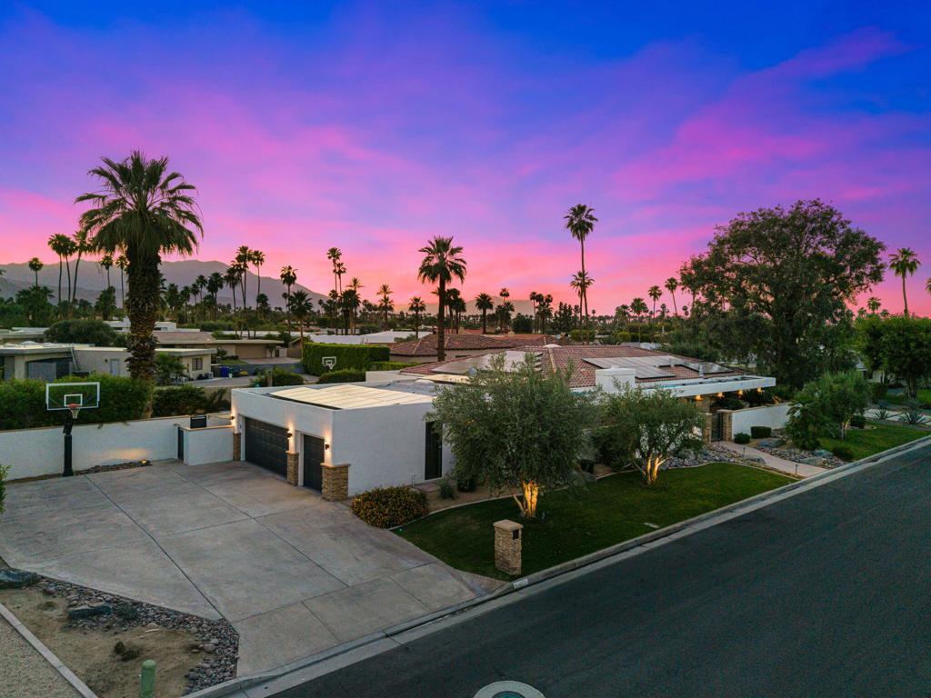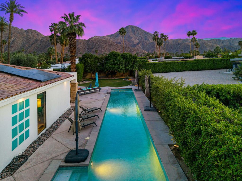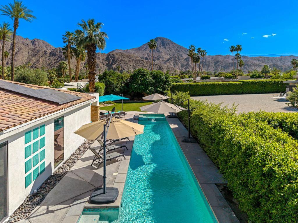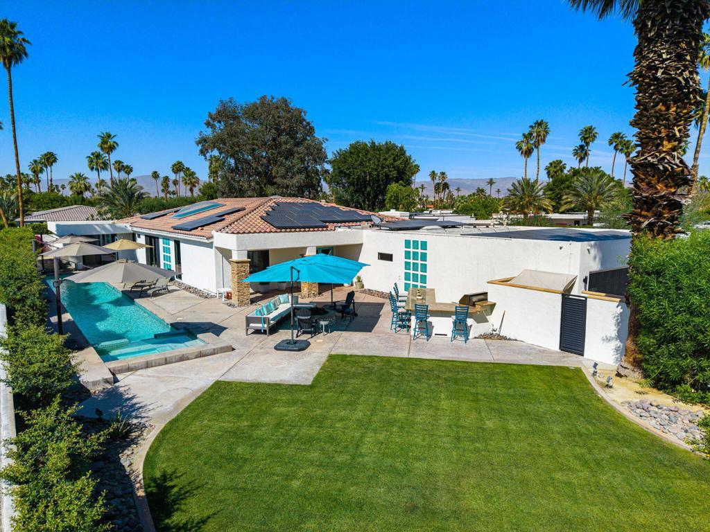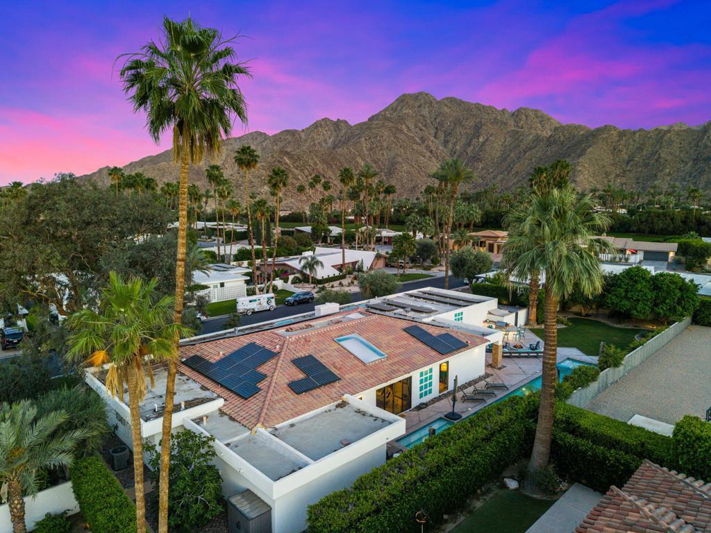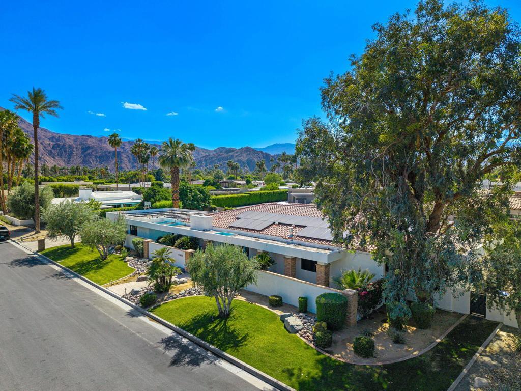 Indian Wells Luxury on .43 Acres | 84 Solar Panels | Lap Pool + Eisenhower Views. Desert modernism doesn't get more authentic than this. Conceived by a celebrated local designer, Vicki McDermott in 1978, this single-story Indian Wells estate carries the architectural DNA of the Palm Springs design tradition. Tasteful contemporary updates make it feel completely at home in 2026. Timeless character, gracious proportions, and a one-of-a-kind provenance that simply cannot be replicated. At 5,323 square feet on nearly a half acre, this is the largest home and lot on the street. A genuinely custom offering at a scale that is increasingly rare in Indian Wells. The soaring great room, with ceilings over 22 feet high, two statement fireplaces, travertine floors, exposed beams, and solid alder wood doors and trim throughout deliver architectural character that no newer construction can touch. Five bedrooms offer flexible configurations, a primary suite and junior suite each with private en-suite baths, two additional bedrooms sharing a Jack-and-Jill bath, a dedicated guest bath off the playroom, and a private walled entry courtyard with a tranquil water feature. Multiple sets of sliding glass doors create seamless indoor-outdoor flow out to your private desert oasis with panoramic mountain views. Outside, the lap pool and spa anchor a true entertainer's paradise. Built-in Alfresco professional grill, outdoor bar with sink, gas fire pit, full mister system, and smart exterior lighting throughout. The fully walled grounds are framed by mature privacy hedges, a towering Washingtonian palm, and a working citrus and fig orchard, tangelo, orange, and fig trees that produce generously in season. The 84-panel owned solar array means energy costs that are a fraction of comparable properties. A Tesla EV charger, epoxy-sealed garage floor, and full permitted natural gas system replacement round out an infrastructure story with zero deferred maintenance questions. No HOA. No gates. No monthly fees. Indian Wells prestige, walking distance to Eldorado Country Club, Indian Wells Country Club, and The Vintage Club, and minutes to the BNP Paribas Open and El Paseo. Whether you are here for tournament season or year-round desert living, this is complete California freedom on your own terms. Furnishings available separately. This home can be turn-key for the right buyer.