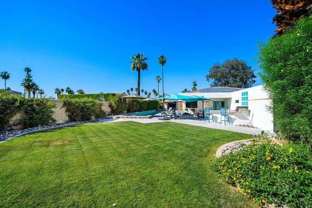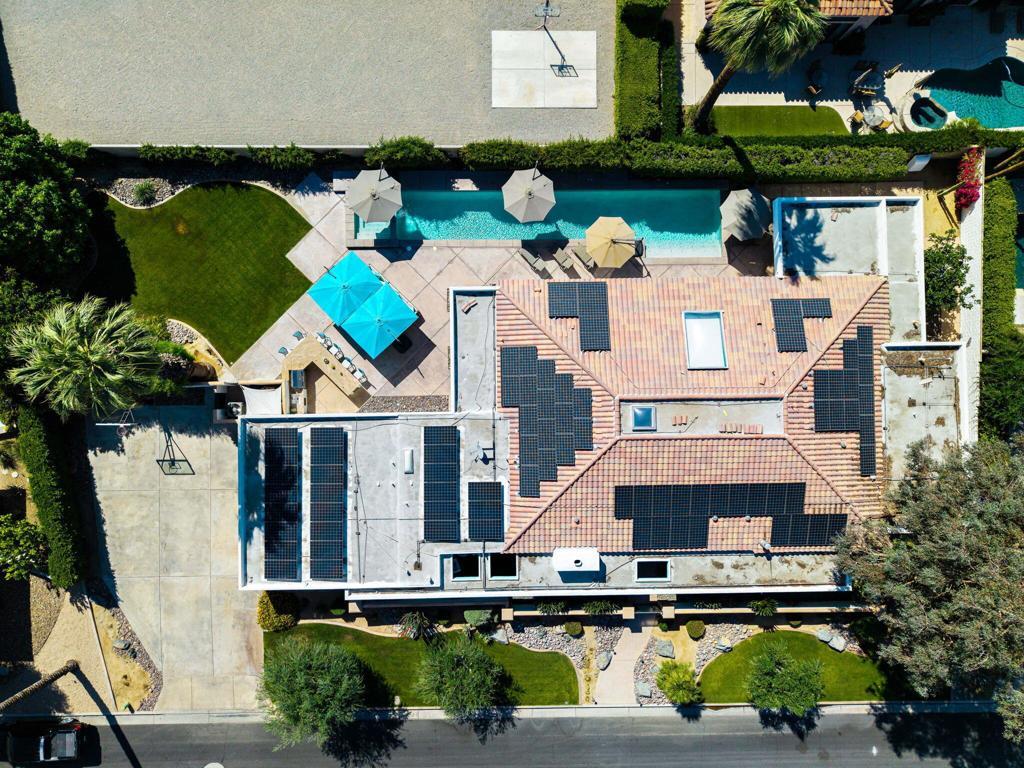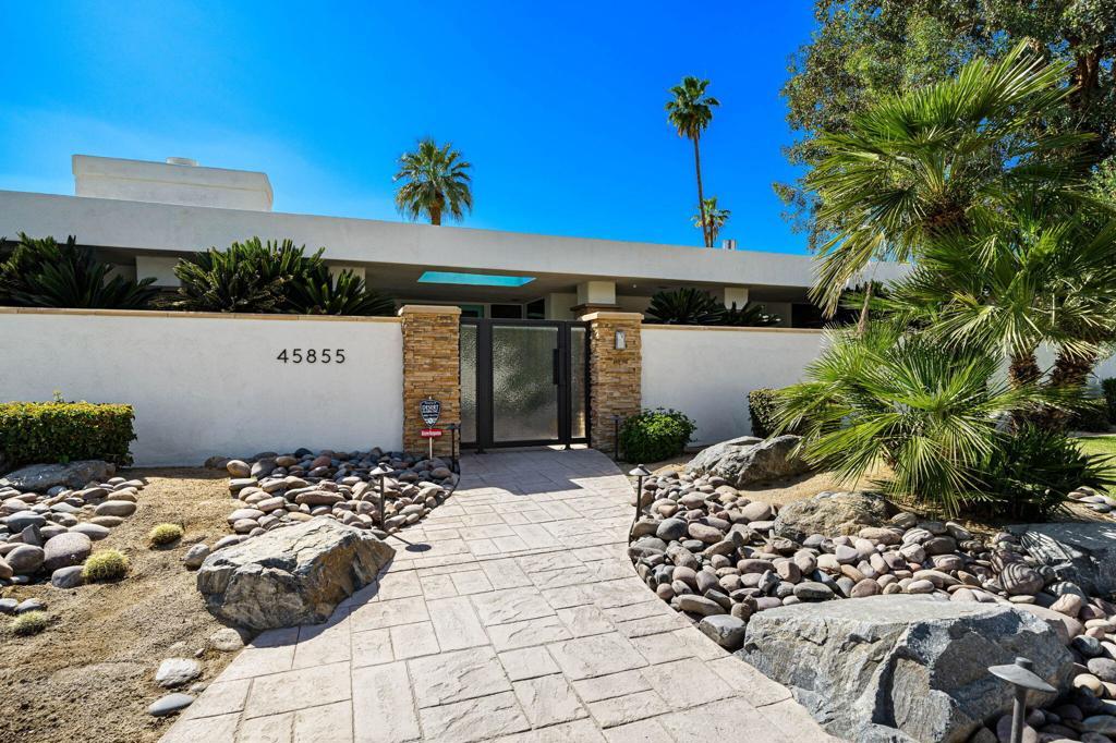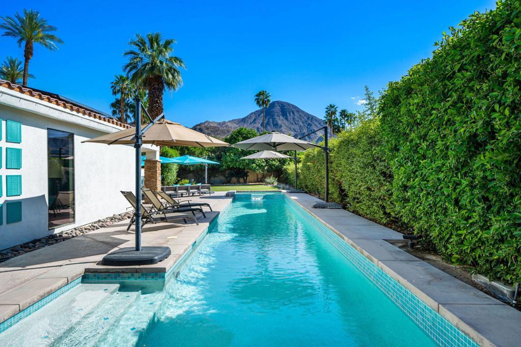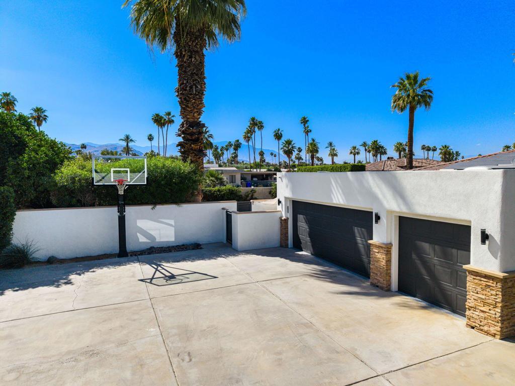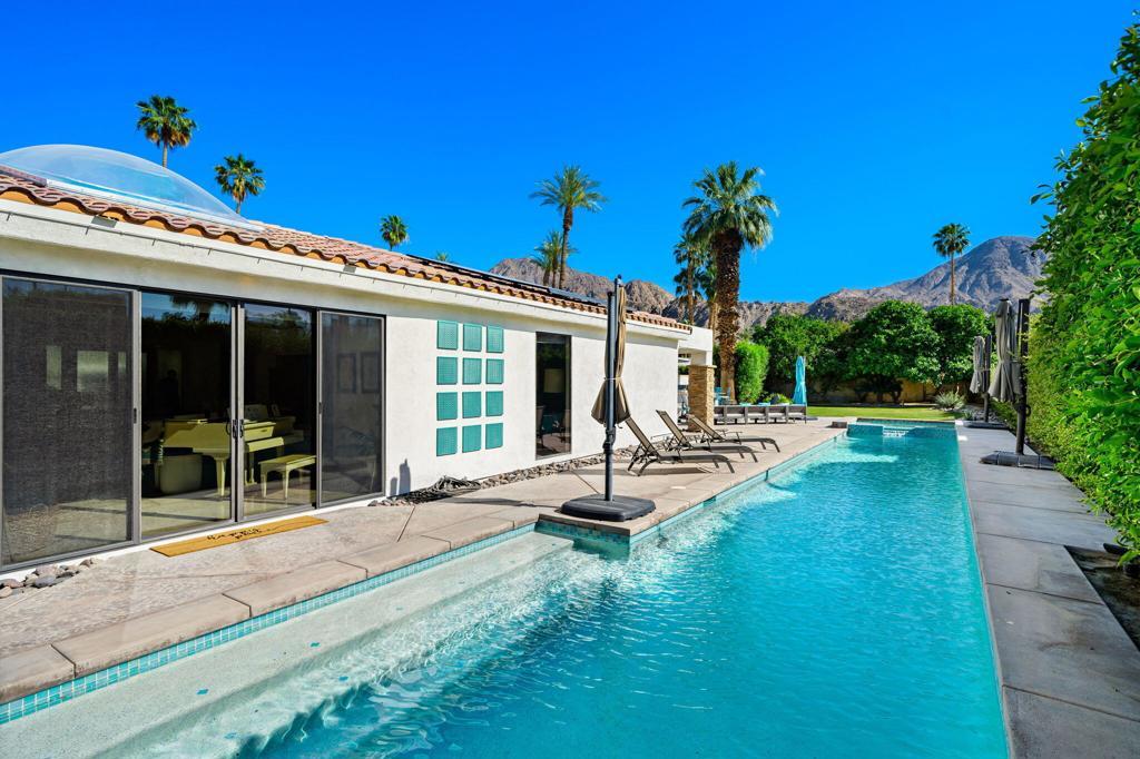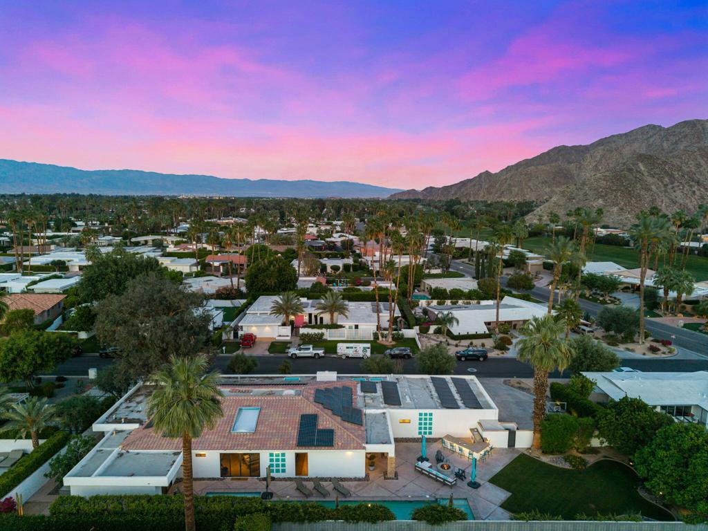 Indian Wells Luxury on .43 Acres | 84 Solar Panels | Lap Pool + Eisenhower Views. Desert modernism doesn't get more authentic than this. Conceived by a celebrated local designer, Vicki McDermott in 1978, this single-story Indian Wells estate carries the architectural DNA of the Palm Springs design tradition. Tasteful contemporary updates make it feel completely at home in 2026. Timeless character, gracious proportions, and a one-of-a-kind provenance that simply cannot be replicated. At 5,323 square feet on nearly a half acre, this is the largest home and lot on the street. A genuinely custom offering at a scale that is increasingly rare in Indian Wells. The soaring great room, with ceilings over 22 feet high, two statement fireplaces, travertine floors, exposed beams, and solid alder wood doors and trim throughout deliver architectural character that no newer construction can touch. Five bedrooms offer flexible configurations, a primary suite and junior suite each with private en-suite baths, two additional bedrooms sharing a Jack-and-Jill bath, a dedicated guest bath off the playroom, and a private walled entry courtyard with a tranquil water feature. Multiple sets of sliding glass doors create seamless indoor-outdoor flow out to your private desert oasis with panoramic mountain views. Outside, the lap pool and spa anchor a true entertainer's paradise. Built-in Alfresco professional grill, outdoor bar with sink, gas fire pit, full mister system, and smart exterior lighting throughout. The fully walled grounds are framed by mature privacy hedges, a towering Washingtonian palm, and a working citrus and fig orchard, tangelo, orange, and fig trees that produce generously in season. The 84-panel owned solar array means energy costs that are a fraction of comparable properties. A Tesla EV charger, epoxy-sealed garage floor, and full permitted natural gas system replacement round out an infrastructure story with zero deferred maintenance questions. No HOA. No gates. No monthly fees. Indian Wells prestige, walking distance to Eldorado Country Club, Indian Wells Country Club, and The Vintage Club, and minutes to the BNP Paribas Open and El Paseo. Whether you are here for tournament season or year-round desert living, this is complete California freedom on your own terms. Furnishings available separately. This home can be turn-key for the right buyer.