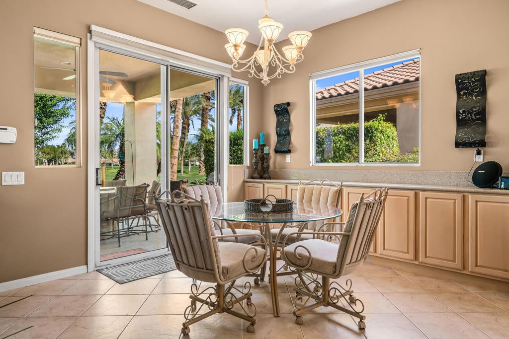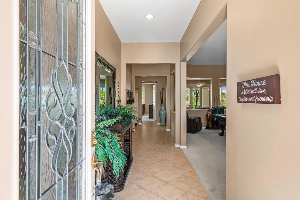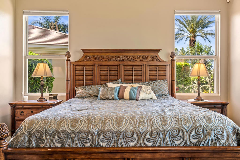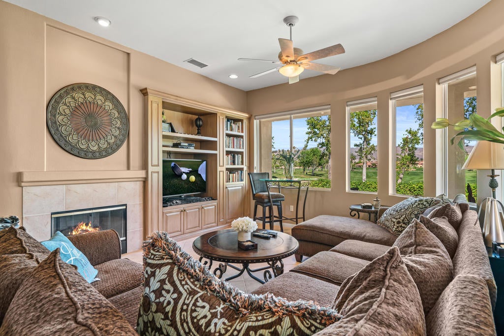 SPECTACULAR PANORAMIC VIEWS from this 2504 sq.ft. 3 bedroom, 2.5 bath home with pool & spa! This home is also being offered TURNKEY FURNISHED. Featuring a courtyard entrance with leaded glass entry door, open plan layout with cozy winter fireplace in the family room, Island kitchen design with DBL ovens and loads of storage cabinetry. Both of the guest bedrooms allow for King size beds and are divided by a 'Jack & Jill' DBL vanity bathroom with large shower. There is also a convenient powder room for guests as well. The spacious primary bedroom has the optional bay window, soaking tub with separate shower, large walk-in closet, and French door to your PRIVATE pool/spa area with large covered rear patio with built-in infrared heater. Heritage Palms is a premier adult community featuring an 18 hole championship golf course, pickleball courts, tennis courts, indoor & outdoor pools, fitness center, grill room, billiards room, card rooms, social clubs and more.