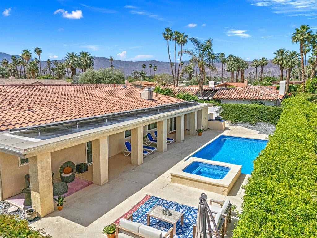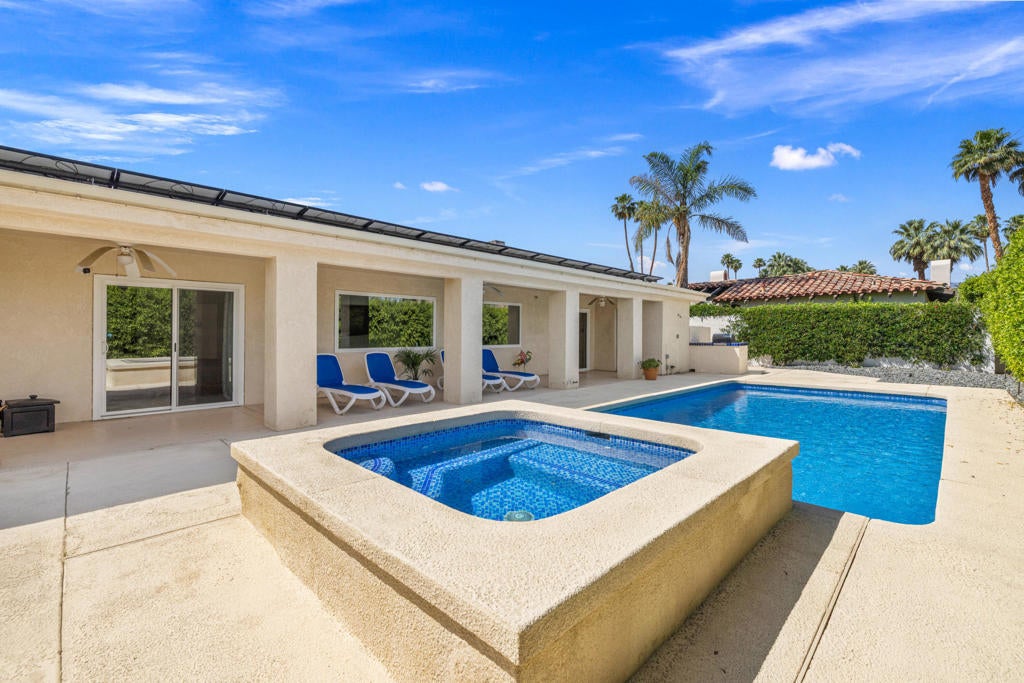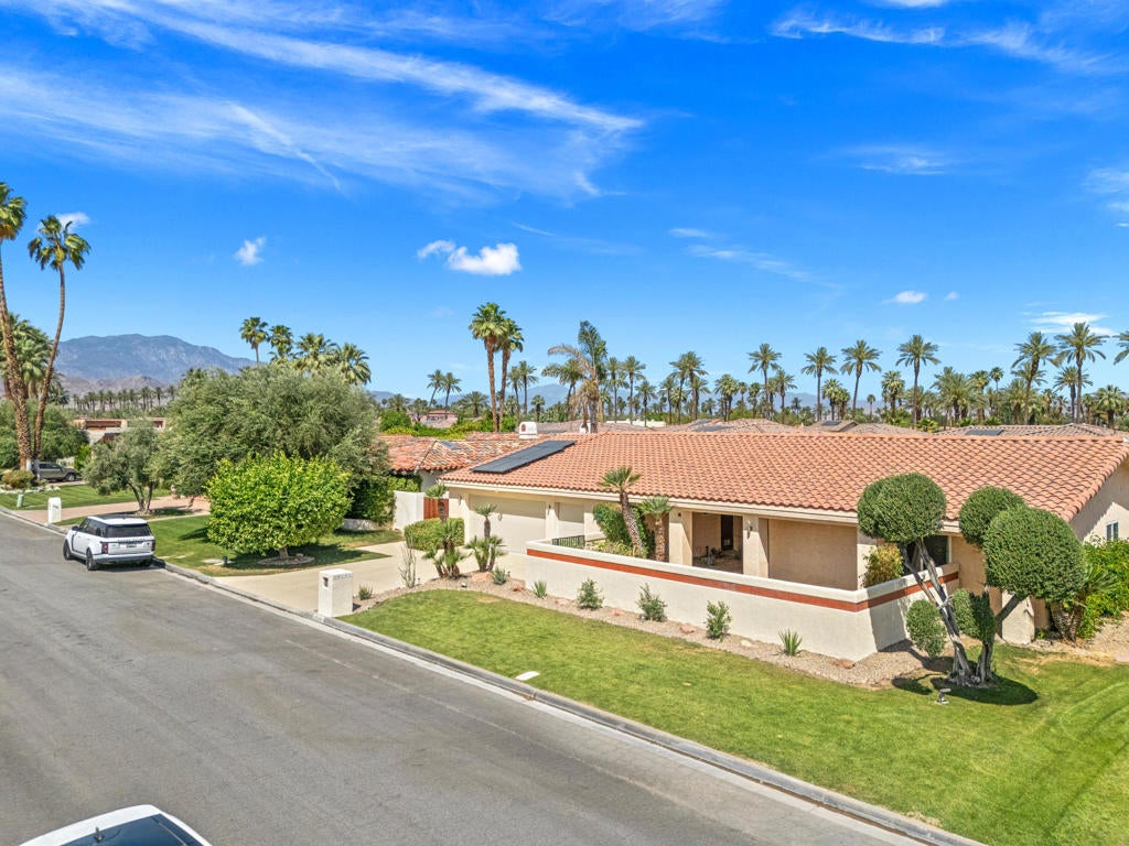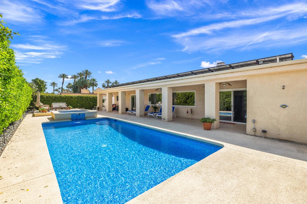 Set within one of Indian Wells' most desirable neighborhoods, this beautifully maintained furnished residence offers 2,124 square feet, 3 bedrooms, 2.5 baths, and a 2-car plus golf cart garage on an expansive 10,019 square foot lot. Ideally situated near shopping, dining, and the exceptional benefits enjoyed by Indian Wells residents, this inviting home offers comfort, space, and an effortless desert lifestyle. A newly landscaped south-facing courtyard and double-door entry create a gracious sense of arrival. Inside, the spacious great room is enhanced by high ceilings, a handsome stucco fireplace, and beautiful sightlines drawing the eye to the pool and outdoor spaces. The floor plan also features a formal dining area and a versatile bonus room, ideal for a library, office, or fitness space. Designed for seamless indoor-outdoor living, the backyard showcases a large rectangular, blue-tiled pool, jet spa, covered patio, extended patio spaces, and a built-in barbecue--perfect for entertaining or relaxation. The north-facing rear yard offers privacy, while the front courtyard captures south mountain views, The kitchen features granite countertops and backsplash, a center island with storage, stainless steel appliances, a Viking cooktop, large refrigerator, and updated fixtures. The private primary suite offers a high ceiling, large walk-in closet, dual vanity, soaking tub, spacious walk-in shower, and sliders opening directly to the pool and spa. One guest bedroom enjoys a beautiful south-facing mountain view and hard wood floors. Additional highlights include new paid solar, new HVAC and Lennox thermostat, new modern ceiling fans, new glazed gray porcelain tile flooring, plush carpet in select bedrooms, generous built-in storage, and no HOA.