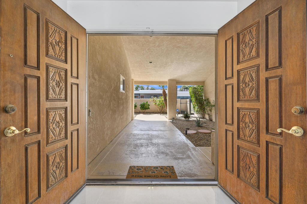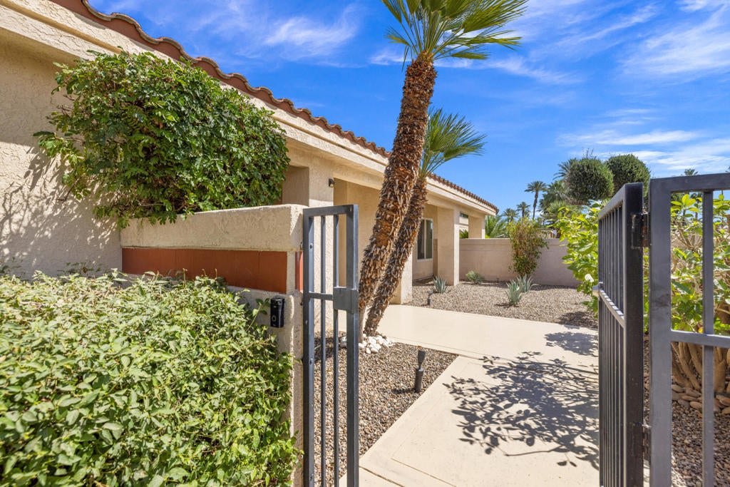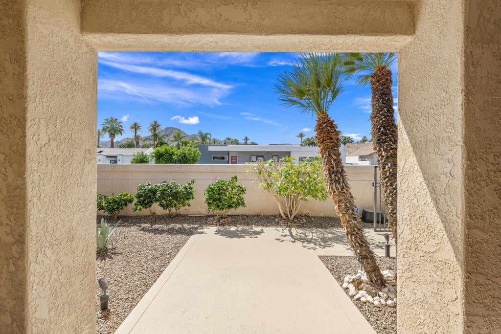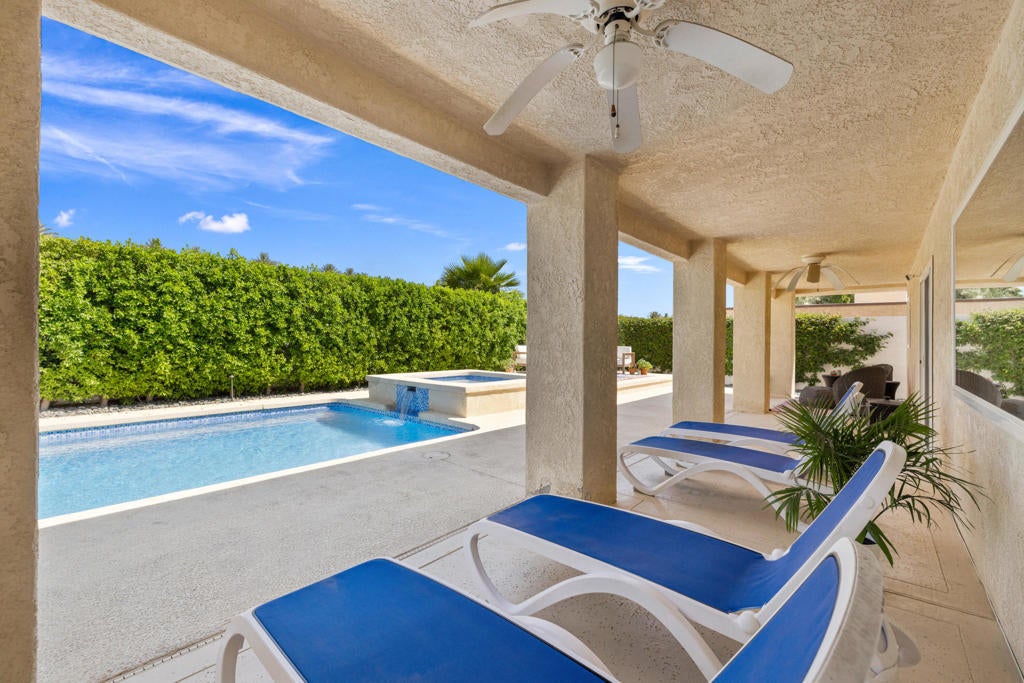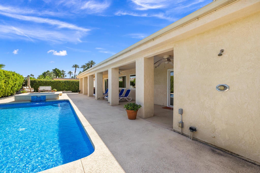 Set within one of Indian Wells' most desirable neighborhoods, this beautifully maintained furnished residence offers 2,124 square feet, 3 bedrooms, 2.5 baths, and a 2-car plus golf cart garage on an expansive 10,019 square foot lot. Ideally situated near shopping, dining, and the exceptional benefits enjoyed by Indian Wells residents, this inviting home offers comfort, space, and an effortless desert lifestyle. A newly landscaped south-facing courtyard and double-door entry create a gracious sense of arrival. Inside, the spacious great room is enhanced by high ceilings, a handsome stucco fireplace, and beautiful sightlines drawing the eye to the pool and outdoor spaces. The floor plan also features a formal dining area and a versatile bonus room, ideal for a library, office, or fitness space. Designed for seamless indoor-outdoor living, the backyard showcases a large rectangular, blue-tiled pool, jet spa, covered patio, extended patio spaces, and a built-in barbecue--perfect for entertaining or relaxation. The north-facing rear yard offers privacy, while the front courtyard captures south mountain views, The kitchen features granite countertops and backsplash, a center island with storage, stainless steel appliances, a Viking cooktop, large refrigerator, and updated fixtures. The private primary suite offers a high ceiling, large walk-in closet, dual vanity, soaking tub, spacious walk-in shower, and sliders opening directly to the pool and spa. One guest bedroom enjoys a beautiful south-facing mountain view and hard wood floors. Additional highlights include new paid solar, new HVAC and Lennox thermostat, new modern ceiling fans, new glazed gray porcelain tile flooring, plush carpet in select bedrooms, generous built-in storage, and no HOA.