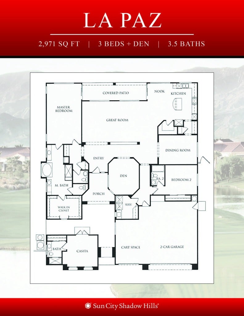 La Paz model with beautiful south-facing golf course and distant mountain views. Partially furnished. Detached casita with private courtyard will accommodate a space for guests and family! The large primary suite in a separate wing of the home has patio access and faces the golf course. The primary bath has dual sinks, including a vanity, large soaking tub and separate shower. A walk-in closet is located at the end of the bathroom. Kitchen is fully equipped with stainless steel appliances, granite slab countertops, kitchen island, breakfast area, butler's pantry, and walk-in pantry. New dishwasher and microwave. There is a separate formal dining room, perfect for entertaining. Shutters and flooring were added recently. The den can be used as an office or converted to an additional bedroom. Sun City Shadow Hills is one of the premiere communities for active senior living in the desert. Amenities include 2 Clubhouses, a restaurant, community pools, tennis and pickle ball courts, one championship golf course and one challenging executive golf course. Come see this wonderful golf course home in one of the best locations within the community. Call for a private showing today!