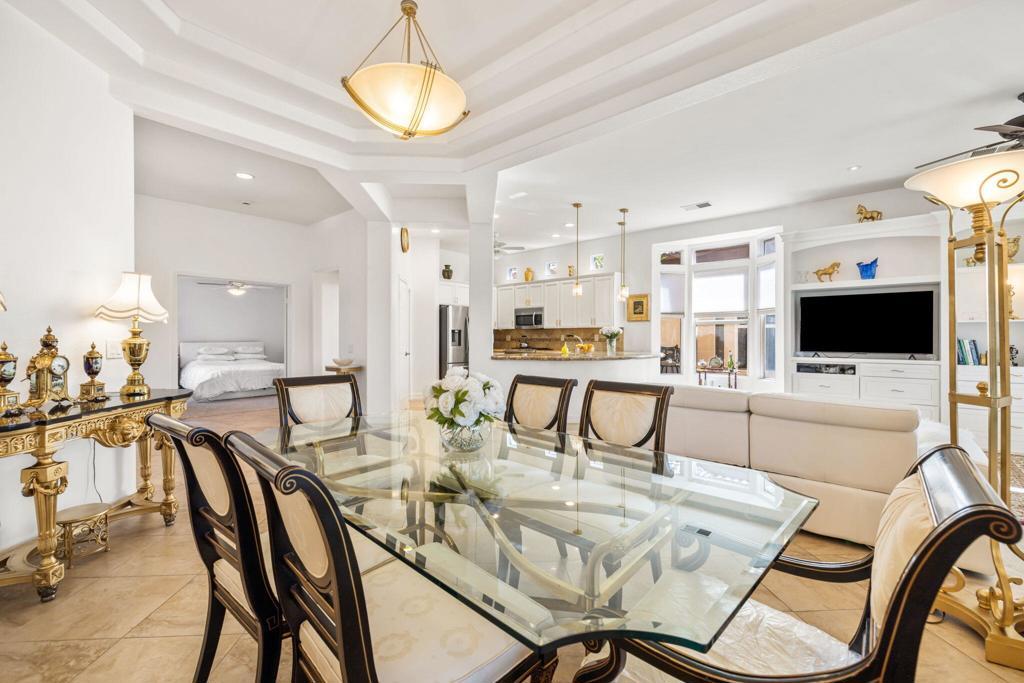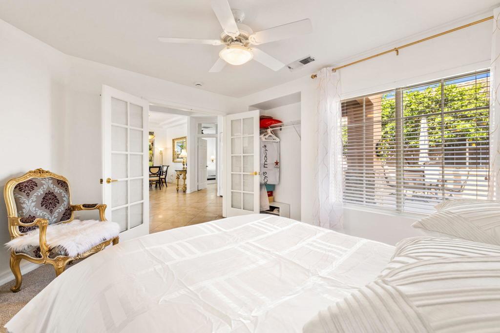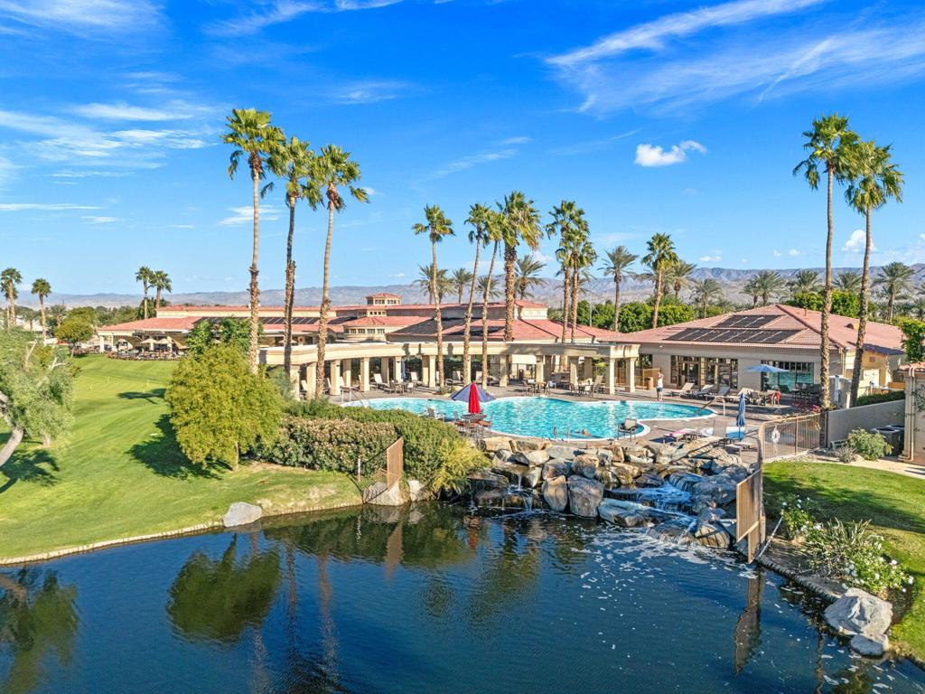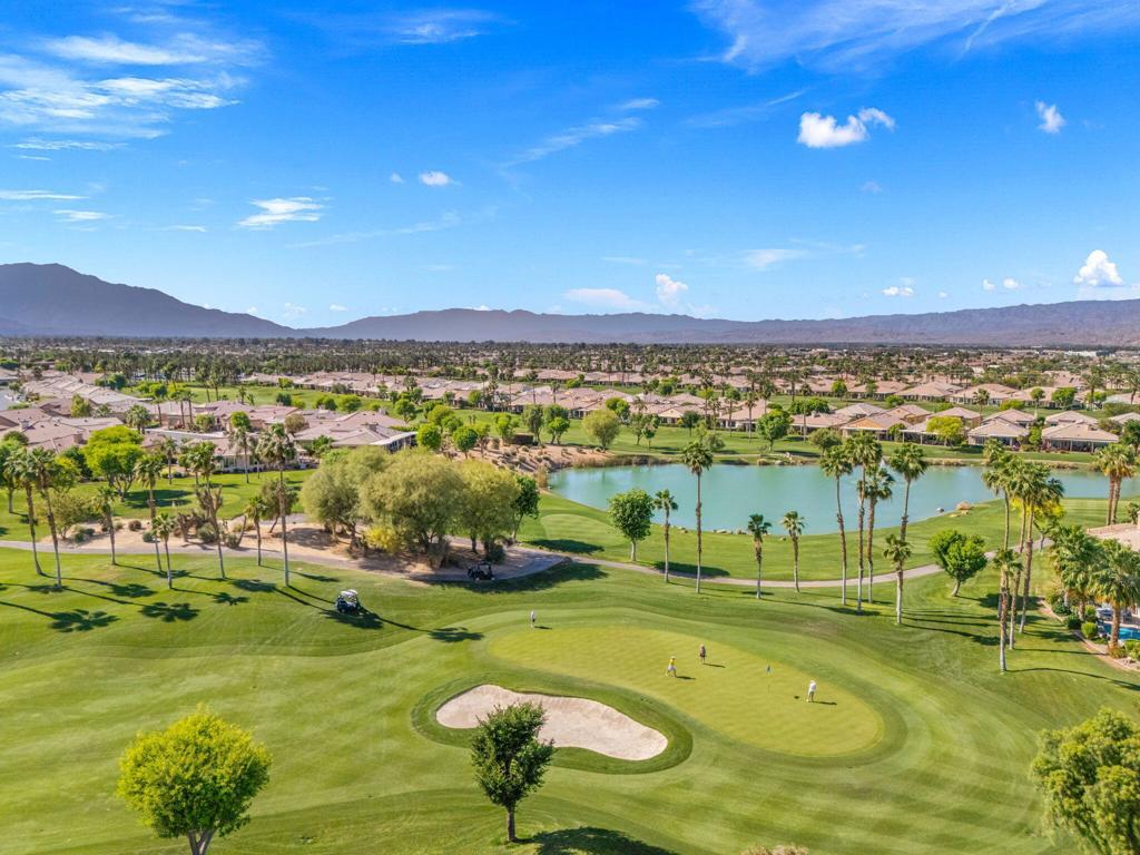 Offered in the sought-after Heritage Palms Country Club, this upgraded residence delivers a perfect balance of relaxed desert living and refined design. From the moment you arrive, the home stands out with its stone-accented exterior, paver driveway, and inviting courtyard. Inside, the main living area is designed for easy living and entertaining, featuring oversized tile set on the diagonal, elevated baseboards, a custom media built-in, and an abundance of natural light. Recent updates include new paint, new carpeting in all bedrooms and new window coverings throughout, adding a clean, cohesive finish. The kitchen is both functional and stylish, appointed with rich custom cabinetry, slab granite counters with a streamlined single-level island, stainless steel appliances, and modern pendant lighting that anchors the space. Both bathrooms have been refreshed with a contemporary touch, showcasing walk-in tile showers, updated vanities, stone countertops, and upgraded fixtures. Outdoors, the backyard is designed to take full advantage of the surroundings, with a generous covered patio featuring flagstone detailing, an Alumawood structure, built-in BBQ, and open views across the fairway to the mountains beyond. Major systems have been addressed with a newer A/C and water heater, and the garage includes the added convenience of a laundry sink. Residents of Heritage Palms enjoy access to a premier 55+ lifestyle, including championship golf, resort-style pools (indoor and outdoor), pickleball and tennis, a full fitness center, clubhouse dining, and an active calendar of social events.