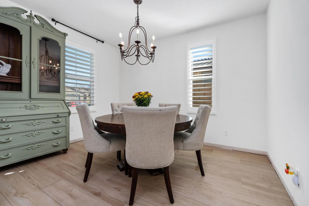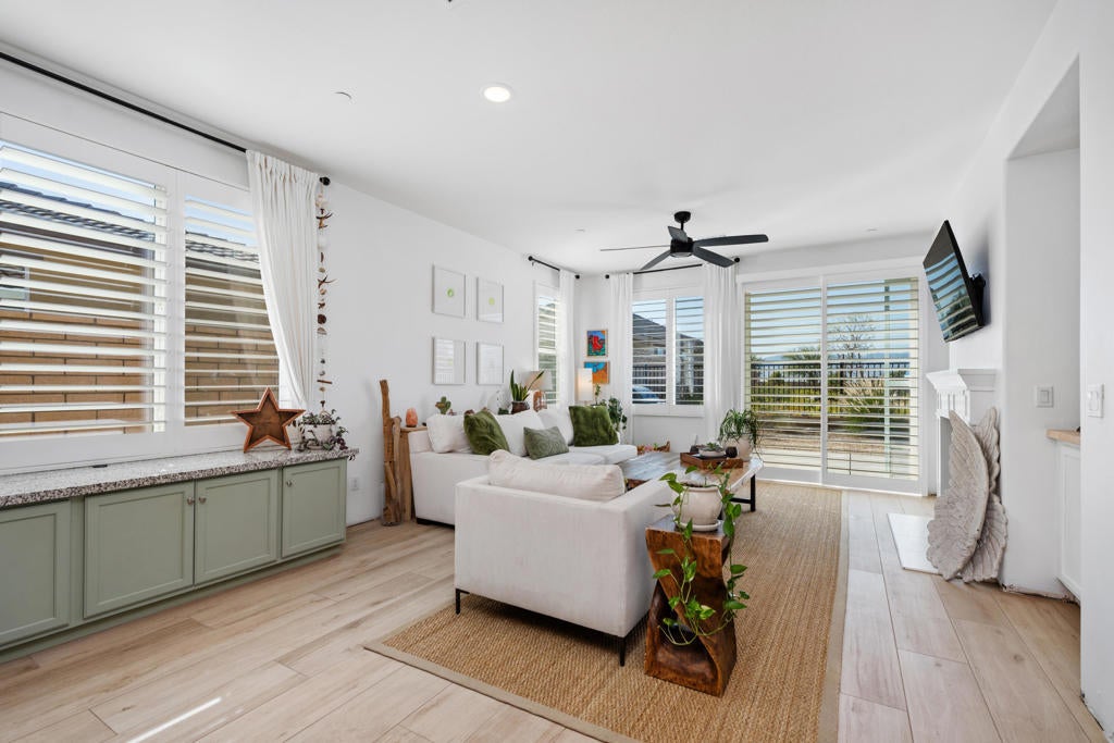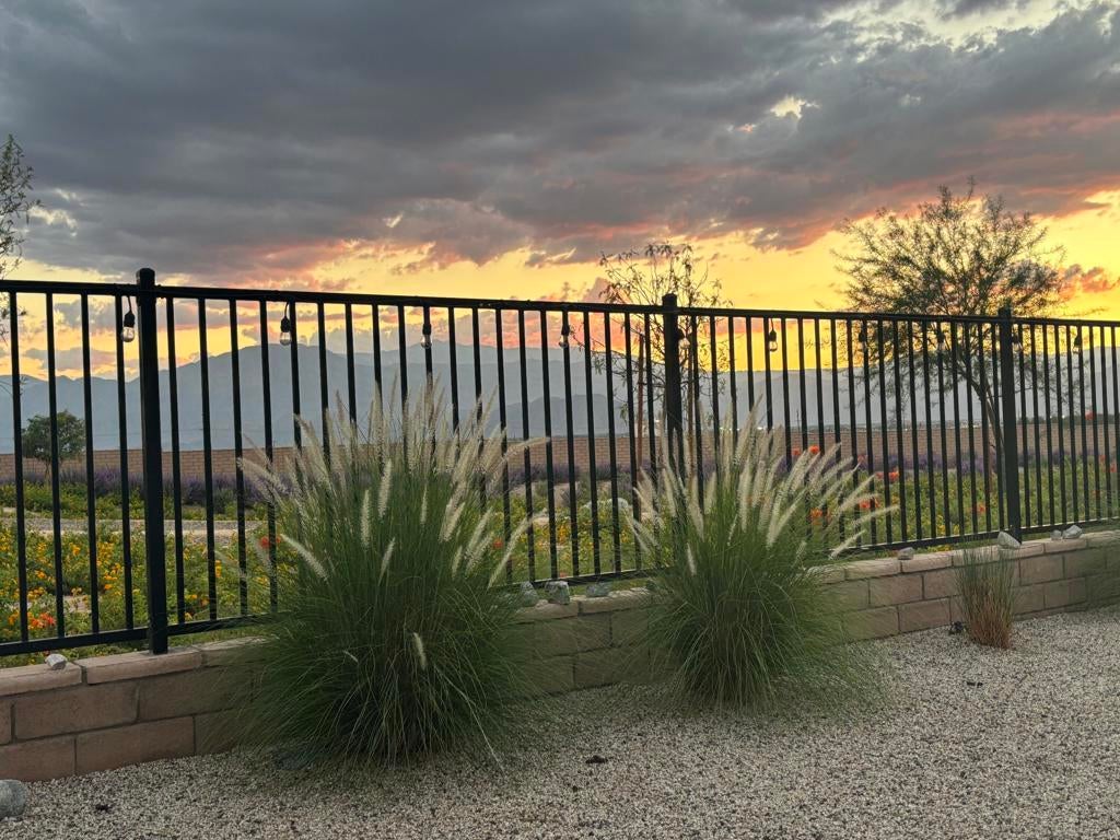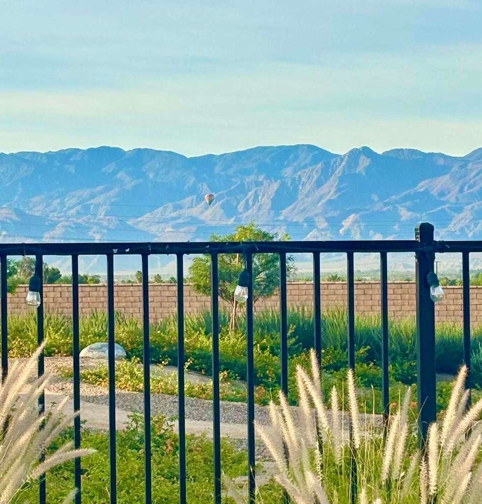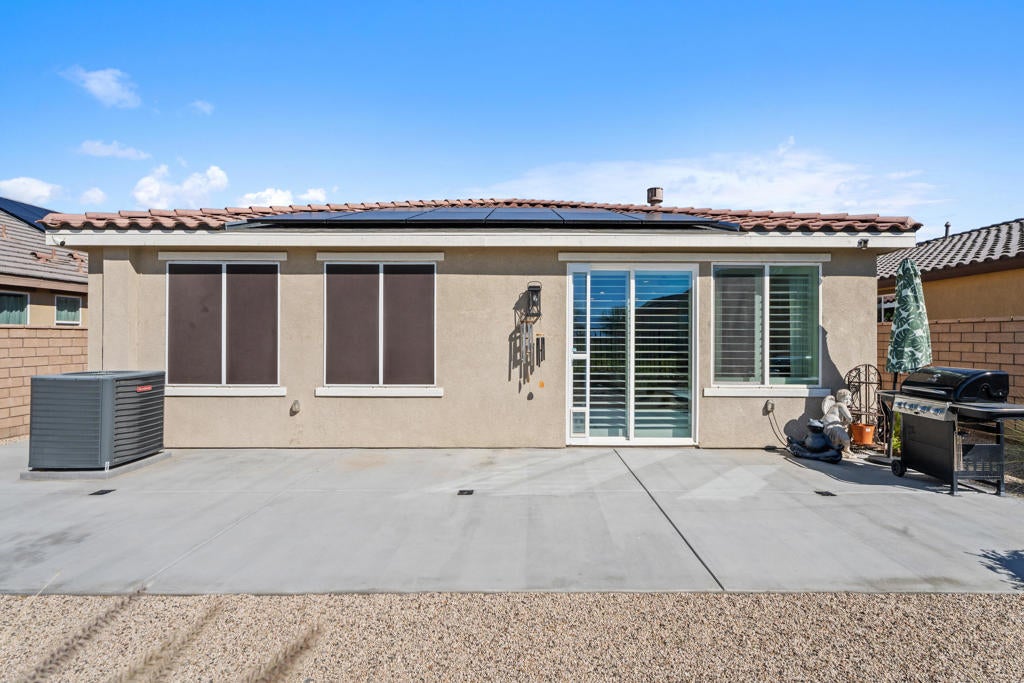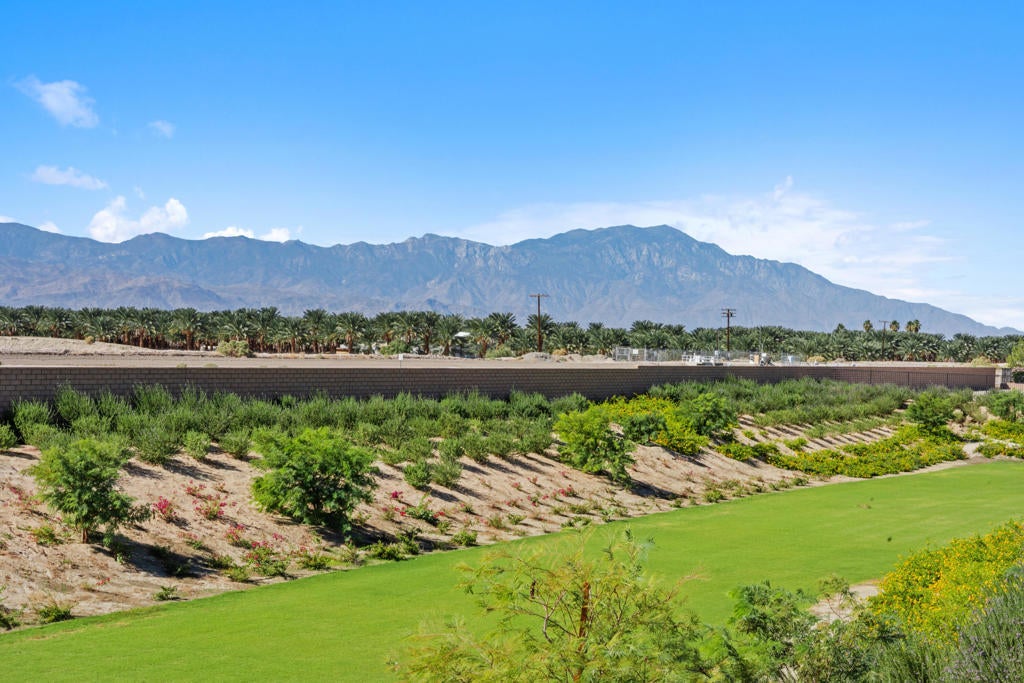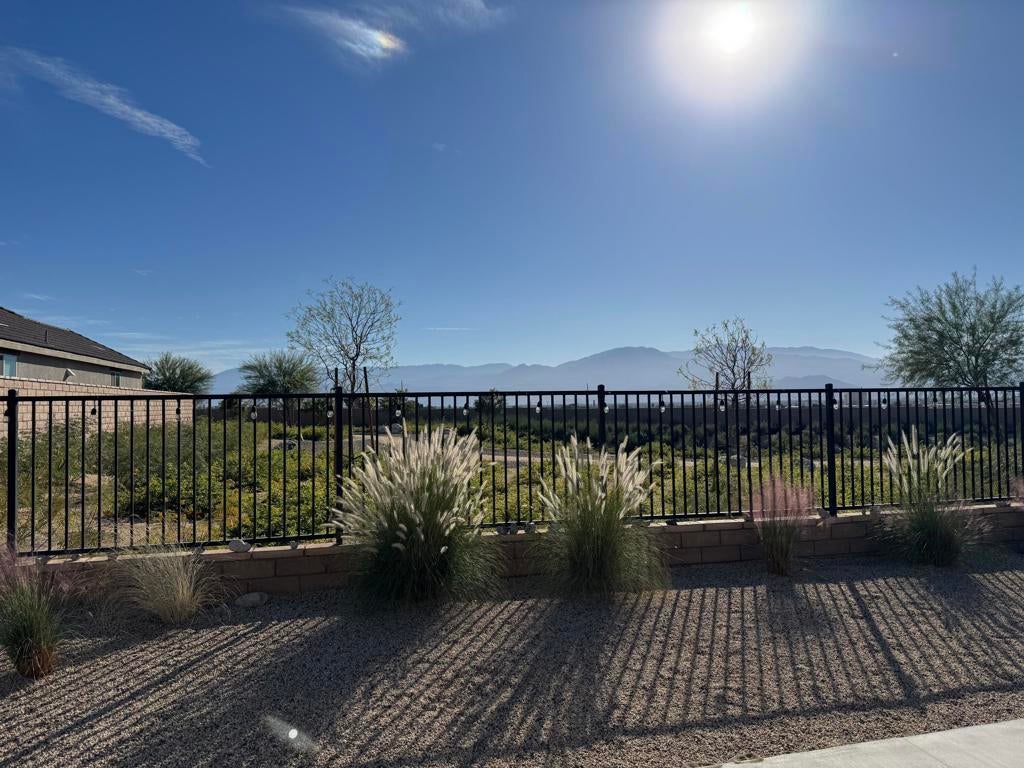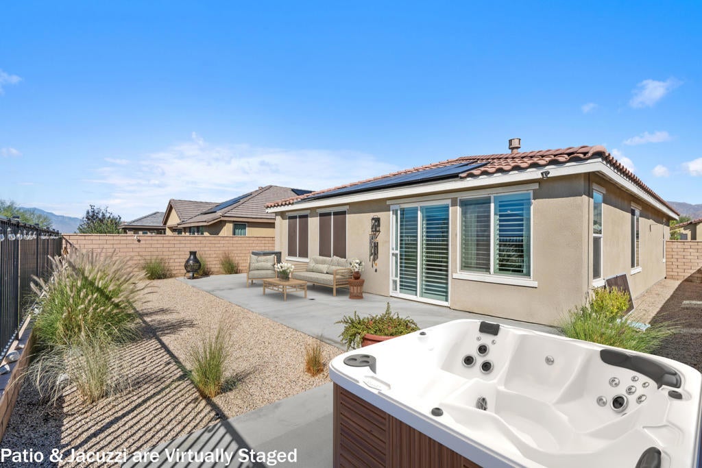 Charming and meticulously maintained 2-bedroom PLUS DEN, 2-bath home (1,555 SF). From the moment you enter through the custom iron front door, it's clear no detail has been overlooked. The welcoming foyer opens to a bright great room with abundant natural light, enhanced by plantation shutters throughout and a cozy gas fireplace that sets a relaxing tone. Beautiful tile flooring flows through the main living areas, creating a sense of calm and cohesion. The kitchen features stylish cabinetry, slab granite countertops, and a generous pantry, making it both functional and inviting. Step outside through sliding glass doors to a private backyard with stunning south and southwest mountain views and amazing sunsets. The wrought iron rear fence preserves the view of the desert landscape for uninterrupted vistas. The backyard has hookups to accommodate a spa. The spacious primary suite offers large windows framing breathtaking views. Inside the primary bath are dual vanities, and a large walk-in closet. A secondary bedroom and full bath are thoughtfully located down a private hallway, providing comfort and privacy for guests. The den provides ample space to be used as a formal dining room, office or potential third bedroom. Solar panels/solar shades provide extra energy efficiency.Welcome to Four Seasons at Terra Lago--an active 55+ resort-style community offering a beautifully designed clubhouse with social spaces, a modern fitness center, indoor/outdoor pools, tennis, basketball and bocce courts, a library, craft room, and clubs ranging from book discussions to watercolor painting. Whether you seek adventure, wellness, or connection, this vibrant community offers it all--just minutes from dining, shopping, and entertainment at Fantasy Springs Resort and Spotlight 29 Casino.