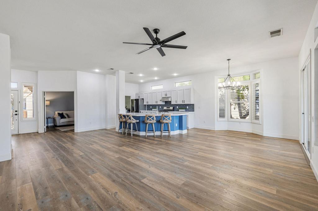 BEST opportunity to buy this beautiful home PRICED TO SELL in the Heritage Palms 55+ community!! This 2 bed/2 bath PLUS DEN is THE popular Merion floor plan & ready for new owners to enjoy! The curb street appeal is eye catching with a paver driveway and walkway, artificial grass/luscious landscaping, and an expansive front courtyard for entertaining or relaxing. Upon entering, the open floor plan is very inviting with luxury vinyl plank flooring leading to the great room and gorgeous kitchen. Stainless steel appliances, double door pantry, custom painted cabinetry, and quartz counters will encourage time spent in this chef's kitchen! A nice sized laundry room leads to the 2 car garage. The primary suite includes a renovated bathroom with double vanities, tiled shower, and quartz countertops. The linen closet, and huge custom walk in closet are nice features in the oversized primary bedroom with lots of windows and light. A second bedroom & bathroom plus den complete the inside of this home. BONUS feature-PRIVATE backyard containing a covered patio, built-in bbq, grassy area (perfect for dogs!) PLUS a beautiful water feature that promotes relaxation with special lighted ambiance at night. Approximately $70,000 spent on home improvements since Fall of 2023- HVAC system, quartz counters, lighting, water heater, paint, dishwasher, refrigerator, picture windows, light fixtures, garage a/c, built-in BBQ, 7ft sliding door plus more! This home is located close to the clubhouse with all the fun amenities- tennis, pickleball, golf, dining, card rooms, billiards, fitness, indoor pool, outdoor pool, and lots of social clubs! Don't miss the opportunity to buy this updated home at an amazing price, and then enjoy the wonderful lifestyle at Heritage Palms!! (A few pictures have been virtually staged.)