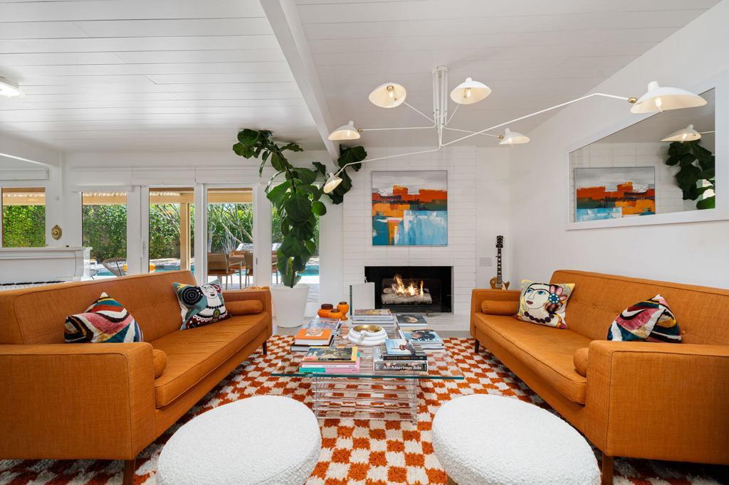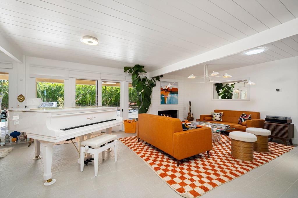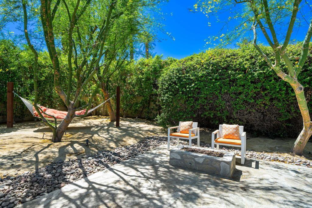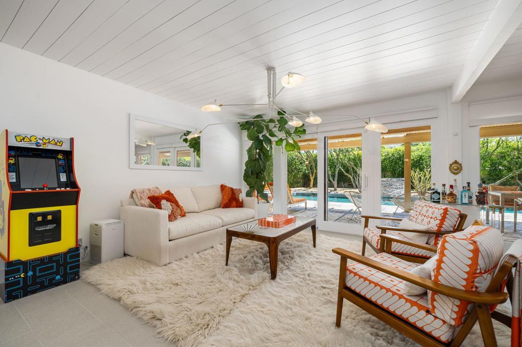Located in the desirable Rancho Palmeras neighborhood of Indian Wells, this sleek and beautifully updated 1959 mid-century modern rancher embodies effortless desert living. Thoughtfully designed to live large both indoors and out, the home flows seamlessly from its open-concept core to its expansive and private south-facing backyard.A sweeping semi-circular driveway leads through the open carport to a recessed formal entry, where striking architectural double doors--framed by sidelight windows--welcome you into the foyer, dining, and living areas. Signature mid-century elements shine throughout, including an original cement block fireplace, tongue-and-groove beamed ceilings, statement modernist lighting, and elegant stone-finish porcelain tile flooring.Walls of floor-to-ceiling glass with inset French doors create a seamless indoor-outdoor connection, opening to an impressive backyard retreat featuring expansive Alumiwood pario cover, firepit, and a lap-size swimming pool with diving board with a dark-bottom PebbleTec finish.The bold, bright kitchen has been fully updated with newer appliances, custom cabinetry, and sleek white quartz countertops, including a waterfall-edge bar with flexible space for dining or casual lounge seating. The kitchen flows directly into a spacious laundry room and an oversized storage/workroom, offering both function and versatility.Both the primary suite bath and guest bath have been fully remodeled with striking, contemporary finishes, while each bedroom enjoys direct outdoor access--enhancing the home's connection to its surroundings.This is a rare opportunity to own a timeless mid-century home--thoughtfully updated, impeccably maintained, and designed for relaxed, sophisticated desert living.Home to be sold furnished via seller-provided inventory list