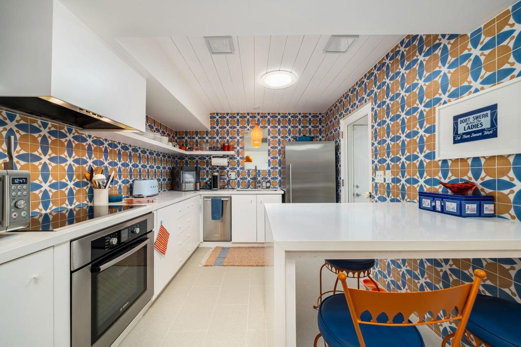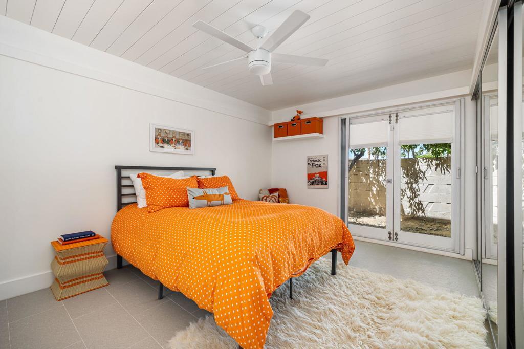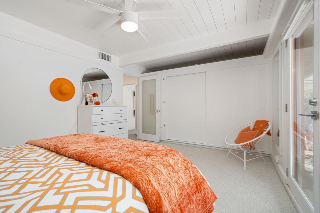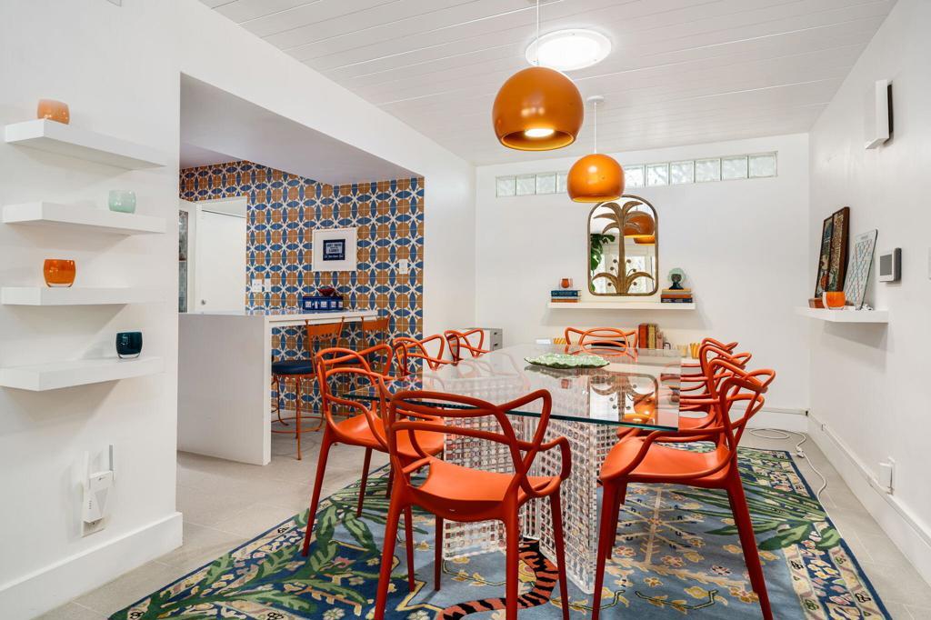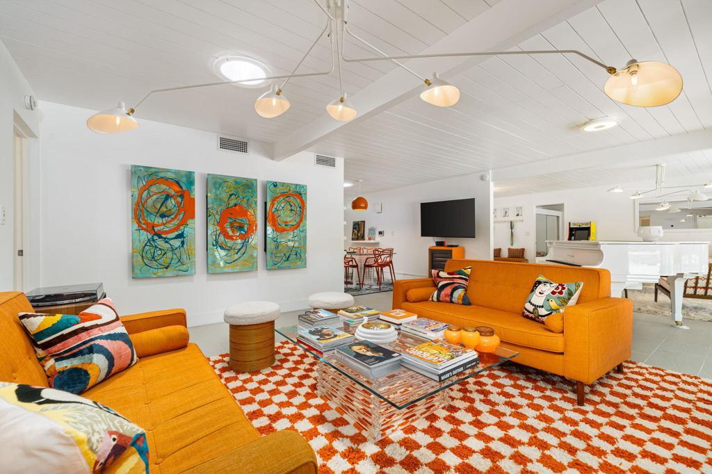 Located in the desirable Rancho Palmeras neighborhood of Indian Wells, this sleek and beautifully updated 1959 mid-century modern rancher embodies effortless desert living. Thoughtfully designed to live large both indoors and out, the home flows seamlessly from its open-concept core to its expansive and private south-facing backyard.A sweeping semi-circular driveway leads through the open carport to a recessed formal entry, where striking architectural double doors--framed by sidelight windows--welcome you into the foyer, dining, and living areas. Signature mid-century elements shine throughout, including an original cement block fireplace, tongue-and-groove beamed ceilings, statement modernist lighting, and elegant stone-finish porcelain tile flooring.Walls of floor-to-ceiling glass with inset French doors create a seamless indoor-outdoor connection, opening to an impressive backyard retreat featuring expansive Alumiwood pario cover, firepit, and a lap-size swimming pool with diving board with a dark-bottom PebbleTec finish.The bold, bright kitchen has been fully updated with newer appliances, custom cabinetry, and sleek white quartz countertops, including a waterfall-edge bar with flexible space for dining or casual lounge seating. The kitchen flows directly into a spacious laundry room and an oversized storage/workroom, offering both function and versatility.Both the primary suite bath and guest bath have been fully remodeled with striking, contemporary finishes, while each bedroom enjoys direct outdoor access--enhancing the home's connection to its surroundings.This is a rare opportunity to own a timeless mid-century home--thoughtfully updated, impeccably maintained, and designed for relaxed, sophisticated desert living.Home to be sold furnished via seller-provided inventory list