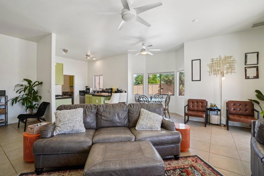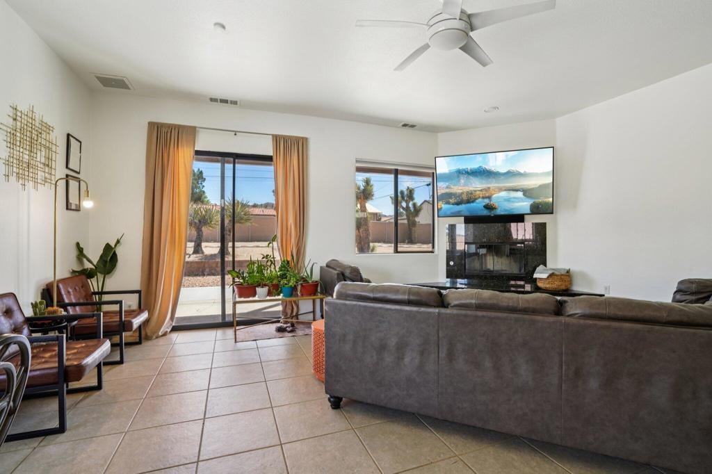 Discover a rare opportunity to own a custom-built Santa Fe-style home in the highly sought-after Sky Harbor neighborhood of Yucca Valley. This spacious 4-bedroom, 2-bath residence sits on over half an acre, offering a beautiful balance of comfort, style, and peaceful desert living.Step inside to soaring ceilings and an open-concept layout designed for both everyday living and effortless entertaining. Ceramic tile flooring flows through the main living areas and bathrooms, while newly installed luxury vinyl plank flooring adds warmth and durability to the bedrooms and closets.The thoughtfully updated kitchen features refreshed cabinetry, granite tile countertops, and a large walk-in pantry--perfect for both daily use and hosting gatherings. The inviting living area is centered around a cozy gas fireplace with a wall-mounted TV setup, creating a comfortable space to unwind. Additional upgrades include a soft water system and reverse osmosis system for added convenience and quality.The generously sized primary suite offers a relaxing retreat, complete with dual sinks, a spacious layout, and a walk-in closet. Each bedroom is equipped with ceiling fans and mirrored wardrobe doors, combining comfort with a touch of style.An indoor laundry room conveniently located just off the kitchen leads to the attached 3-car garage, while the extended driveway provides plenty of additional parking.Step outside to enjoy a fully fenced backyard with RV parking and rear vehicle access. The covered patio and newly added concrete create an ideal outdoor space for entertaining or simply enjoying quiet evenings under the desert sky.Located just minutes from the Black Rock Canyon entrance of Joshua Tree National Park, and within walking distance to scenic hiking trails and a local dog park, this home truly captures the essence of high desert living.