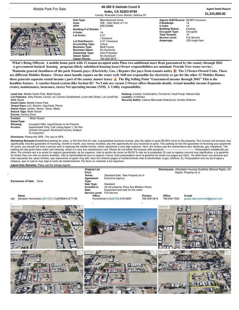 What's Being Offered A mobile home park with 12 tenant-occupied units Pluss 2 more. Rent guaranteed by the county through 2041 year. A government-backed housing program (likely subsidized housing lease) Owner responsibilities are minimal: o Provide Free water service.o Maintain general cleanliness of the park .o Tenants pay: (Electricity. Gas. Internet ) o Repairs (for pay from tenants' units) 🏠 The 2 Owner-Owned Units. These are different Mobiles Homes: Owner must handle repairs on the water well. Still not responsible for electricity or gas for the other 12 Mobiles Homes. These generate separate rental income (not part of the county master lease) 💰 The Big Selling Point 'Guaranteed income through 2041'This is the headline feature. o 🚩 No Units are vacant? 2. Owner offers financials details. o Actual monthly income o Expenses (water, maintenance, insurance, taxes) o Net operating income (NOI) 3. Utility responsibility.It says owner provides water service, And Maitane's service to the Well.4. Repairs 'not your responsibility on the 12 Mobiles Homes. Who owns each mobile home. Different tenants.Tenants own their homes (common in mobile home parks) That's a big advantage,5. The others 2 units or Mobiles Homes are owned by the sellers. These could: Add income two more Income, per month. 🧠 Bottom Line. This could be: A low-maintenance, stable cash-flow investmentA 'guaranteed' income. A summary of rent roll.As of today, I can tell you about the outcome regarding the parking situation: An APN (Assessor's Parcel Number) has been assigned to each individual parking space.This was done to ensure that every property could be uniquely identified; as humans, we tend to repeat numbers and street names, which creates issues for utility providers such as water and electricity companies. That is precisely what the County did: it subdivided the parcels of land upon which the mobile homes are situated. However, while the individual records for each lot now list the designation 'LEASE LAND,' the general property records still identify Jose and his wife as the legal owners.--------------------------------------Para preguntas y citas llama/texto:Salvador 760.409.3614