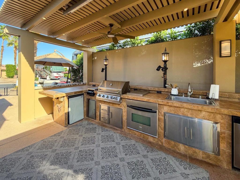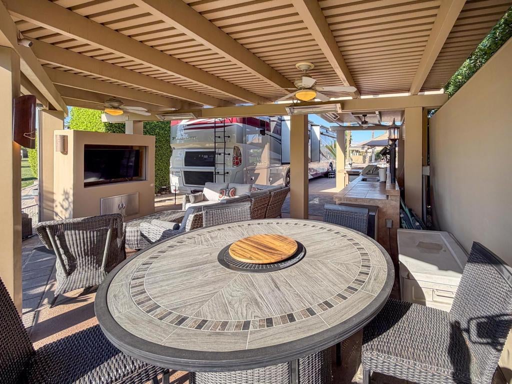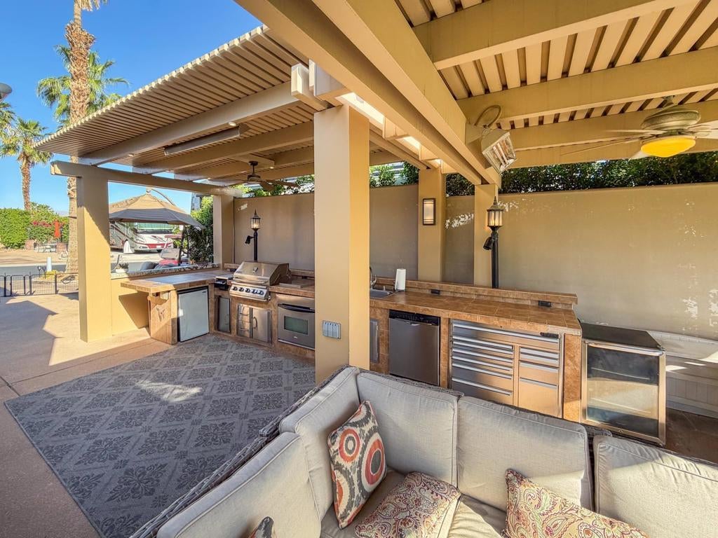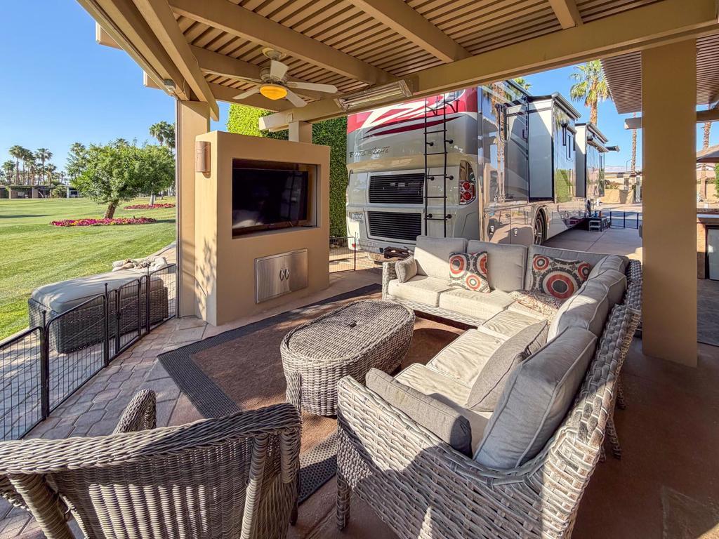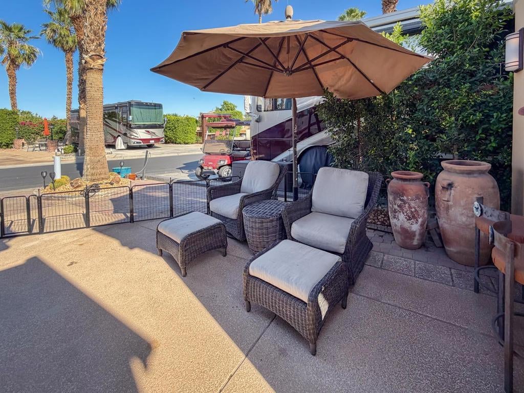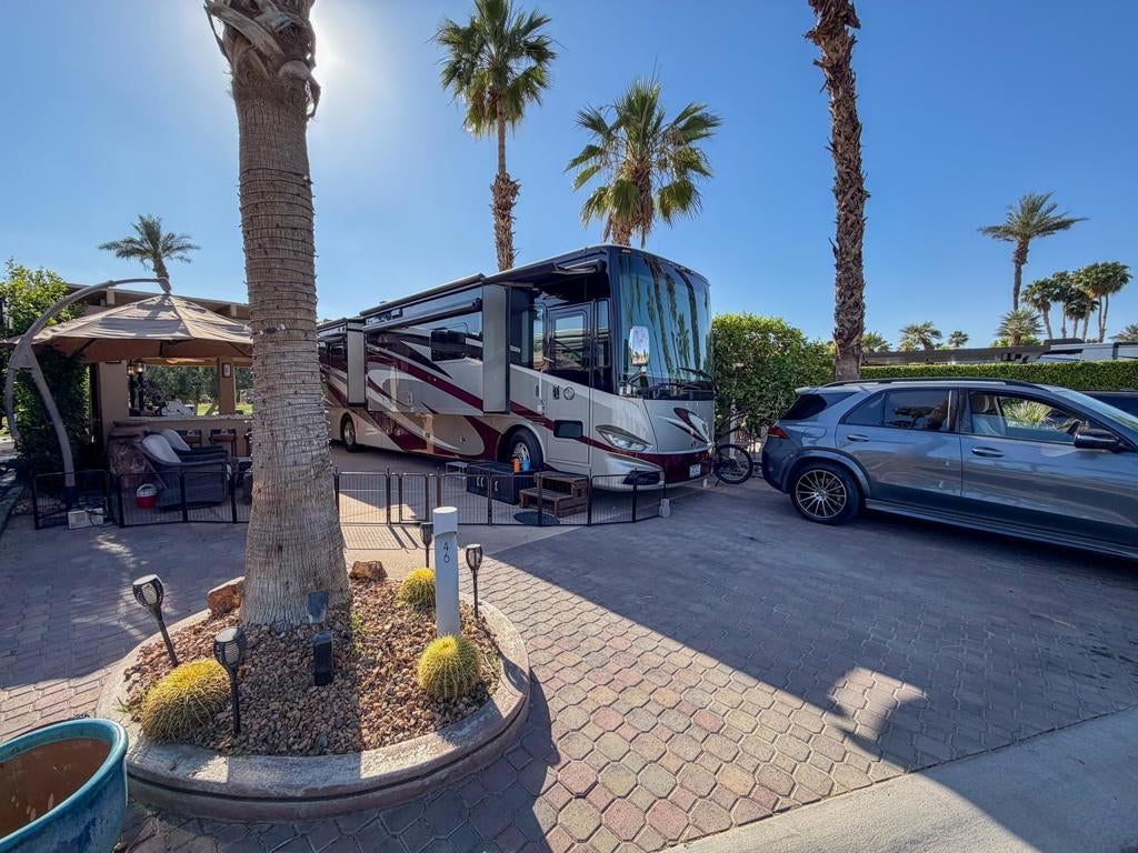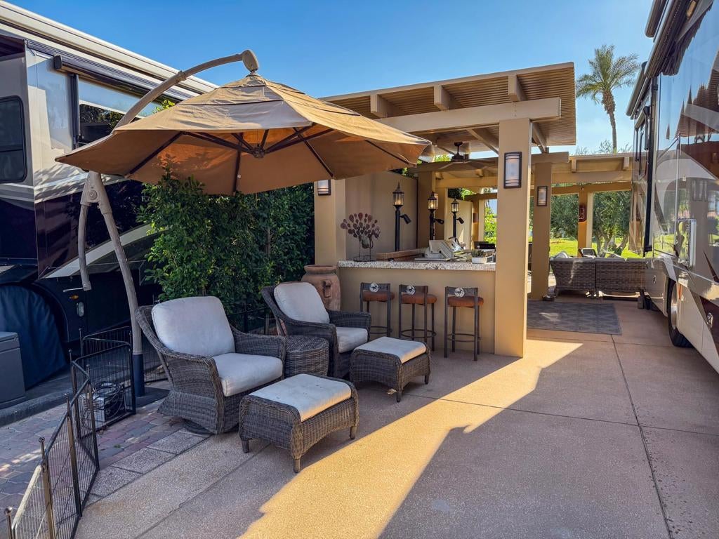 Outdoor Resort Indio is a Class A Motorcoach resort. Welcome to Lot 46 at Outdoor Resort Indio, a luxury golf course view lot designed for both entertaining and relaxed desert living. With sweeping fairway views and beautiful sunsets, this property combines scenery, comfort, and functionality in one of the most desirable Class A motorcoach resort settings in the Coachella Valley. The Cool Top concrete RV pad enhances comfort underfoot, while the location offers easy access and convenience within the resort.The large outdoor kitchen is truly the centerpiece, featuring a dishwasher, hot water, garbage disposal, refrigerator, oven, electric cooktop, gas burner, wine cooler, and built-in BBQ -- all surrounded by extensive stainless steel storage. The L-shaped pergola includes a section built just two years ago and a custom entertainment center with TV added three years ago. Electric and manual screens, three radiant heaters, and three ceiling fans allow you to control comfort.Outdoor seating areas include a fire table with six chairs and end table, a wicker L-shaped sofa set, and a wicker loveseat with ottoman -- creating multiple inviting spaces for gathering with friends and family. Located within walking distance to a satellite pool, hot tub, and laundry facilities, Lot 46 delivers the ideal balance of golf course views, sunset ambiance, and resort convenience at Outdoor Resort Indio.