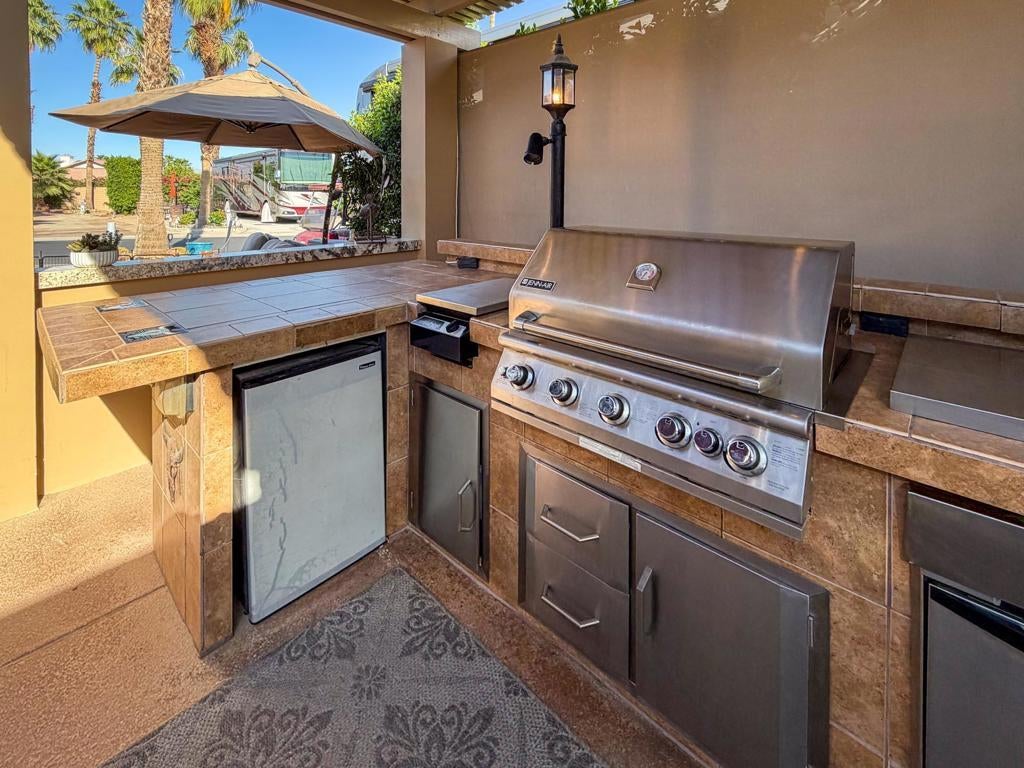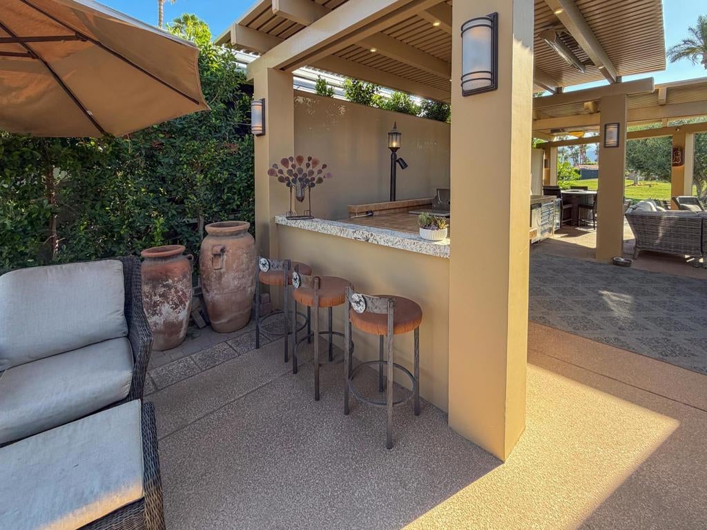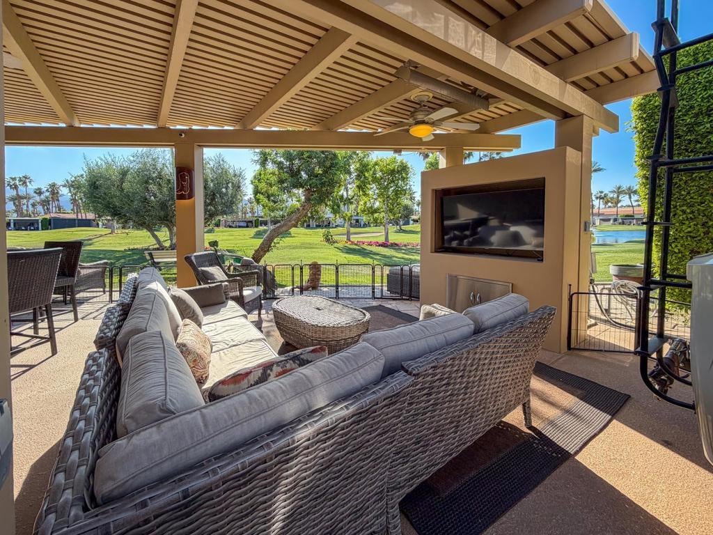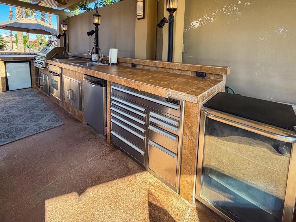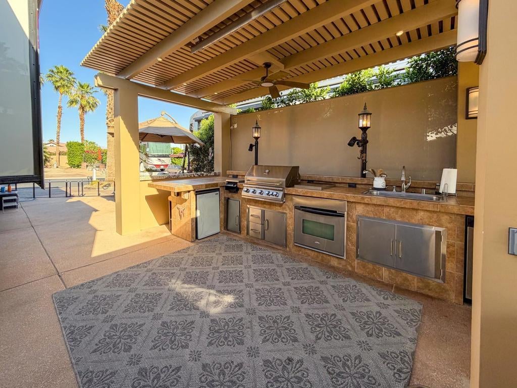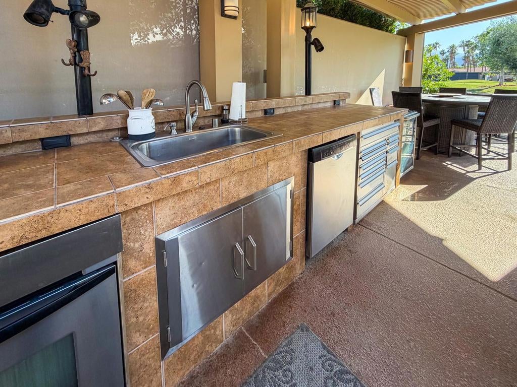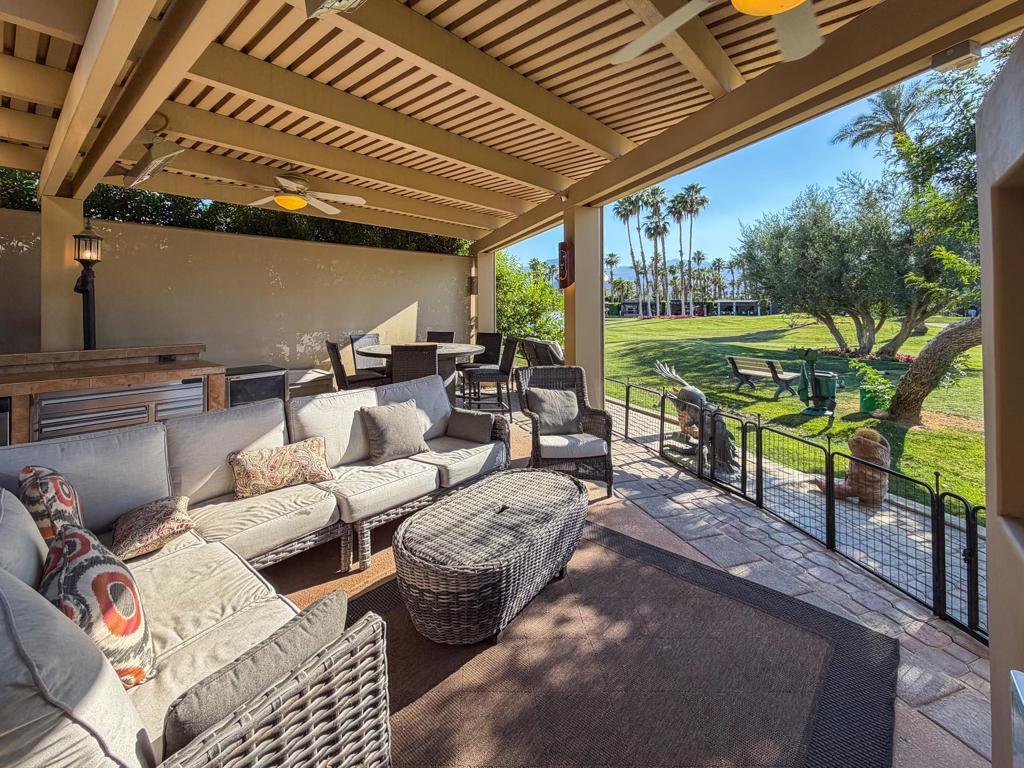 Outdoor Resort Indio is a Class A Motorcoach resort. Welcome to Lot 46 at Outdoor Resort Indio, a luxury golf course view lot designed for both entertaining and relaxed desert living. With sweeping fairway views and beautiful sunsets, this property combines scenery, comfort, and functionality in one of the most desirable Class A motorcoach resort settings in the Coachella Valley. The Cool Top concrete RV pad enhances comfort underfoot, while the location offers easy access and convenience within the resort.The large outdoor kitchen is truly the centerpiece, featuring a dishwasher, hot water, garbage disposal, refrigerator, oven, electric cooktop, gas burner, wine cooler, and built-in BBQ -- all surrounded by extensive stainless steel storage. The L-shaped pergola includes a section built just two years ago and a custom entertainment center with TV added three years ago. Electric and manual screens, three radiant heaters, and three ceiling fans allow you to control comfort.Outdoor seating areas include a fire table with six chairs and end table, a wicker L-shaped sofa set, and a wicker loveseat with ottoman -- creating multiple inviting spaces for gathering with friends and family. Located within walking distance to a satellite pool, hot tub, and laundry facilities, Lot 46 delivers the ideal balance of golf course views, sunset ambiance, and resort convenience at Outdoor Resort Indio.