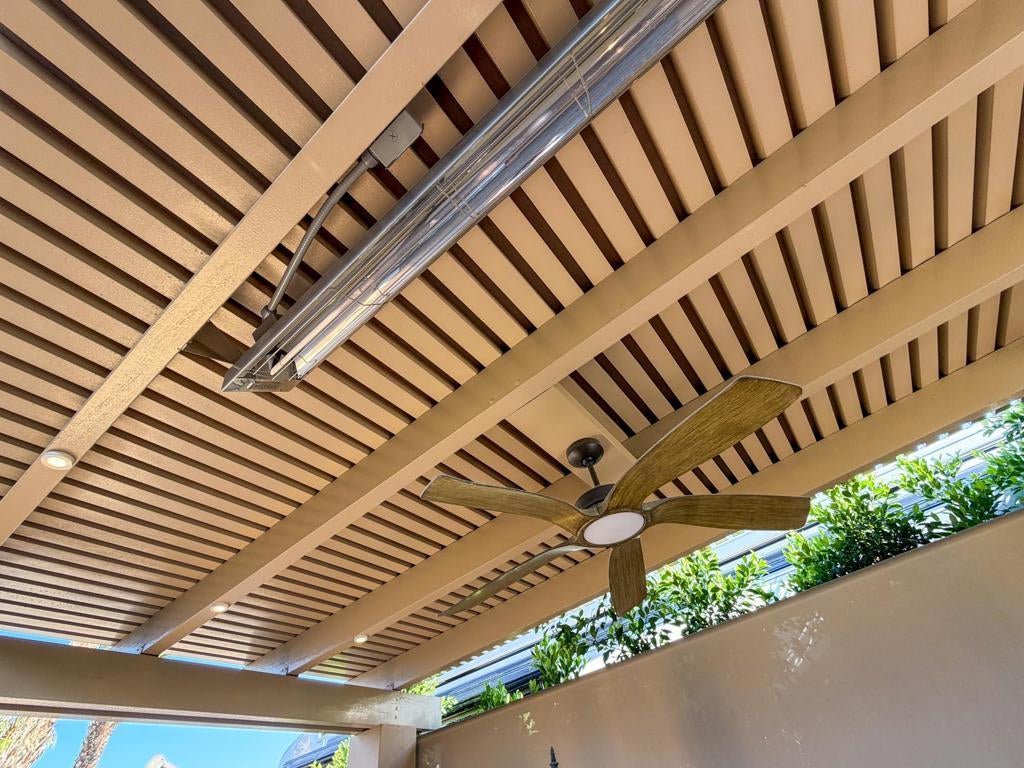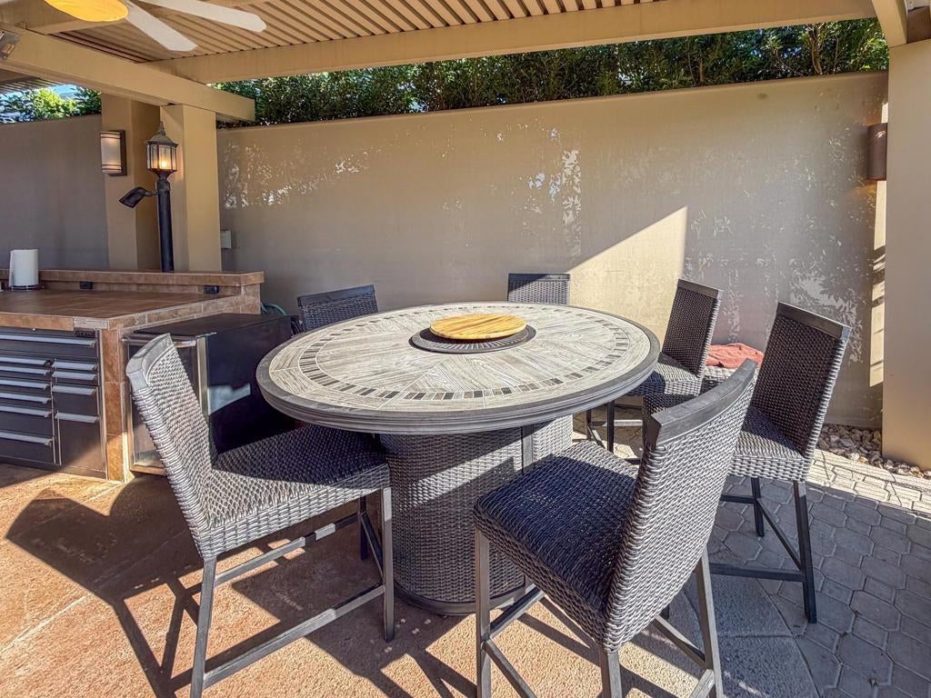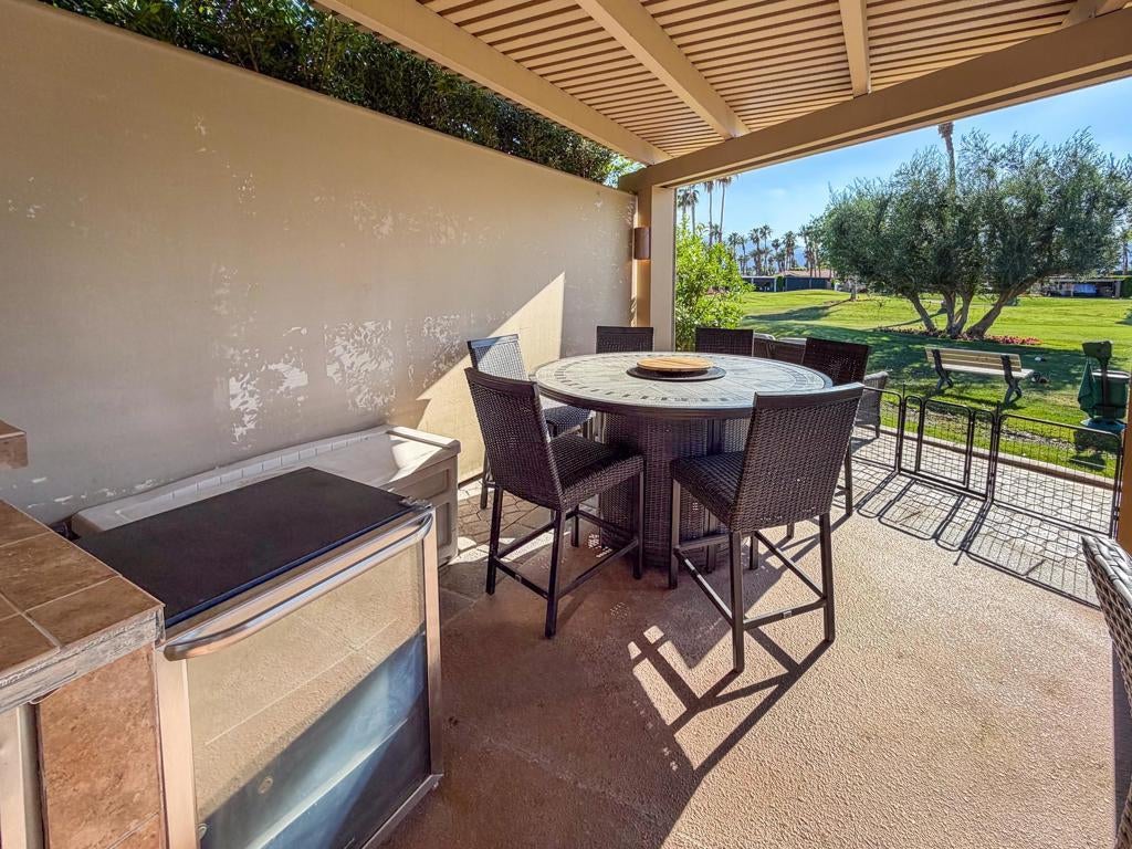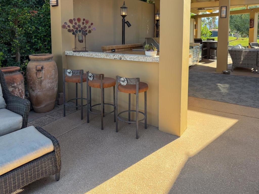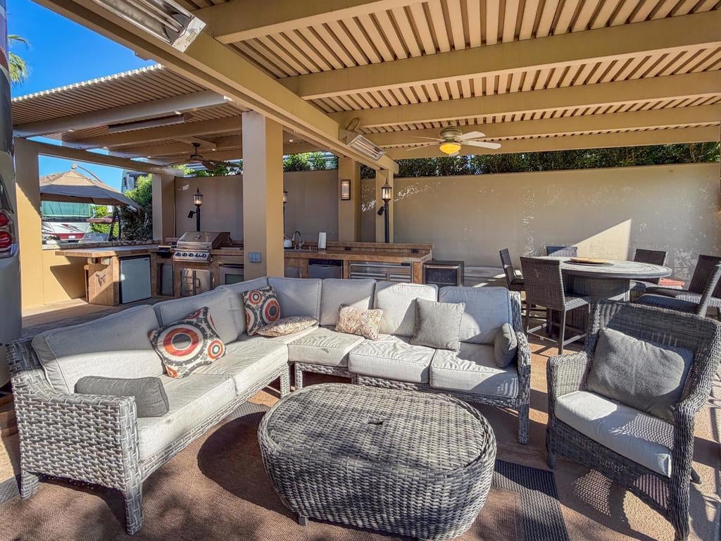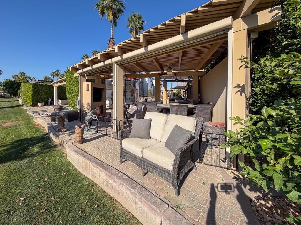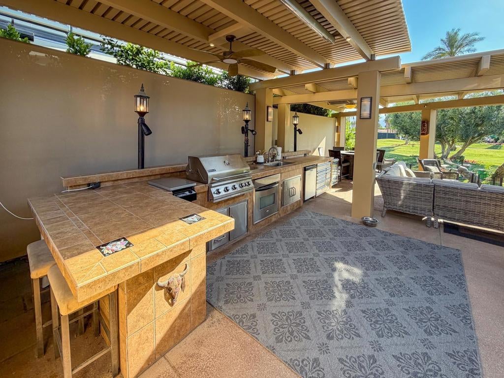 Outdoor Resort Indio is a Class A Motorcoach resort. Welcome to Lot 46 at Outdoor Resort Indio, a luxury golf course view lot designed for both entertaining and relaxed desert living. With sweeping fairway views and beautiful sunsets, this property combines scenery, comfort, and functionality in one of the most desirable Class A motorcoach resort settings in the Coachella Valley. The Cool Top concrete RV pad enhances comfort underfoot, while the location offers easy access and convenience within the resort.The large outdoor kitchen is truly the centerpiece, featuring a dishwasher, hot water, garbage disposal, refrigerator, oven, electric cooktop, gas burner, wine cooler, and built-in BBQ -- all surrounded by extensive stainless steel storage. The L-shaped pergola includes a section built just two years ago and a custom entertainment center with TV added three years ago. Electric and manual screens, three radiant heaters, and three ceiling fans allow you to control comfort.Outdoor seating areas include a fire table with six chairs and end table, a wicker L-shaped sofa set, and a wicker loveseat with ottoman -- creating multiple inviting spaces for gathering with friends and family. Located within walking distance to a satellite pool, hot tub, and laundry facilities, Lot 46 delivers the ideal balance of golf course views, sunset ambiance, and resort convenience at Outdoor Resort Indio.