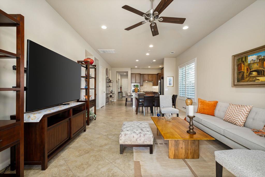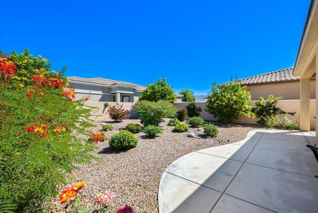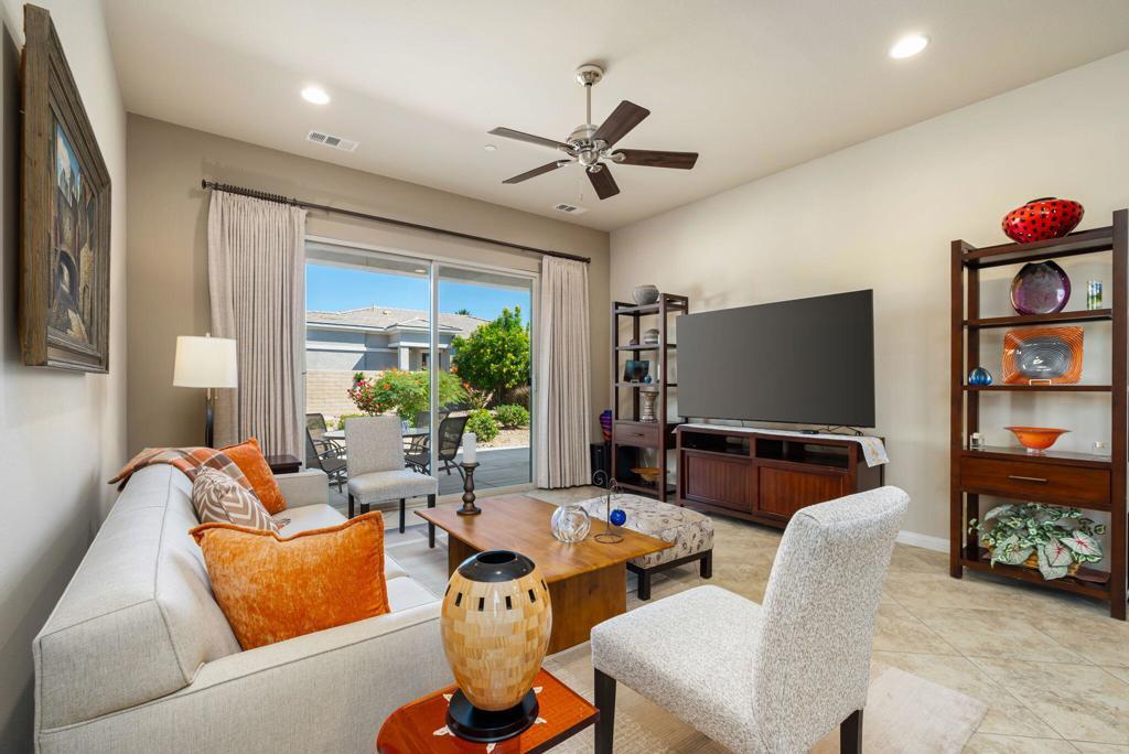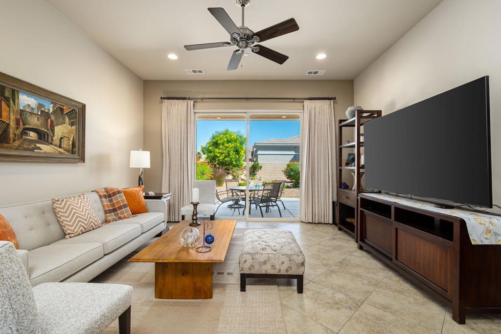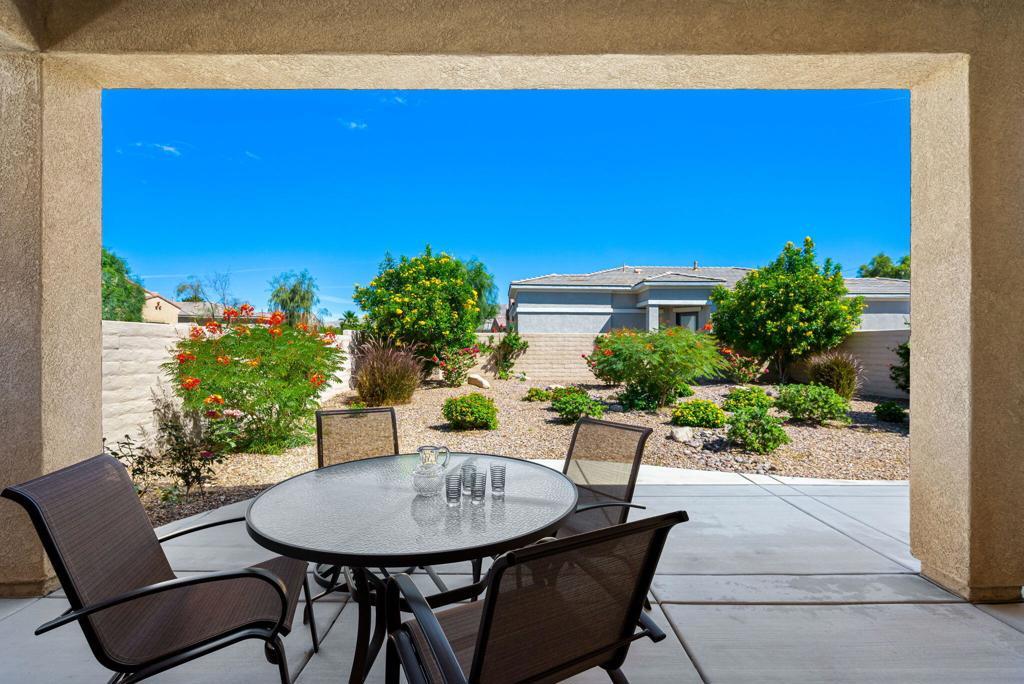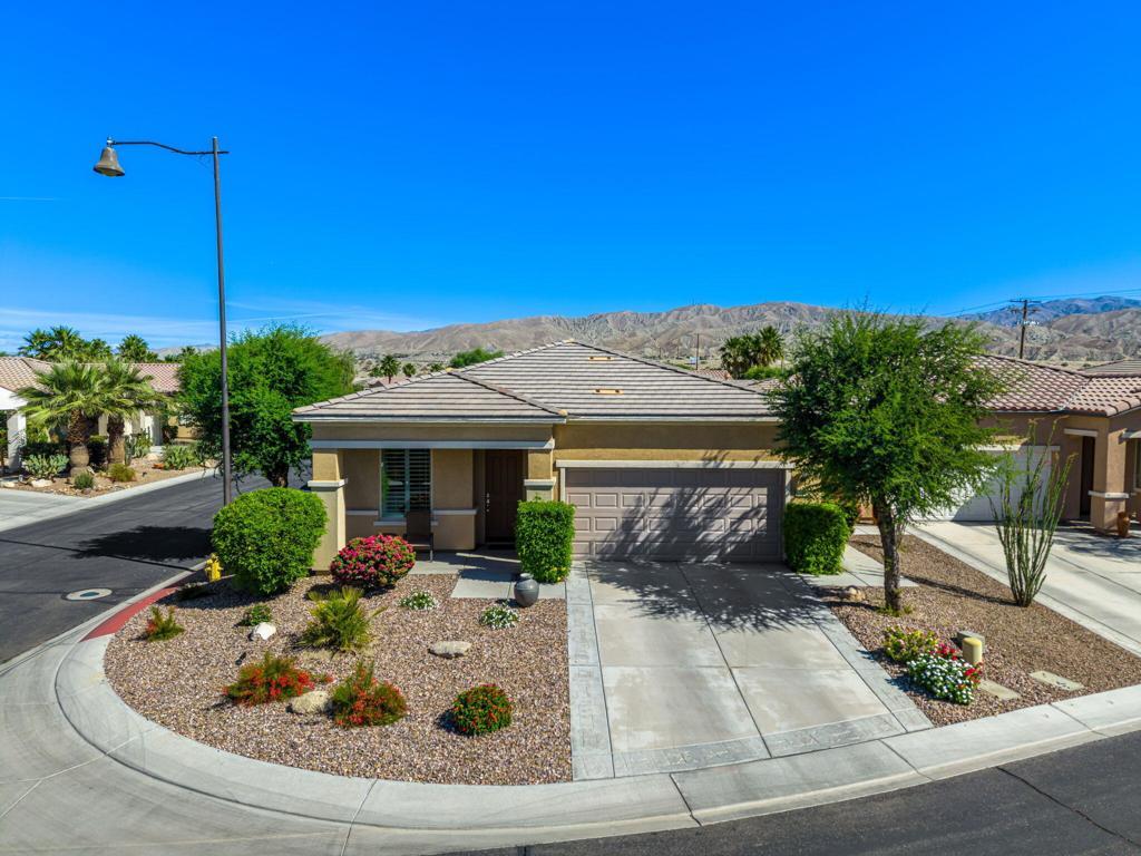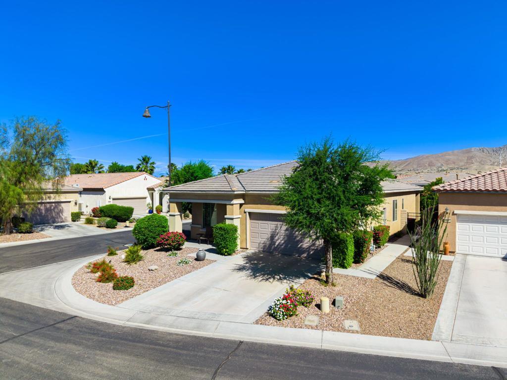 Bright, sunny and stunning. This energy efficient Hideaway model at Sun City Shadow Hills award winning 55+ community offers an OVERSIZED, PRIVATE, CORNER LOT and ENERGY EFFICIENT, as well as designer touches. Step into the hallway where you find an open and airy den-office room. Next you enter the great room boasting a gorgeous kitchen with large center island, rich wood cabinets RAW EDGE , LIGHT NEUTRAL, ROCK BACKSPLASH and sparkling stainless appliances including a BOSCH GAS COOKTOP (only 3 months old) and a BRAND-NEW GE french door REFRIGERATOR. There are pull outs in most all of the lower cabinets - so handy! Plus, a BIG pantry closet that is over 6 feet wide and floor to ceiling. The living areas all have large, neutral tile set on the diagonal - very sleek. This is a sunny and bright home and gets all exposures. The master suite offers a spacious and private bedroom plus a large bath with twin sinks, an abundance of cabinets and a deep walk-in closet. The guest bedroom and bath with walk-in shower are on the opposite side of the house for maximum privacy. The sellers paid more when it was built to have the extra 2 foot deep garage with the side door and insulated garage door. Come for the amazing lifestyle here at Sun City Shadow Hills and live the life in the great home offered at a 'LOWER THAN THE COMPS' price! (The sellers have bought another home and are moving out. The home was photographed with the sellers' furnishings but will be empty as of 4-14-2026.)