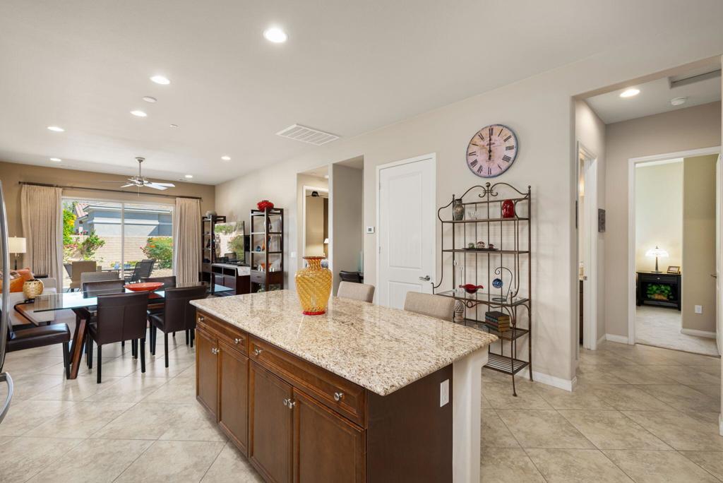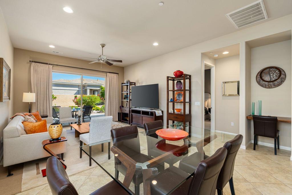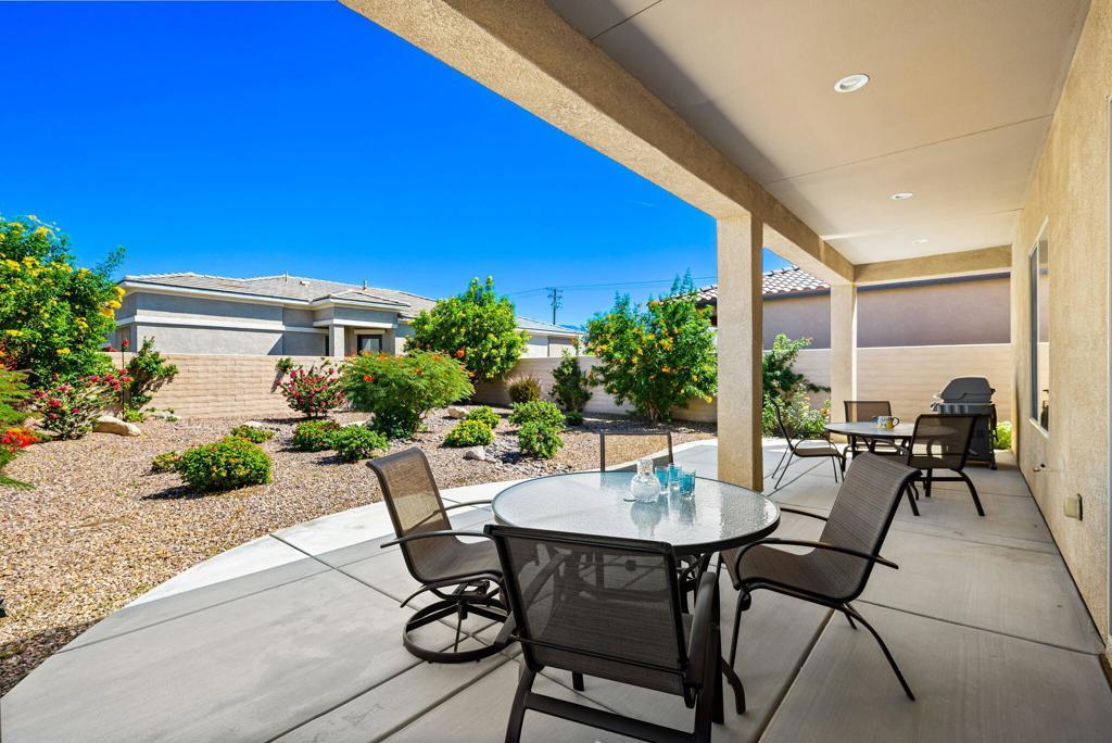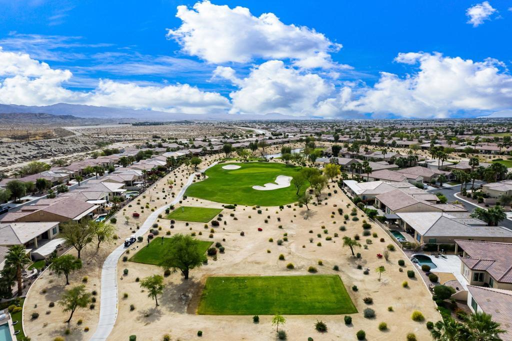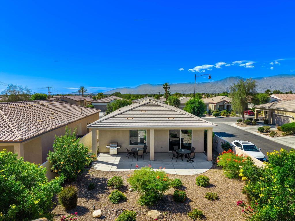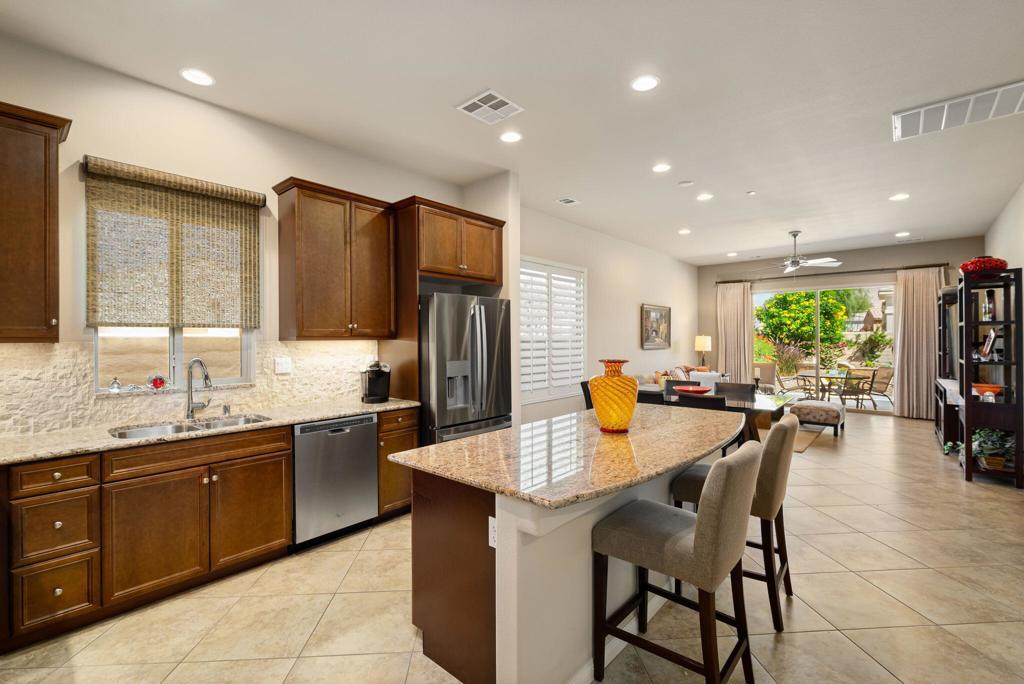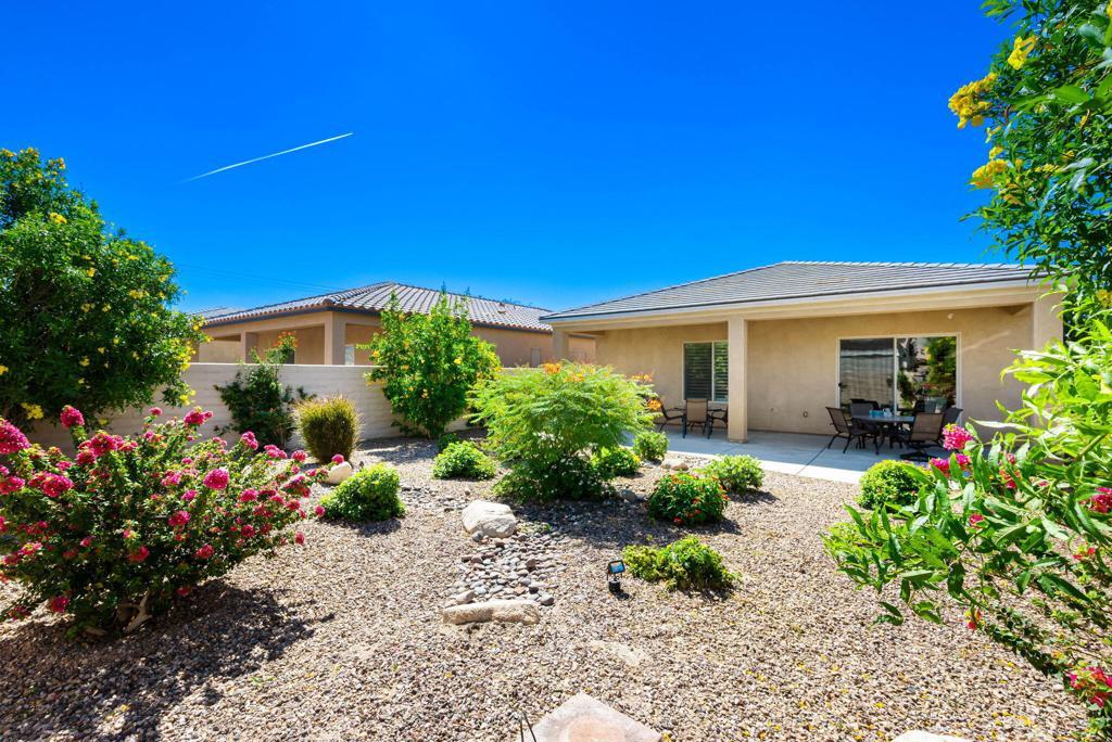 Bright, sunny and stunning. This energy efficient Hideaway model at Sun City Shadow Hills award winning 55+ community offers an OVERSIZED, PRIVATE, CORNER LOT and ENERGY EFFICIENT, as well as designer touches. Step into the hallway where you find an open and airy den-office room. Next you enter the great room boasting a gorgeous kitchen with large center island, rich wood cabinets RAW EDGE , LIGHT NEUTRAL, ROCK BACKSPLASH and sparkling stainless appliances including a BOSCH GAS COOKTOP (only 3 months old) and a BRAND-NEW GE french door REFRIGERATOR. There are pull outs in most all of the lower cabinets - so handy! Plus, a BIG pantry closet that is over 6 feet wide and floor to ceiling. The living areas all have large, neutral tile set on the diagonal - very sleek. This is a sunny and bright home and gets all exposures. The master suite offers a spacious and private bedroom plus a large bath with twin sinks, an abundance of cabinets and a deep walk-in closet. The guest bedroom and bath with walk-in shower are on the opposite side of the house for maximum privacy. The sellers paid more when it was built to have the extra 2 foot deep garage with the side door and insulated garage door. Come for the amazing lifestyle here at Sun City Shadow Hills and live the life in the great home offered at a 'LOWER THAN THE COMPS' price! (The sellers have bought another home and are moving out. The home was photographed with the sellers' furnishings but will be empty as of 4-14-2026.)