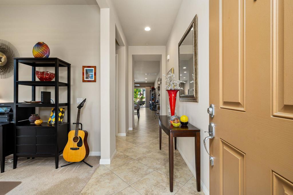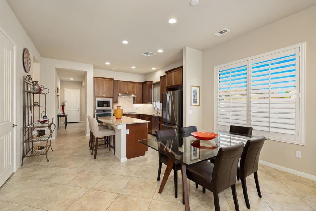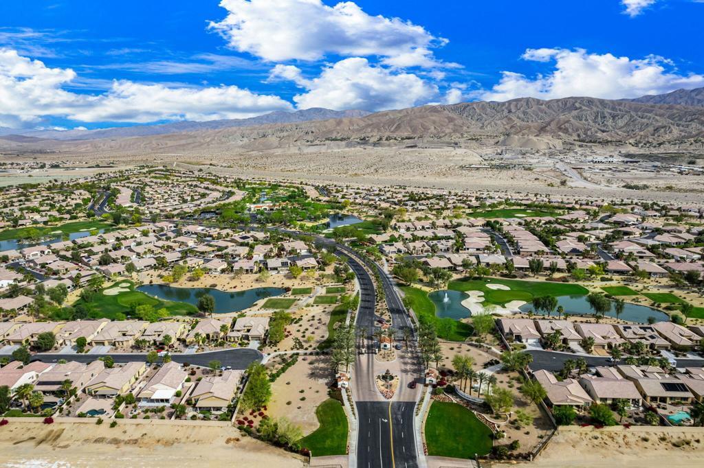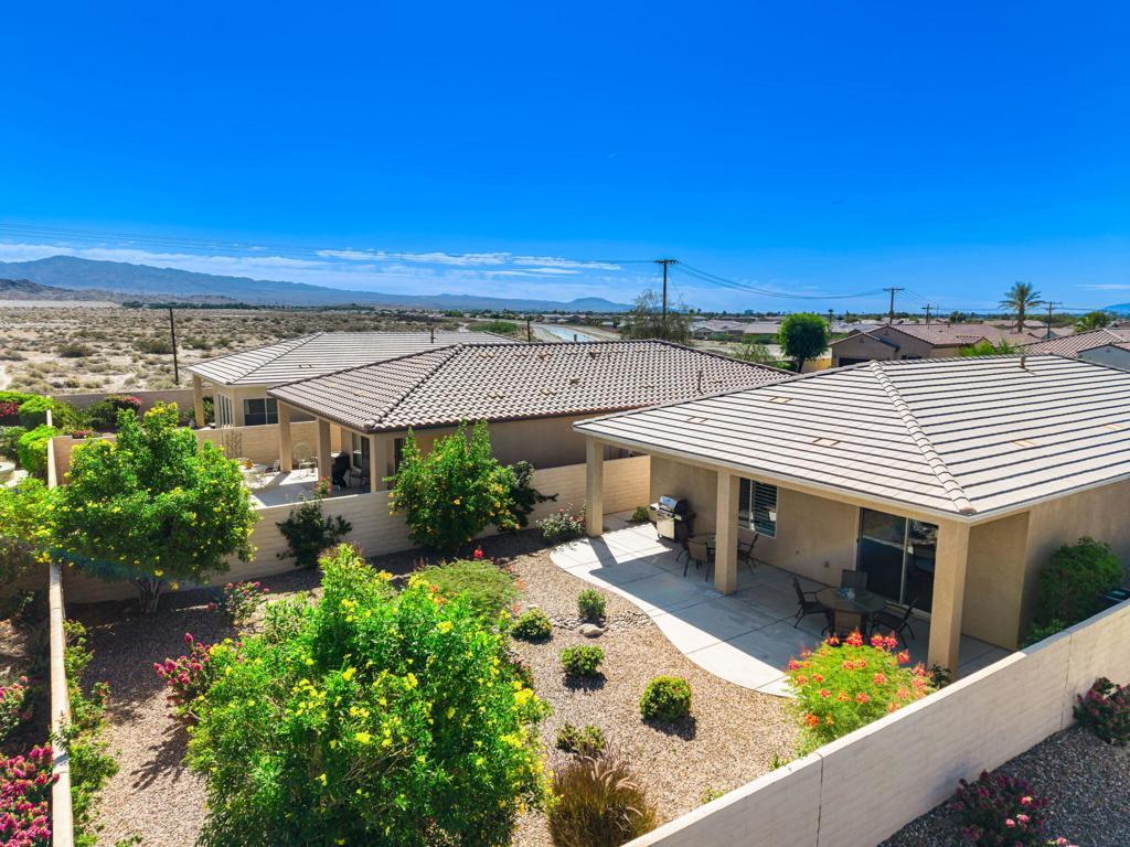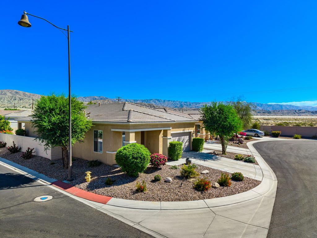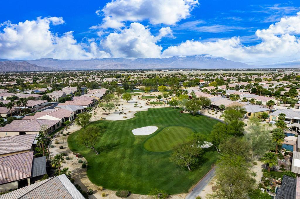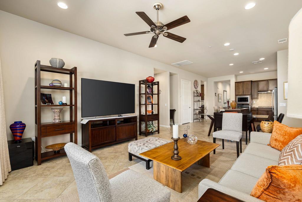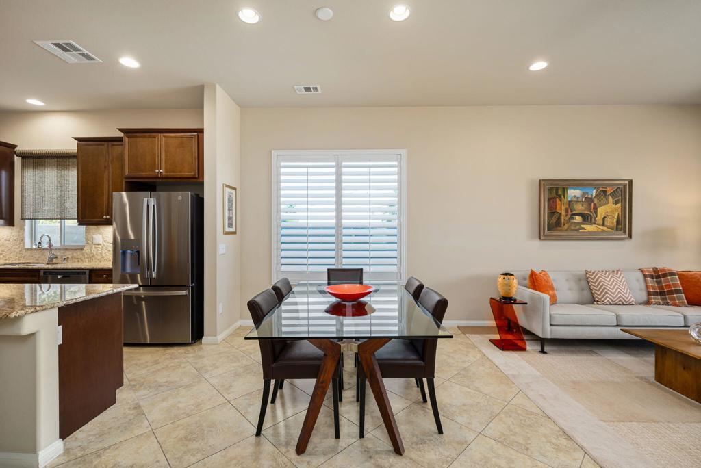 Bright, sunny and stunning. This energy efficient Hideaway model at Sun City Shadow Hills award winning 55+ community offers an OVERSIZED, PRIVATE, CORNER LOT and ENERGY EFFICIENT, as well as designer touches. Step into the hallway where you find an open and airy den-office room. Next you enter the great room boasting a gorgeous kitchen with large center island, rich wood cabinets RAW EDGE , LIGHT NEUTRAL, ROCK BACKSPLASH and sparkling stainless appliances including a BOSCH GAS COOKTOP (only 3 months old) and a BRAND-NEW GE french door REFRIGERATOR. There are pull outs in most all of the lower cabinets - so handy! Plus, a BIG pantry closet that is over 6 feet wide and floor to ceiling. The living areas all have large, neutral tile set on the diagonal - very sleek. This is a sunny and bright home and gets all exposures. The master suite offers a spacious and private bedroom plus a large bath with twin sinks, an abundance of cabinets and a deep walk-in closet. The guest bedroom and bath with walk-in shower are on the opposite side of the house for maximum privacy. The sellers paid more when it was built to have the extra 2 foot deep garage with the side door and insulated garage door. Come for the amazing lifestyle here at Sun City Shadow Hills and live the life in the great home offered at a 'LOWER THAN THE COMPS' price! (The sellers have bought another home and are moving out. The home was photographed with the sellers' furnishings but will be empty as of 4-14-2026.)
