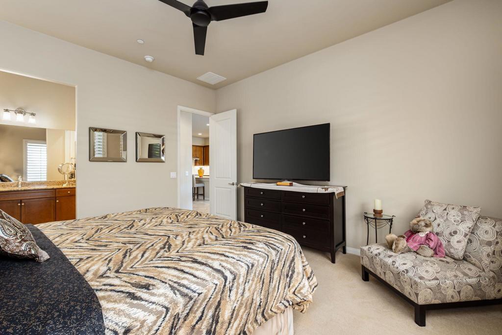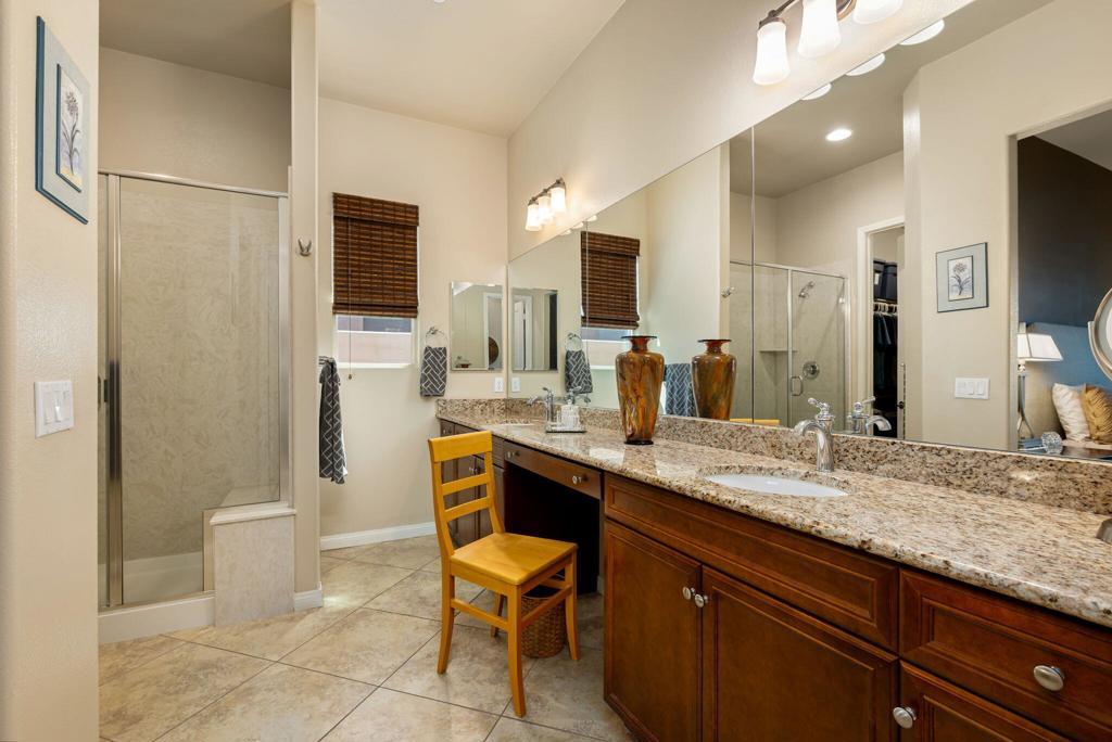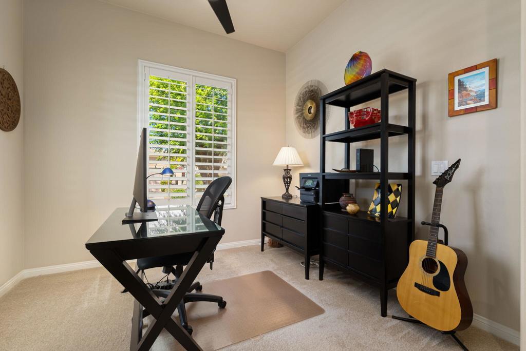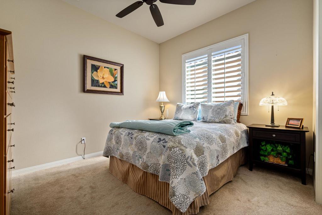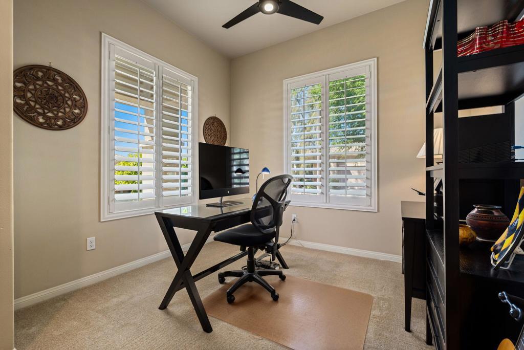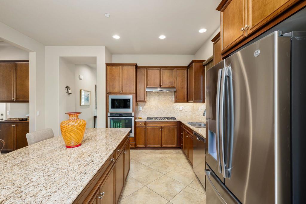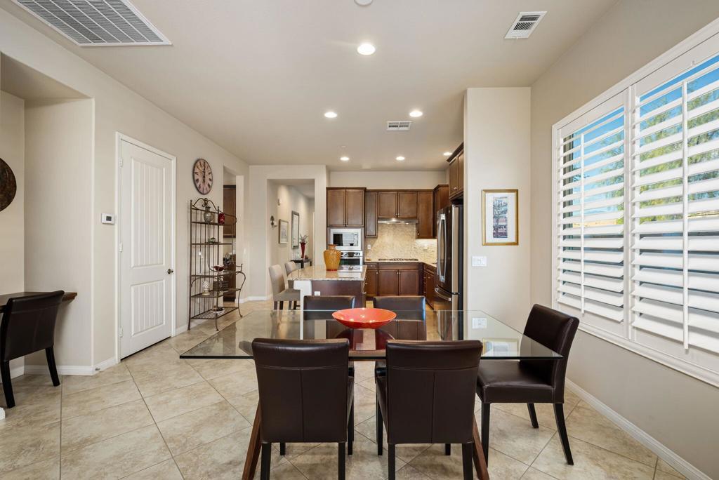 Bright, sunny and stunning. This energy efficient Hideaway model at Sun City Shadow Hills award winning 55+ community offers an OVERSIZED, PRIVATE, CORNER LOT and ENERGY EFFICIENT, as well as designer touches. Step into the hallway where you find an open and airy den-office room. Next you enter the great room boasting a gorgeous kitchen with large center island, rich wood cabinets RAW EDGE , LIGHT NEUTRAL, ROCK BACKSPLASH and sparkling stainless appliances including a BOSCH GAS COOKTOP (only 3 months old) and a BRAND-NEW GE french door REFRIGERATOR. There are pull outs in most all of the lower cabinets - so handy! Plus, a BIG pantry closet that is over 6 feet wide and floor to ceiling. The living areas all have large, neutral tile set on the diagonal - very sleek. This is a sunny and bright home and gets all exposures. The master suite offers a spacious and private bedroom plus a large bath with twin sinks, an abundance of cabinets and a deep walk-in closet. The guest bedroom and bath with walk-in shower are on the opposite side of the house for maximum privacy. The sellers paid more when it was built to have the extra 2 foot deep garage with the side door and insulated garage door. Come for the amazing lifestyle here at Sun City Shadow Hills and live the life in the great home offered at a 'LOWER THAN THE COMPS' price! (The sellers have bought another home and are moving out. The home was photographed with the sellers' furnishings but will be empty as of 4-14-2026.)