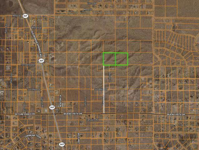 20 breathtaking acres hidden in a patch of rolling hills in the sought after Yucca Mesa neighborhood. Two 10 acre contiguous lots. Mature Joshua Trees, creosote bushes, and cholla cactus. These parcels offer a variety of building sites for several homes and guest homes. From hilltop 360' views to the private settings of secluded valleys. Amazing views of Mt Bartlette and the San to Snow National Monument. High priced homes in the area. Watch the jack rabbits, quail, and roadrunners frolic. Starry nights. Horse property. No water or power so build a well and go solar. 15 miles to the Joshua Tree National Monument. About 3 million tourists visited the park annually. Less than 5 miles to town for all amenities. 33 miles to Palm Springs. 126 miles to Los Angeles. More celebrities, musicians, and artists are now calling Yucca Valley home than ever before. Ideal location for your dream designer compound. Buyers must contact the county planners for all questions on building. Buyers must contact the utilities agencies for all questions on utilities. Address is not a real address and is for marketing purposes only. APN 0597-121-19-0000 and APN 0597-121-20-0000 GPS (34.172507 -116.41044)