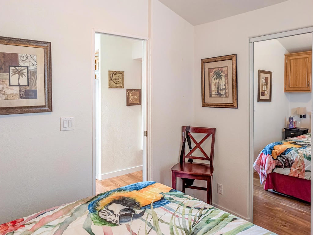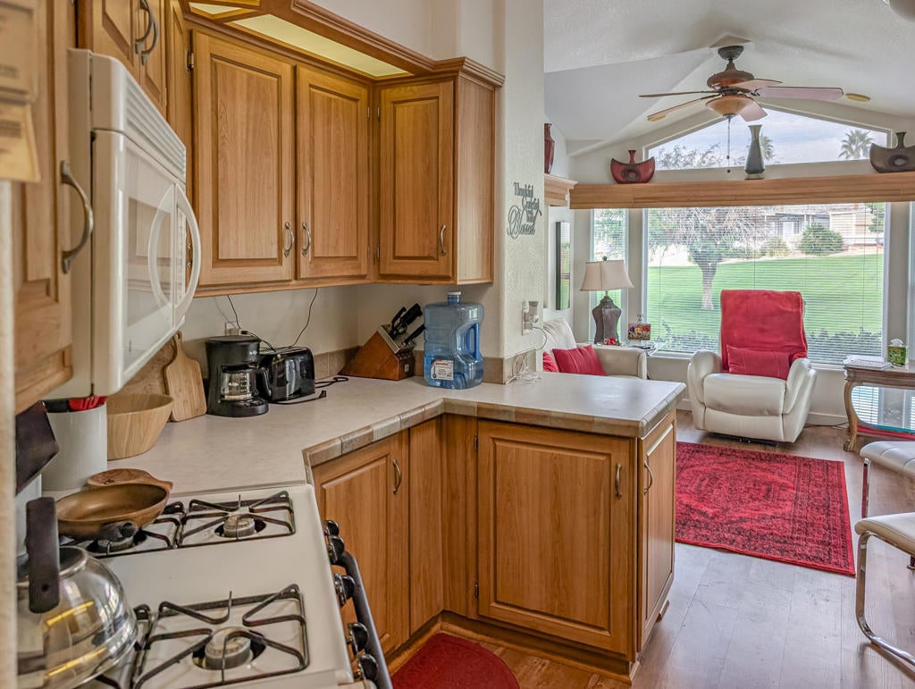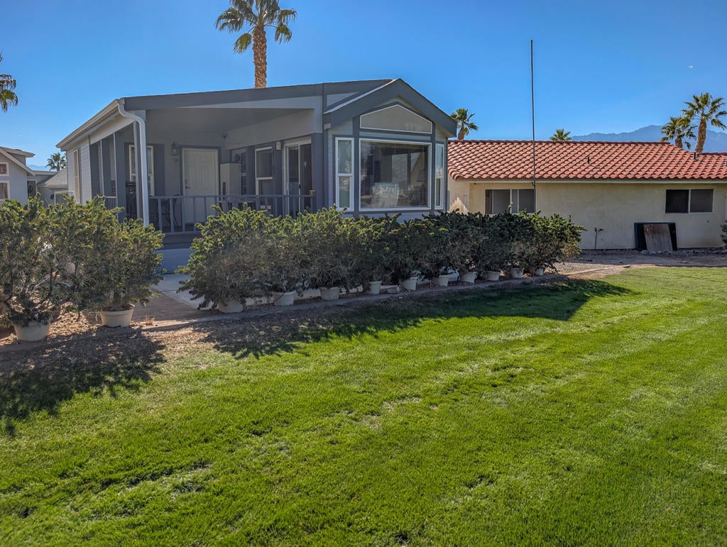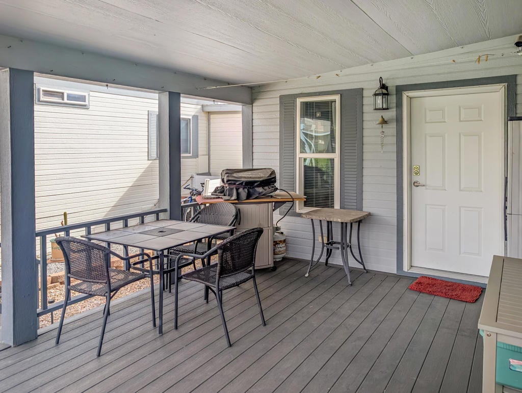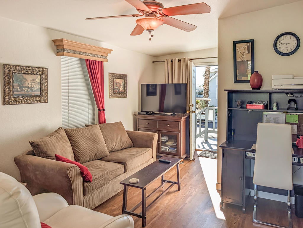 Caliente Springs Resort is an exclusive, gated community for ages 55 and up. This spotless 2004 Cavco Park Model offers around 550 sq. ft. of living space with one bedroom and one bathroom. It sits on the lush 8th hole of the golf course, surrounded by beautiful local scenery, mountains, and ponds--all of which you can enjoy from your fully covered deck, perfect for relaxing in peace. Updates include new flooring, a new deck, an upgraded bathroom with a tiled walk-in shower and an energy-efficient toilet, a walk-in closet, paved parking, landscape irrigation, and more. A golf cart is also included for convenient travel around the park. Community amenities feature 8 pickleball courts, tennis courts, laundry facilities, a library, fitness center, a 9-hole golf course, and mineral-fed hot springs pool and spas. In addition to the impressive features of the home and resort, residents enjoy an active social calendar with group activities, classes, and gatherings that foster a warm sense of community. The resort's gated security offers peace of mind, while its prime location provides convenient access to shopping, dining, and local attractions, making everyday living both comfortable and enjoyable. Whether you're seeking a tranquil retreat or an engaging lifestyle, Caliente Springs Resort combines the best of both worlds for those looking to embrace the next chapter in a vibrant 55+ setting. Lot is not owned; space rent is $950 per month.