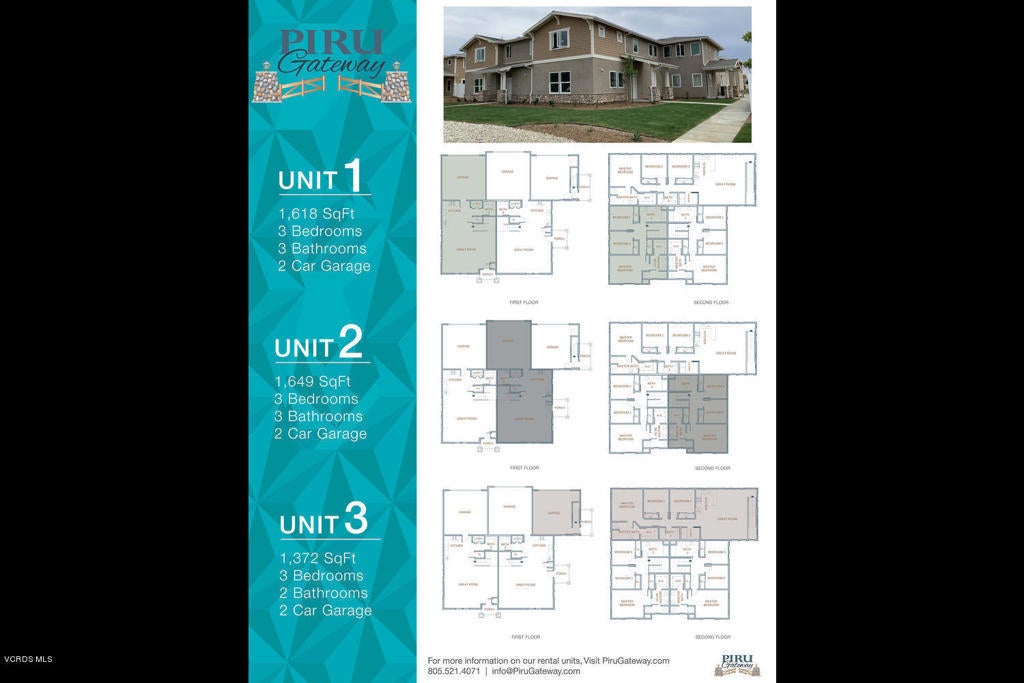 Estimated occupancy for June 2020. Triplex residence features three units each with own floorplan. 1) 3+2, 2) 3+3, and 3) 3+3. Open and spacious floorplans, Lots of upgraded standard features! A/C, granite counter and wood flooring compliment the residences. Located within the newly planned community of Piru Gateway, this triplex sits amongst residential residences consisting of 55 single family homes and 8 townhouses. Easy access to jobs and freeways. This triplex is conveniently located on highway 126 and only 15 minutes to the Santa Clarita Valley. Over 30 million square feet of business and industrial parks are found in Valencia and Santa Clarita Valley. Piru Gateway boasts amazing views of the mountains from every angle. Please make appointment with Listing Agent for viewing appointment as well as current rental valuation.