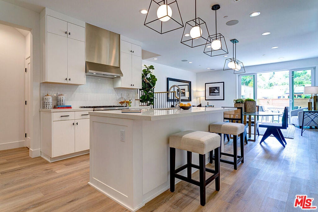 This single family Hollywood home presents a modern exterior of clean lines, gray stucco and black trim. With one shared wall, this home offers four bedrooms, two and a half baths, a tandem garage and driveway with two spaces. A covered front porch with Ring doorbell welcomes you into the light and bright foyer, where you will find a powder bath with pedestal sink. Throughout this home, you will find wide plank oak style vinyl flooring, recessed lighting, polished chrome plumbing fixtures, white flat panel cabinets with soft close doors and drawers, and beautiful white quartz countertops. Prepare gourmet meals in the chef inspired kitchen, which includes a walk in pantry, island with bar seating and pendant lighting, and vertical subway tile backsplash. It boasts stainless steel Bertazzoni appliances, including a French door refrigerator, gas range with griddle, and dishwasher in addition to a Frigidaire microwave. Entertain in the dining area, which has a stylish decorative light fixture, or cozy up by the gas fireplace of the great room, which features a marble surround with mantel. Sliding doors beckon you out into the back yard with patio, perfect for casual outdoor dining. Just inside from the tandem garage, which is wired for an electric vehicle charging station, you'll find a convenient drop zone with bench seat for handbags, backpacks and mail. Make your way upstairs to find three secondary bedrooms plus a bath with dual sink vanity and tub shower. Linen cabinetry and shelving at the hallway are complemented by a laundry closet for side by side washer dryer. Unwind in the grand suite, which boasts an en suite bath with dual sink vanity, walk in shower with seat, and walk in closet.