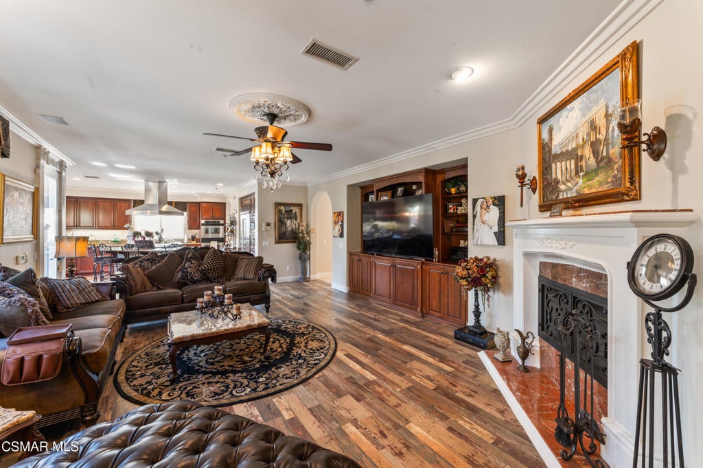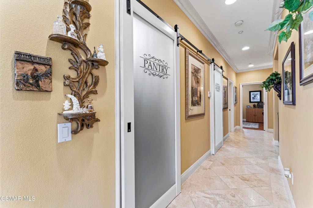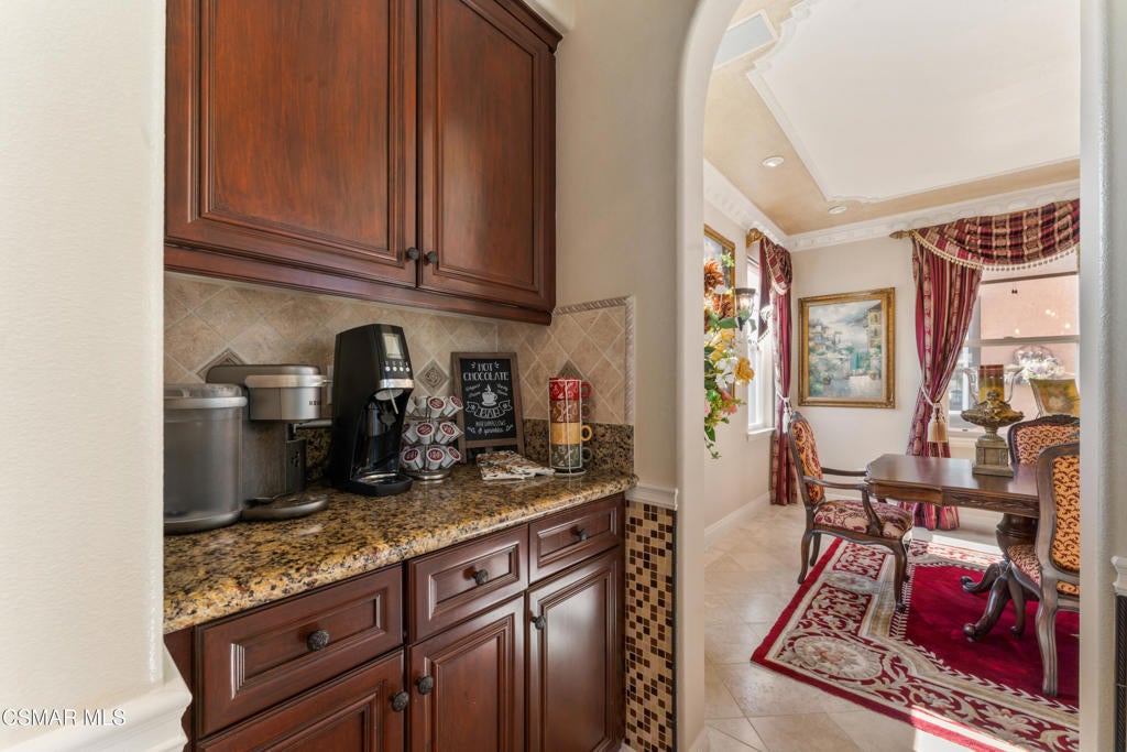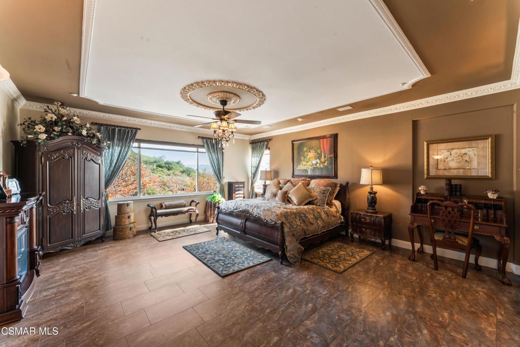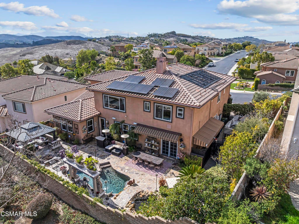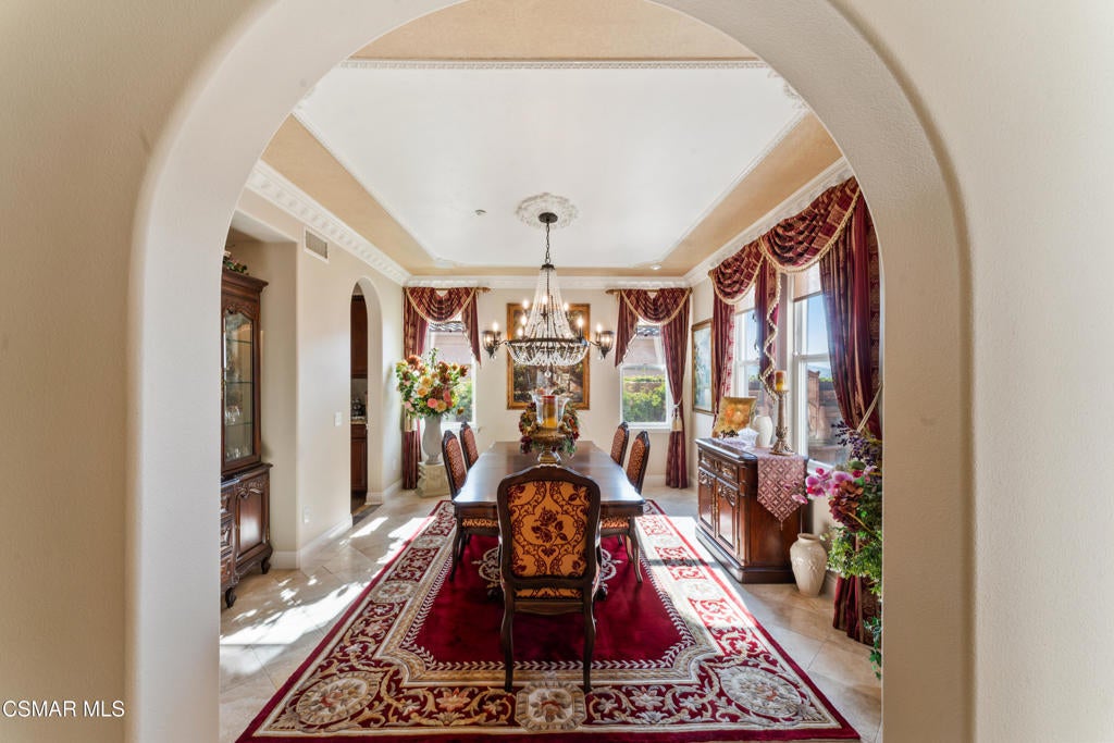 Freshly painted interior move-in ready with a $126,000 price reduction. From the moment you enter this prestigious gated community of Serenata / Trieste tract. and step through a custom iron front door into the dramatic foyer. You will be dazzled by the detailed craftmanship with no expenses spared. You are greeted with 2 formal sitting areas, one with a built-in wet bar for hosting the best parties. The other, a living room has a cozy fireplace surround. The arched hallway opens up to a vaulted ceiling with an adjacent walk-in temperature-controlled wine cellar, powder bathroom for guests, and a view of a private water featured courtyard. As you flow into the formal dining room, perfect setting for your special events it's as elegant as it gets. A large butler's pantry connects into the chef's gourmet kitchen which features a massive, hooded center island, breakfast bar with all stainless-steel high-end appliances, granite countertops and a large eat-in area. The family room is an open concept where you can entertain your guest and gather around the fireplace. In front of a built-in theater entertainment center with 2 large adjoining rooms. The laundry room has a countertop and plenty of cabinets for storage. From there you can walk out into the two-car finished garage with built in cabinetry and a third car tandem space 123 Sq Ft ''not included'' in total square footage of home This has been converted into office/maid quarters. The second level features a large landing with 5 spacious bedrooms, including a magnificent primary suite breathtaking view of the Regan Library across rolling hills. The ensuite bathroom includes a jacuzzi soak tub and step-in shower with 2 resting benches. There are also His and Hers walk-in cedar lined closets with custom cabinet units. The back yard is breathtaking, stunning and perfect for entertaining. It has all to offer including an auxiliary solar heated pool/spa, built- in barbeque, fire pit, Pizza oven. Koi pond with waterfall, a cabana with fans misters, heat lamps, and lastly, a retractable awning for outside dinning and shade. That's right it has it all! This home offers approximately 4,777 square feet. five bedrooms, five bathrooms and the luxurious open floor plan feature high 9-12-foot ceilings with crown moldings. There is also custom millwork throughout including solid interior doors, custom cabinetry, window coverings, natural stone, marble, wood flooring throughout and extensive hard scape. With immediate and future savings in mind, there's an owned Solar System with back up battery This is magnificent well-maintained home with low HOA dues, easy access to freeways. convenient shopping, beautiful parks and walking trails.