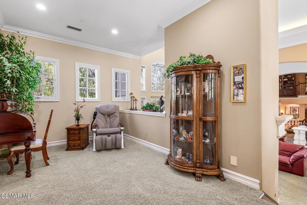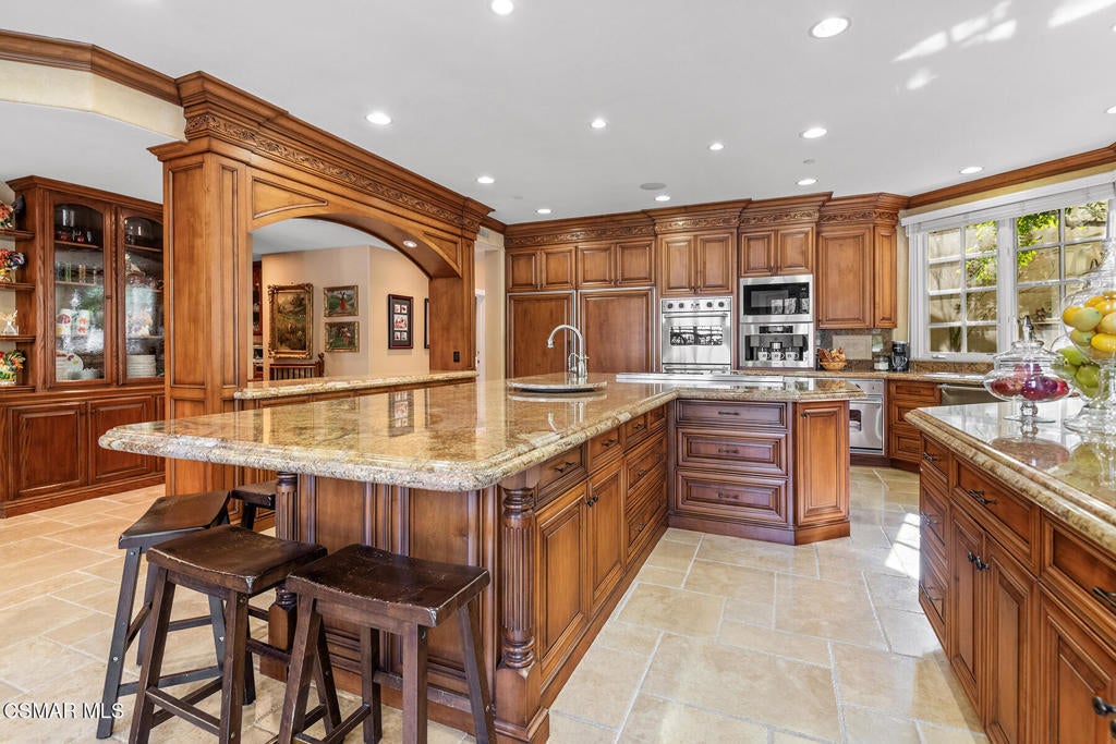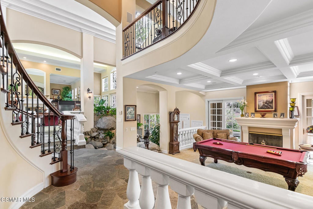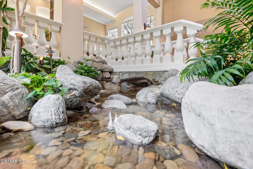 Nestled within the guard-gated North Ranch Country Club Estates, this exquisite property offers luxury and elegance. As you enter through the front entrance, you'll be welcomed by a serene indoor stream that sets the tone for the home's tranquil ambiance. The expansive living room, complete with a cozy fireplace, flows seamlessly into the family room and formal dining area, providing the perfect space for entertaining. The spacious kitchen boasts a center island, ideal for culinary adventures and gatherings alike. The primary suite features a bathroom and a generous walk-in closet, offering a private retreat. Additional highlights include a large loft space that can be tailored to suit your lifestyle needs. An exceptional guest house complements the main residence, featuring one bedroom, one bathroom, a charming living area with a fireplace, and a kitchen. The stunning backyard is an entertainer's dream, showcasing a custom pool, spa, and lush landscaping. You'll find a covered sitting area and a sport court, perfect for recreation and relaxation. With a six-car garage and enclosed RV parking, this property truly has it all. Experience refined living in a fantastic setting.