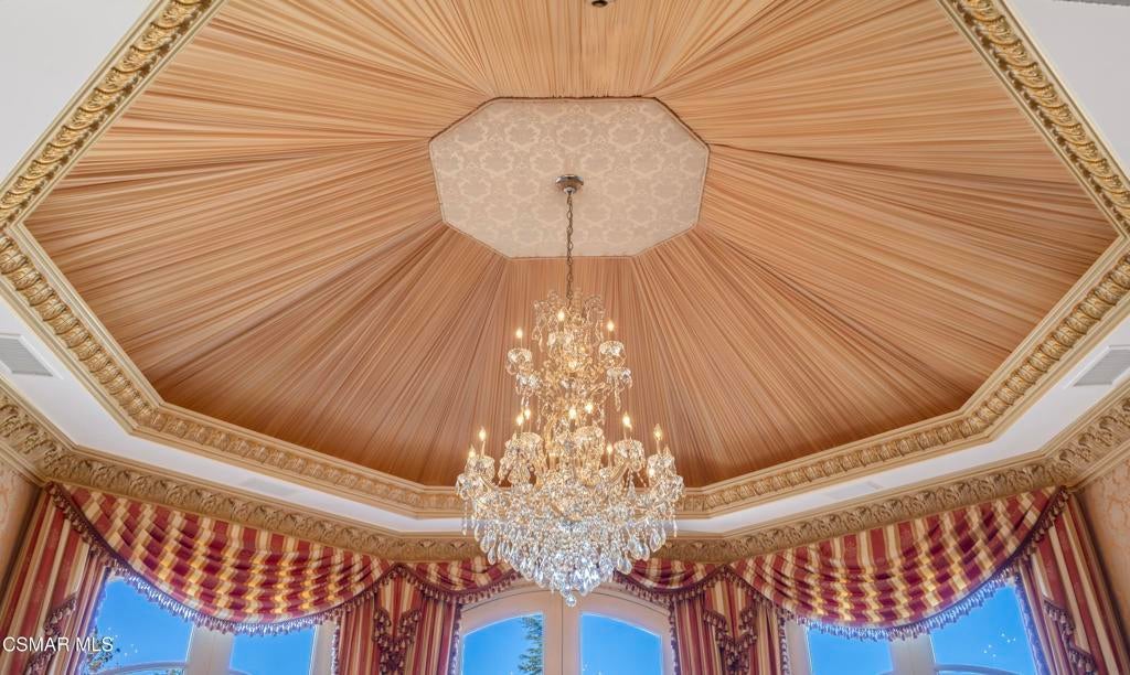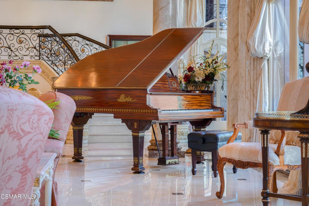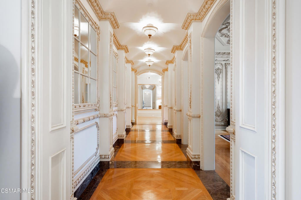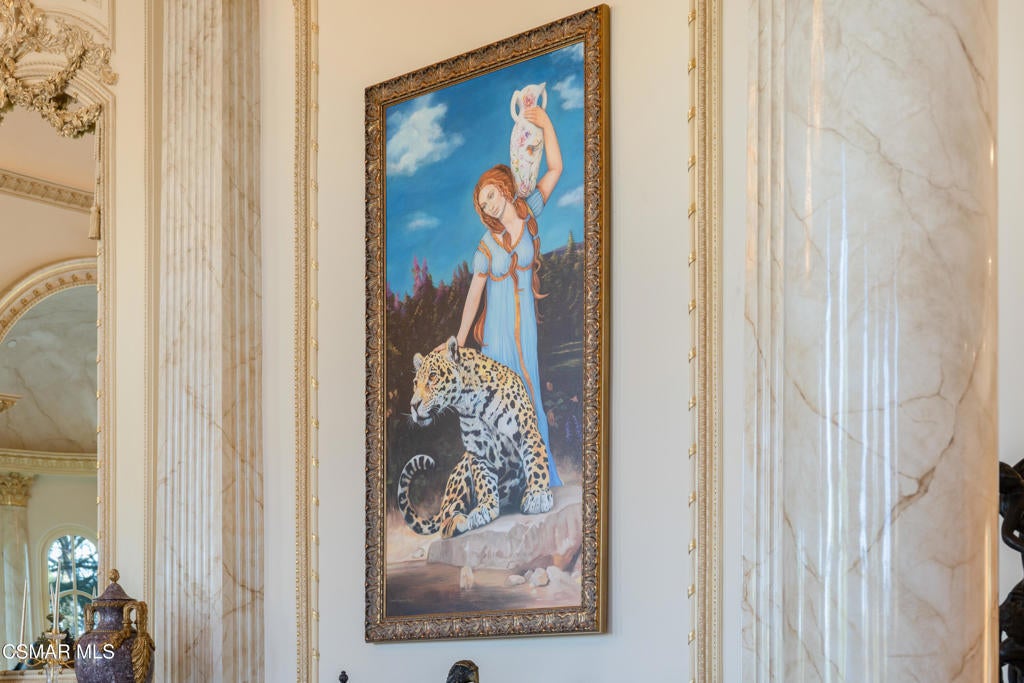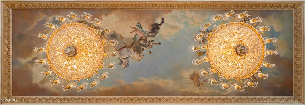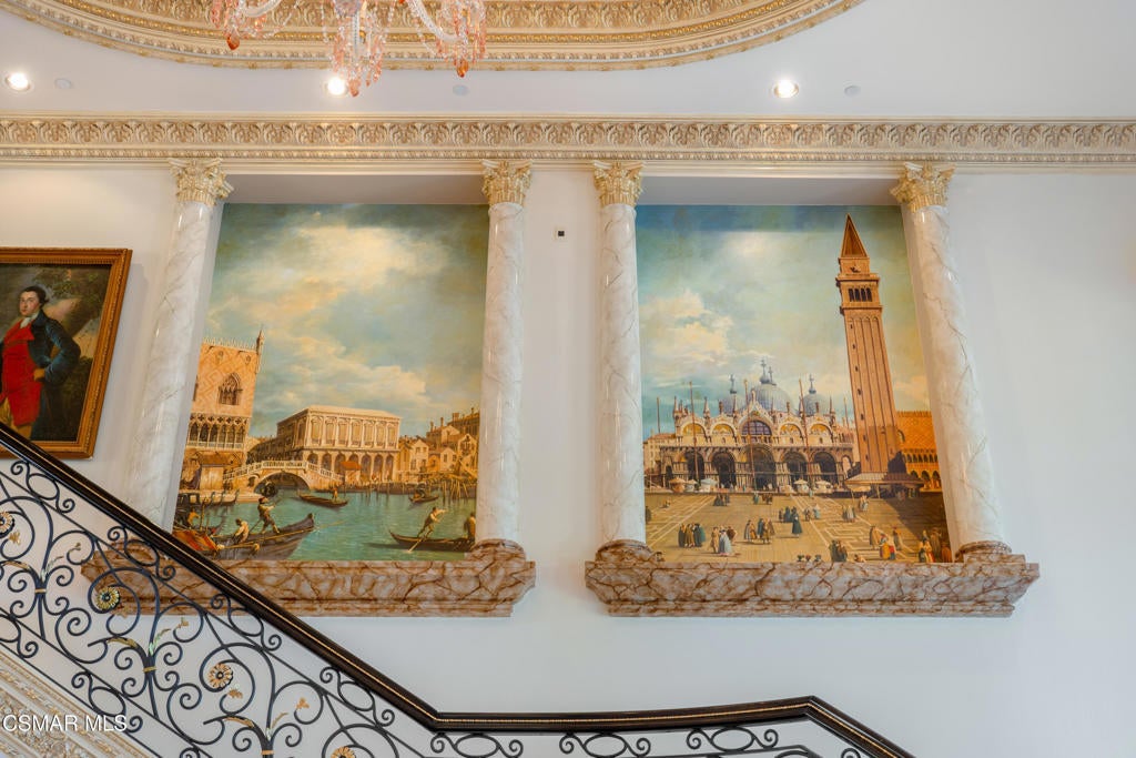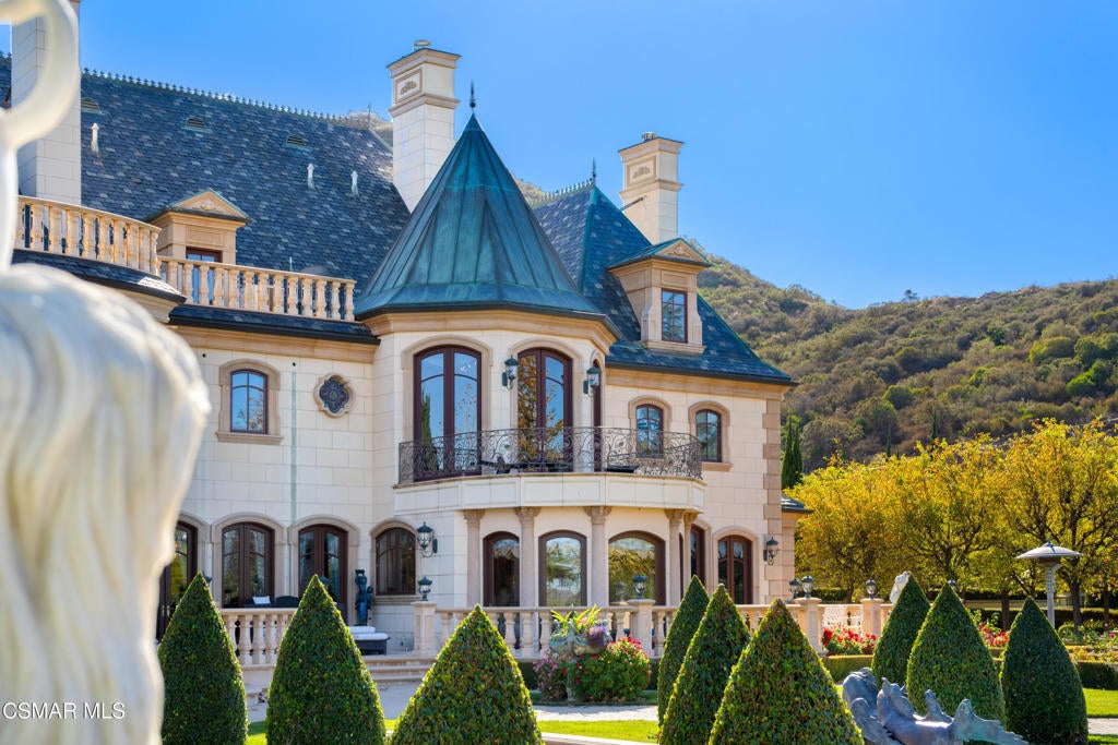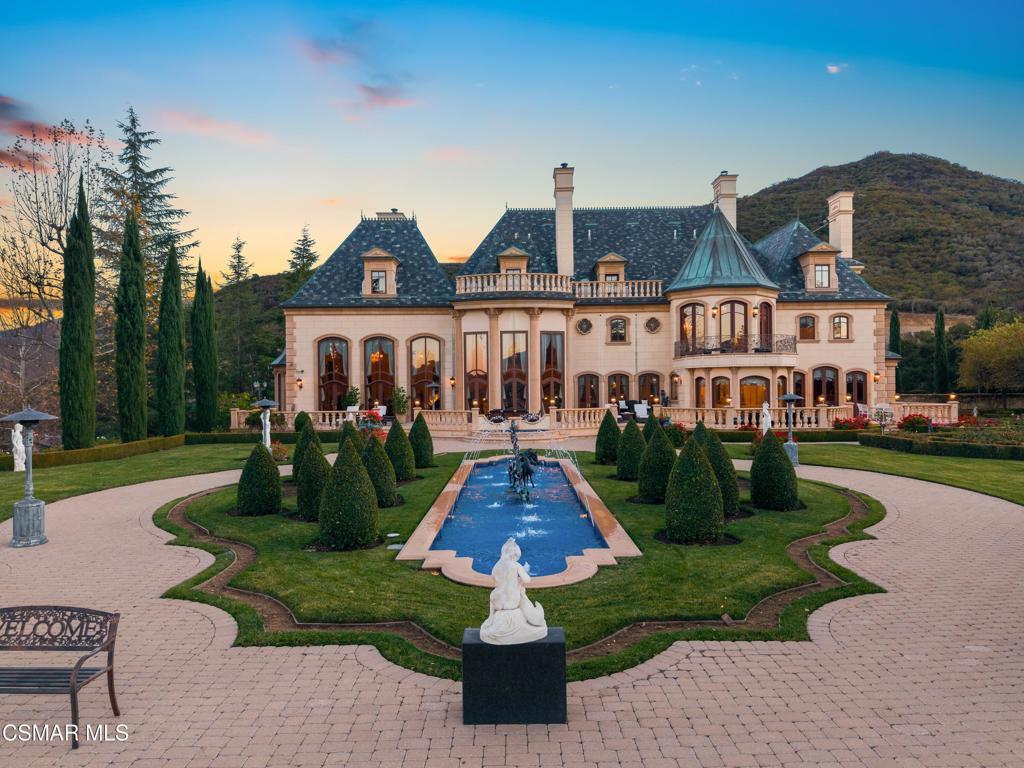 As featured in Robb Report & Los Angeles Times, Chateau Plaisance, a CASTLE nestled within the prestigious 24/7 guard gated Sherwood Country Club, spans nearly 3 private acres across 5 lots, offering breathtaking views of the spectacular Santa Monica Mountains and the renowned Jack Nicklaus Signature Golf Course. Perfected in every detail, this approx. 14,113-square-foot French-inspired masterpiece showcases unparalleled artisanship and timeless elegance.The Castle's park-like grounds are a true masterpiece, featuring formal box-hedged gardens filled with thousands of roses, lush lawns adorned with life-sized statuary, and cobblestone pathways leading to a striking 52-foot reflection pond where bronze horses appear to gallop through cascading water. A serene large infinity pool and spa with a waterfall, a koi pond, and an ornate iron gazebo overlooking the valley complete this enchanting outdoor retreat.A grand entrance welcomes you into the rotunda, where a dazzling Baccarat chandelier, hand-painted murals, and a sweeping marble staircase with a gold-leafed iron banister set the tone for the opulence within. The 22-foot-high Grand Salon & Ballroom boasts two Spanish brass and crystal chandeliers, a carved fireplace, and towering windows that frame the gardens. An elevated alcove provides the perfect stage for entertainment.The richly paneled library, complete with parquet flooring, a fireplace, and a hidden bar, offers a cozy escape, while the formal dining room, seating 20, is illuminated by two custom Waterford chandeliers. The gourmet kitchen, adorned with antiqued cabinetry, parquet flooring, four subzero refrigerators, and two oversized islands, opens to a warm and inviting family room featuring a grand fireplace, elegant window seating, and a granite-topped bar.The second floor offers a luxurious primary suite with a sitting area, fireplace, a sleek wet bar, and two lavish spa-inspired baths with oversized closets. Additional guest suites, a Carriage House apartment, and a hidden third-floor bonus space provide ample accommodations. The completed third floor features four separate rooms, providing endless possibilities for a home theater, gym, art studio, or private retreat.This Castle also includes a Pool House--a Mini Chateau with a great room, grand fireplace, kitchen, and two bathrooms, perfect for poolside entertaining. Two gated entrances lead to an elegant courtyard with an imported French fountain, while a separate guest parking area and the Grand Plaza can accommodate up to 150 guests.Gated guest parking is conveniently located near the charming greenhouse and the elegant archway leading to the Grand Plaza, designed to accommodate approximately 150 guests with ease. Chateau Plaisance Castle stands as a pinnacle of luxury, privacy, and grandeur--an estate unlike any other to ever grace the market.