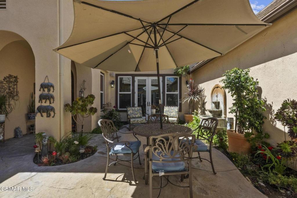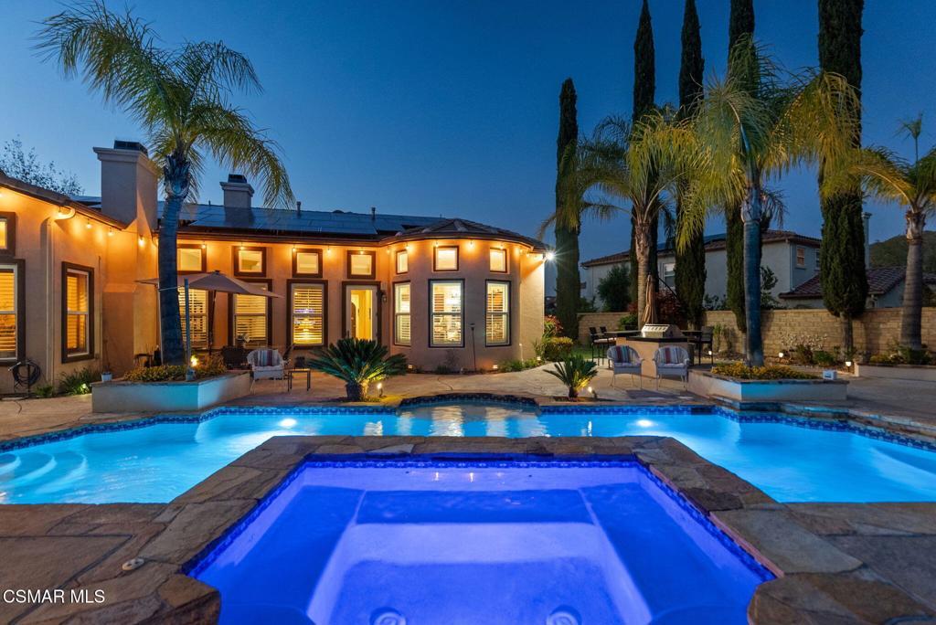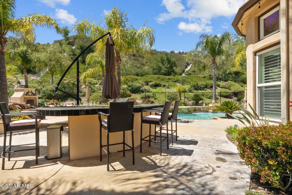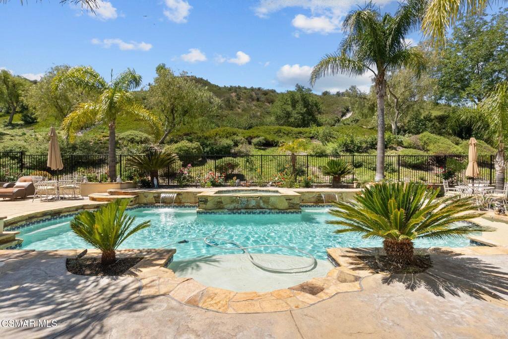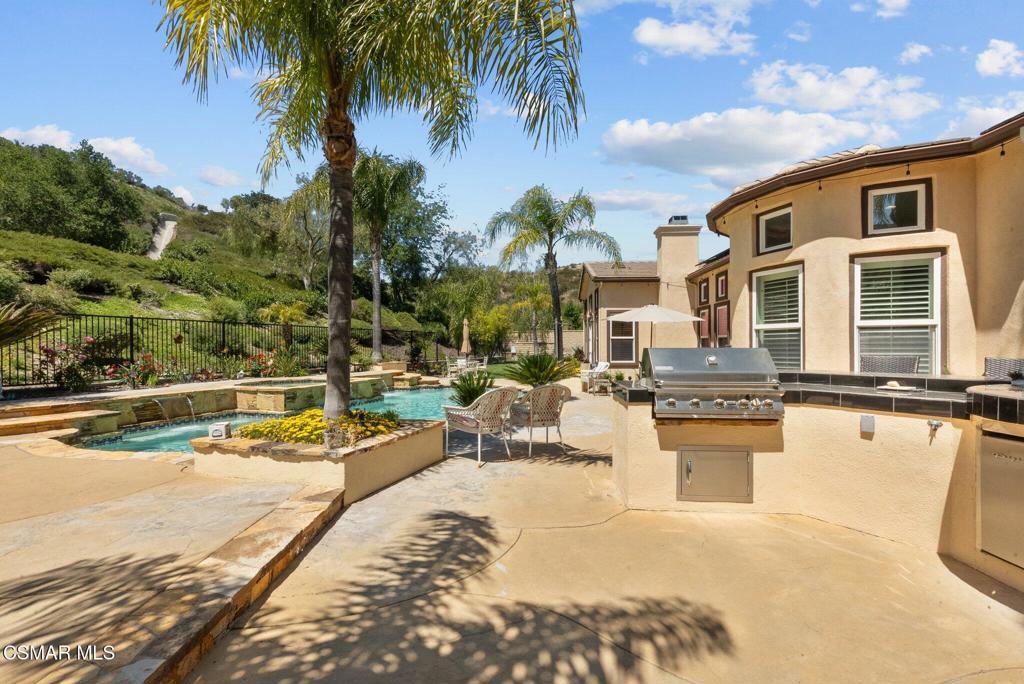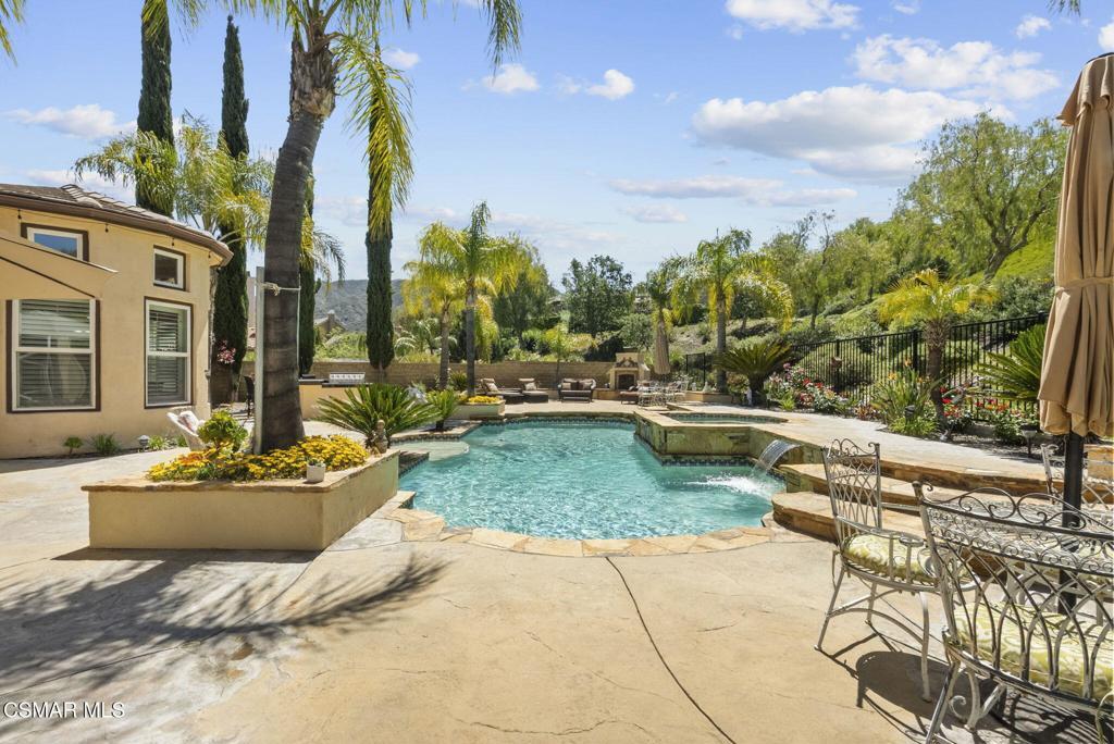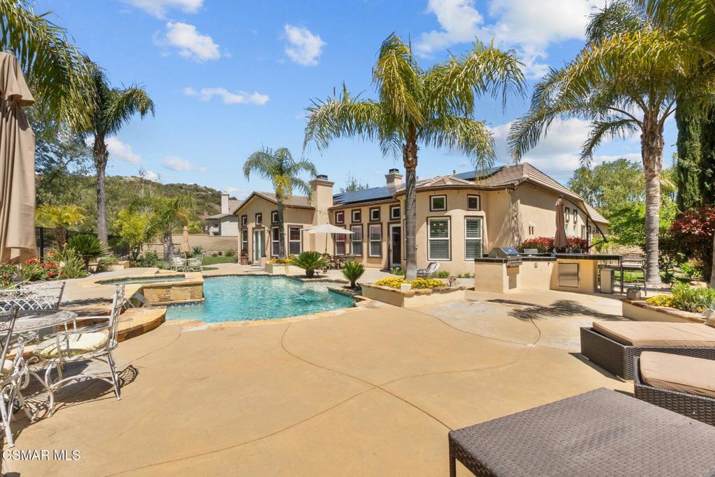Rare Single-Story Estate with Casita in Prestigious Robinson RanchNestled on a quiet cul-de-sac in the highly sought-after Robinson Ranch Community, this rare single-story home offers luxurious living, elegant design, and exceptional outdoor amenities. Featuring 3 spacious bedrooms, 3 full bathrooms, and a private detached casita, this property is an entertainer's dream and a true sanctuary.Step through a gated courtyard with a tranquil fountain into a home rich with high-end finishes, including travertine and hardwood flooring, crown molding, and stately architectural stone columns. The gourmet chef's kitchen is beautifully appointed with granite countertops, stainless steel appliances, double ovens, a walk-in butler's pantry, and a large center island--perfect for culinary enthusiasts and entertainers alike.The open-concept layout is adorned with plantation shutters and filled with natural light. The expansive master suite features a built-in fireplace, French doors leading to the backyard, a generous walk-in closet, and a luxurious en-suite bathroom complete with a jetted tub and a spacious walk-in shower. The secondary bedrooms with a Jack & Jill bathroom, ideal for families or guests.Outside, enjoy a resort-style backyard with a stunning heated saltwater pool and spa with cascading waterfalls, an outdoor fireplace and seating area, a built-in BBQ island with refrigerator, and no rear neighbors--offering unmatched privacy and plenty of space for gatherings.Additional highlights include a 3-car garage with custom storage, a tankless water heater, leased solar system, and beautifully maintained landscaping. The detached casita provides endless possibilities for guest accommodations, an office, or creative space.Located close to award-winning schools, shopping, dining, and with easy access to the freeway, this exceptional home truly has it all. Come experience the perfect blend of comfort, elegance, and California outdoor living.