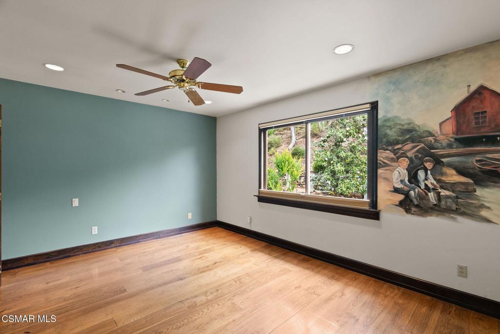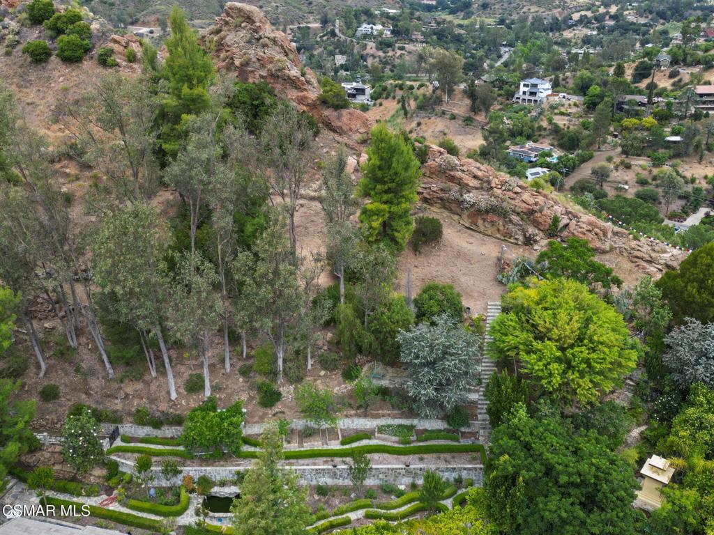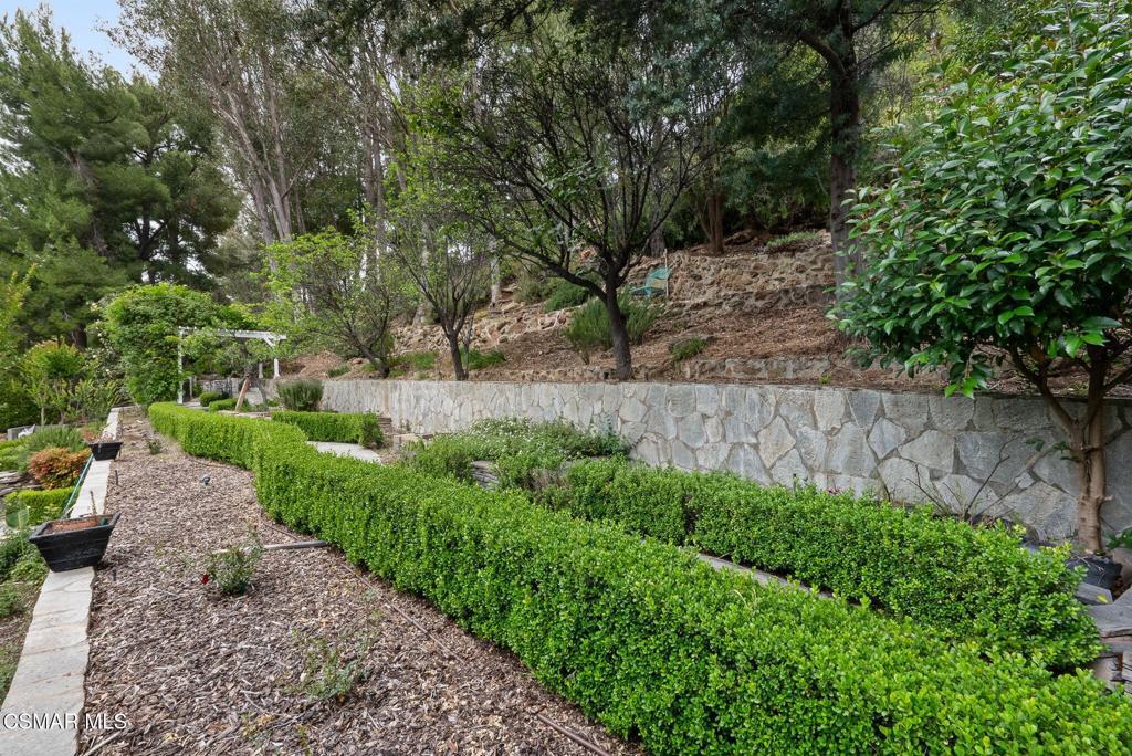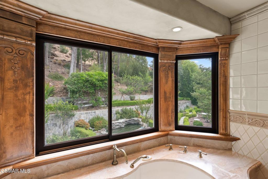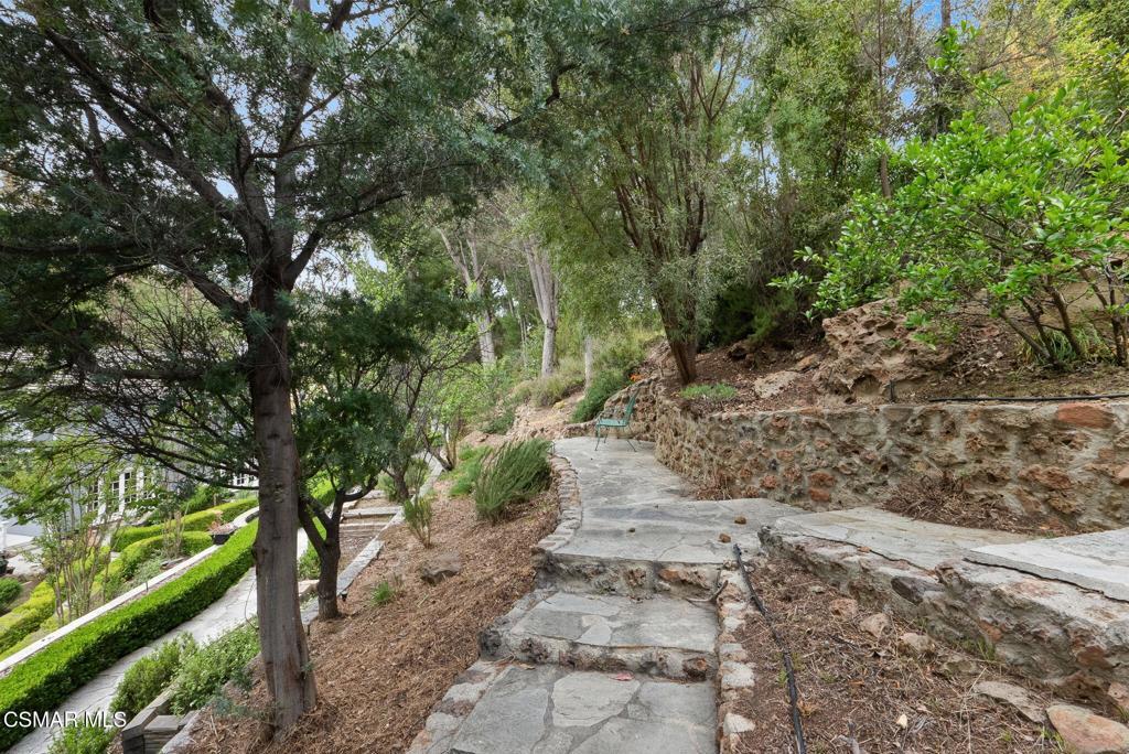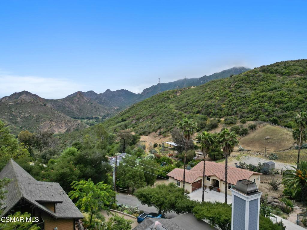 Nestled in a private, serene setting where mountain breezes meet timeless craftsmanship, this nearly 4,000 sq ft custom-built home offers an extraordinary blend of warmth, tradition, and refined elegance. Featuring rich real wood flooring throughout and handcrafted custom wood cabinetry, the home is filled with soul and story, including hand-painted murals inspired by a family farm in Norway that grace the walls with artistry and heart. With 4 bedrooms and 3.5 bathrooms, the spacious layout is designed for both luxurious comfort and everyday functionality. The primary suite is a true retreat, boasting soaring ceilings, stunning mountain views, four closets, including a center island wardrobe station and a spa-inspired bathroom with marble countertops, soaking tub, and a steam shower. The lowest level offers a private suite with separate entrance, bedroom, bathroom, living space, and laundry, ideal for guests, multigenerational living, or a private office. Large secondary bedrooms include one with a private balcony and another with access to a shared, well-appointed bath. Three unique fireplaces anchor the primary suite, family room, and formal living room, while custom built-ins and stainless-steel appliances complement the gourmet kitchen and formal dining space, which also features a wine refrigerator and a substantial wine locker. Nearly every window frames panoramic mountain views, and the property invites outdoor exploration with meandering garden paths, custom stone hardscape, fruit trees, sitting areas, a koi pond, and even a small private forest. Direct access to the back entrance of Malibu Creek State Park makes hiking and adventure effortless. Located in an award-winning school district, just minutes from the freeway and beaches, this home feels a world away yet it's incredibly close to everything. A rare opportunity to live in a place that feels both grounded in nature and elevated in design.