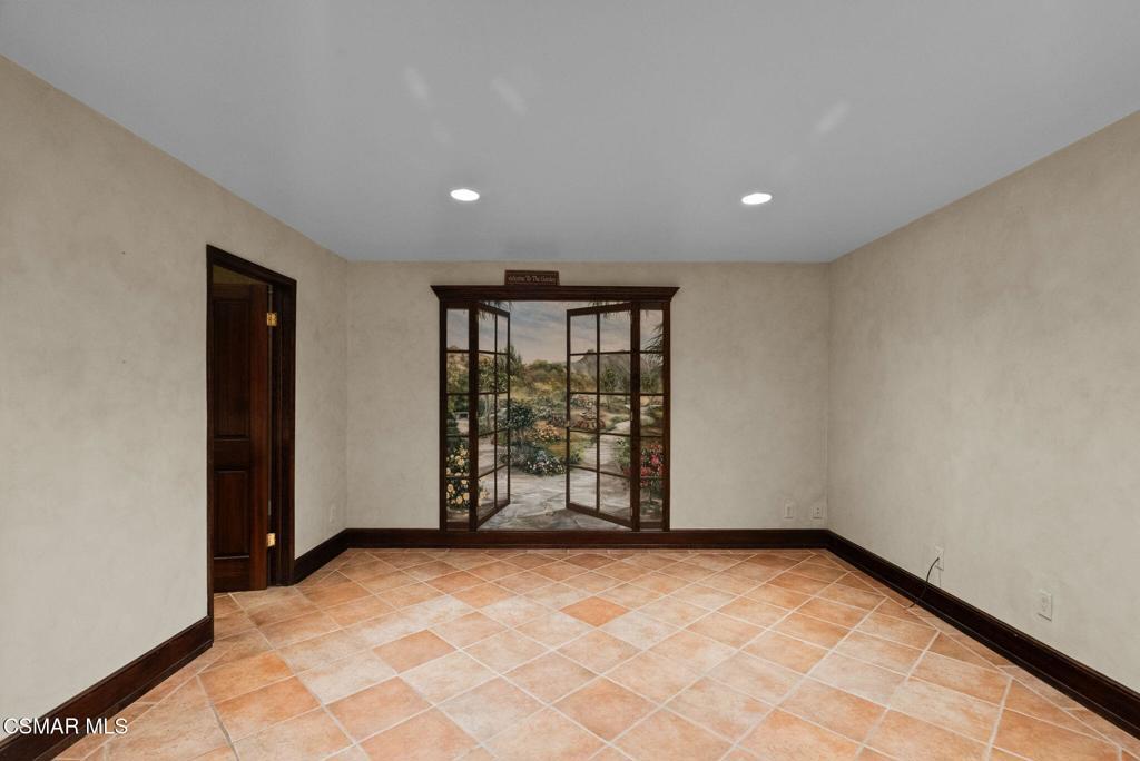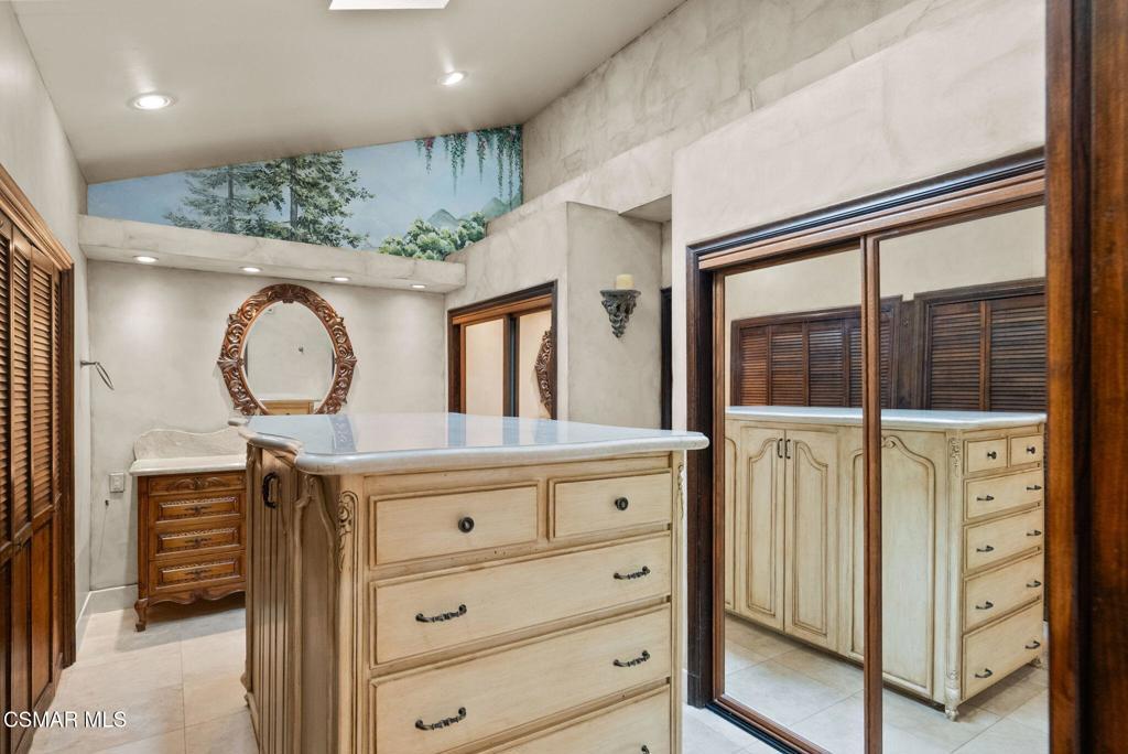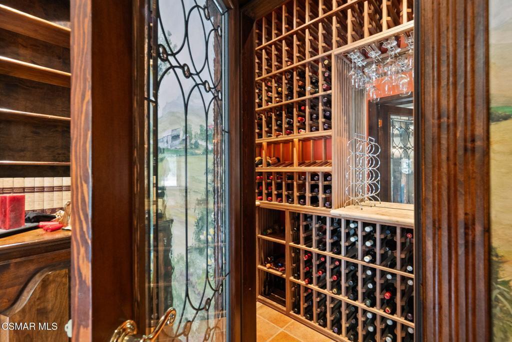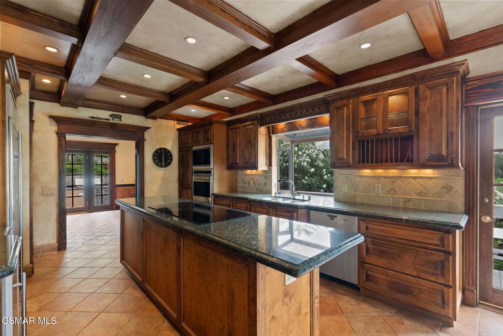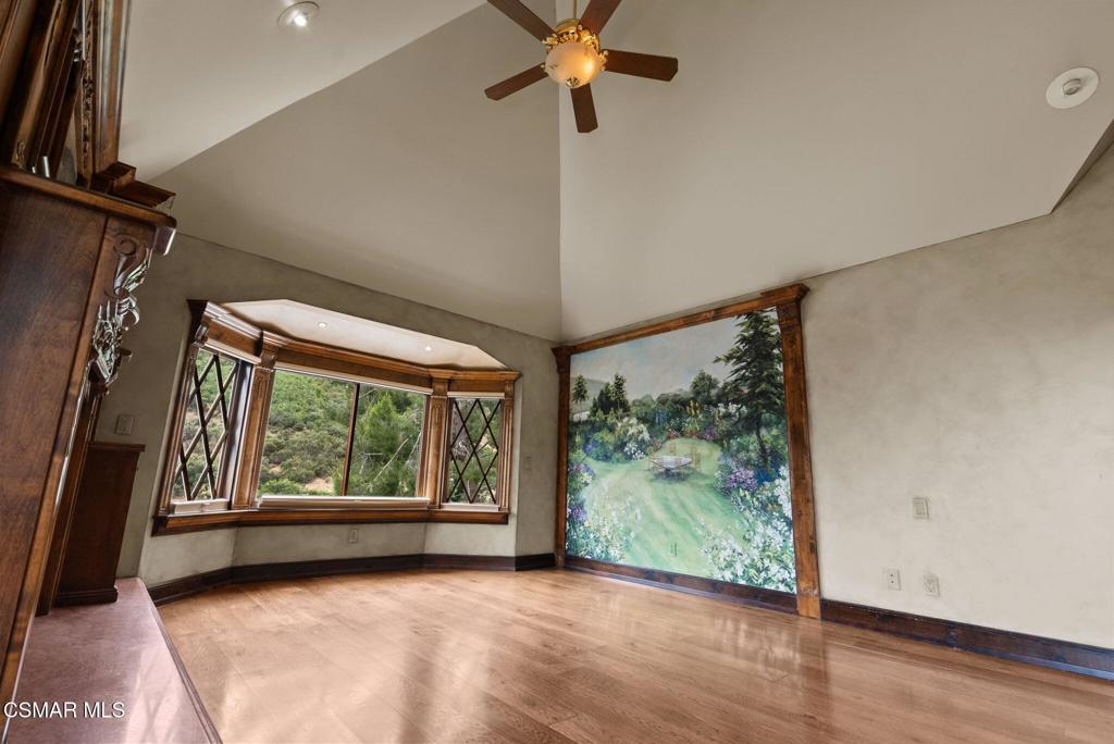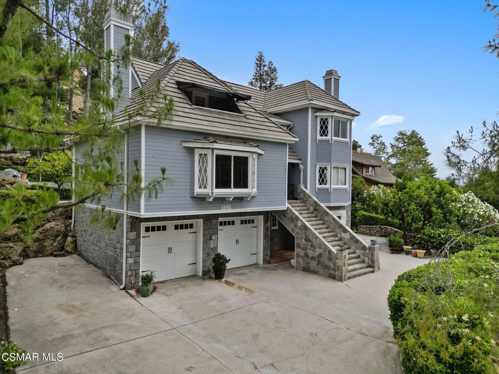Nestled in a private, serene setting where mountain breezes meet timeless craftsmanship, this nearly 4,000 sq ft custom-built home offers an extraordinary blend of warmth, tradition, and refined elegance. Featuring rich real wood flooring throughout and handcrafted custom wood cabinetry, the home is filled with soul and story, including hand-painted murals inspired by a family farm in Norway that grace the walls with artistry and heart. With 4 bedrooms and 3.5 bathrooms, the spacious layout is designed for both luxurious comfort and everyday functionality. The primary suite is a true retreat, boasting soaring ceilings, stunning mountain views, four closets, including a center island wardrobe station and a spa-inspired bathroom with marble countertops, soaking tub, and a steam shower. The lowest level offers a private suite with separate entrance, bedroom, bathroom, living space, and laundry, ideal for guests, multigenerational living, or a private office. Large secondary bedrooms include one with a private balcony and another with access to a shared, well-appointed bath. Three unique fireplaces anchor the primary suite, family room, and formal living room, while custom built-ins and stainless-steel appliances complement the gourmet kitchen and formal dining space, which also features a wine refrigerator and a substantial wine locker. Nearly every window frames panoramic mountain views, and the property invites outdoor exploration with meandering garden paths, custom stone hardscape, fruit trees, sitting areas, a koi pond, and even a small private forest. Direct access to the back entrance of Malibu Creek State Park makes hiking and adventure effortless. Located in an award-winning school district, just minutes from the freeway and beaches, this home feels a world away yet it's incredibly close to everything. A rare opportunity to live in a place that feels both grounded in nature and elevated in design.