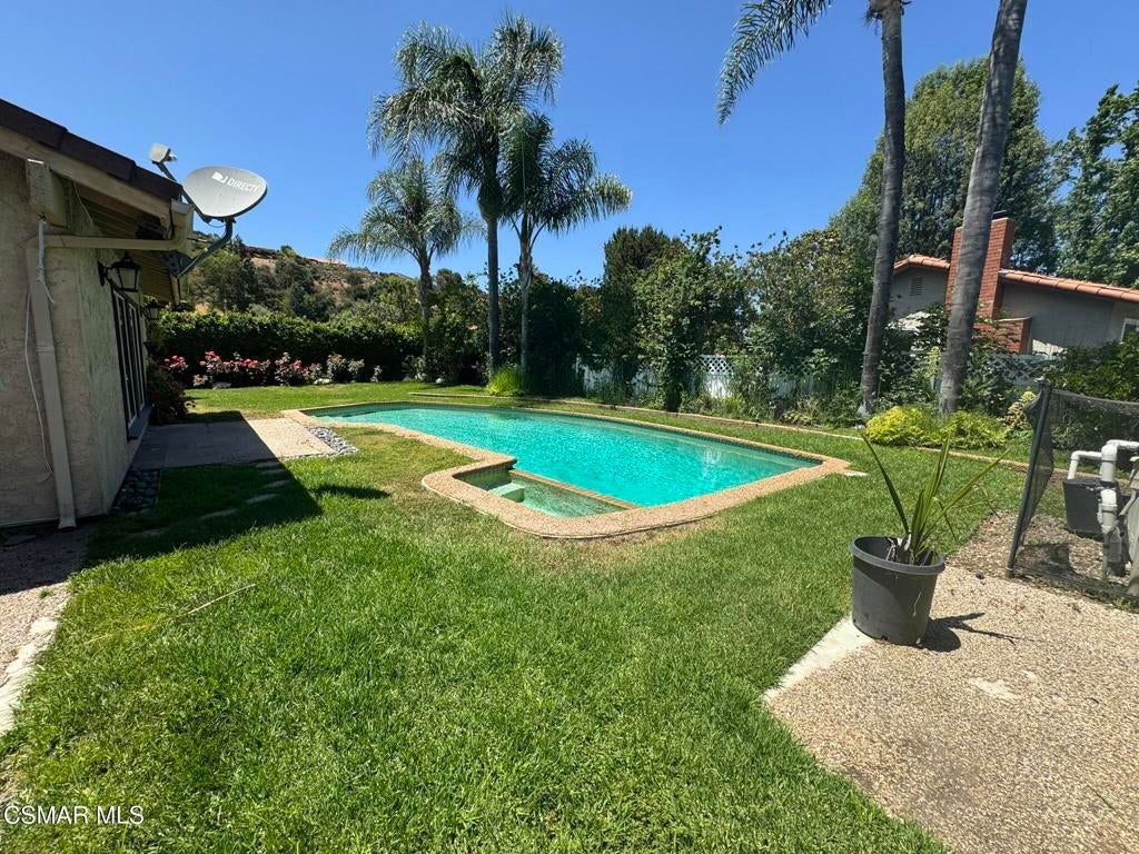Contact us to inquire about our Move-In Incentive Program. Single story pool home in highly desired neighborhood of Southshore Hills in Westlake Village. 3 bedrooms, 2 bath, fantastic floor plan featuring high ceilings and lots of natural light. Immense living room with a brick fireplace (perfect for cozy nights), built in shelves/cabinets (perfect for storage, small library or decor) with a slider to access the large backyard. The large kitchen with wood cabinets, sparkling countertops, new stovetop, new double oven new dishwasher and new microwave. Recessed lighting and a skylight. This kitchen is a chef's dream! Down the hallway, 2 spacious bedrooms welcome you on the left side with lots of light and plenty of closet space. To the right, there is the sizable primary bedroom with a large, updated en-suite bathroom with walk-in shower and dual vanities. Roomy walk-in closet with plenty of custom shelves and storage space. At the end of the hall the spacious second bath has been updated with a walk-in shower, dual vanities and updated cabinets. Past the kitchen slider, is the large covered patio (perfect for get-togethers, parties, outside gym or anything you can think up). The large backyard features a sparkling pool and bubbly spa. Plenty of grass space makes this an entertainer's dream or great for families to make memories. Close proximity to restaurants, shopping and award winning schools.